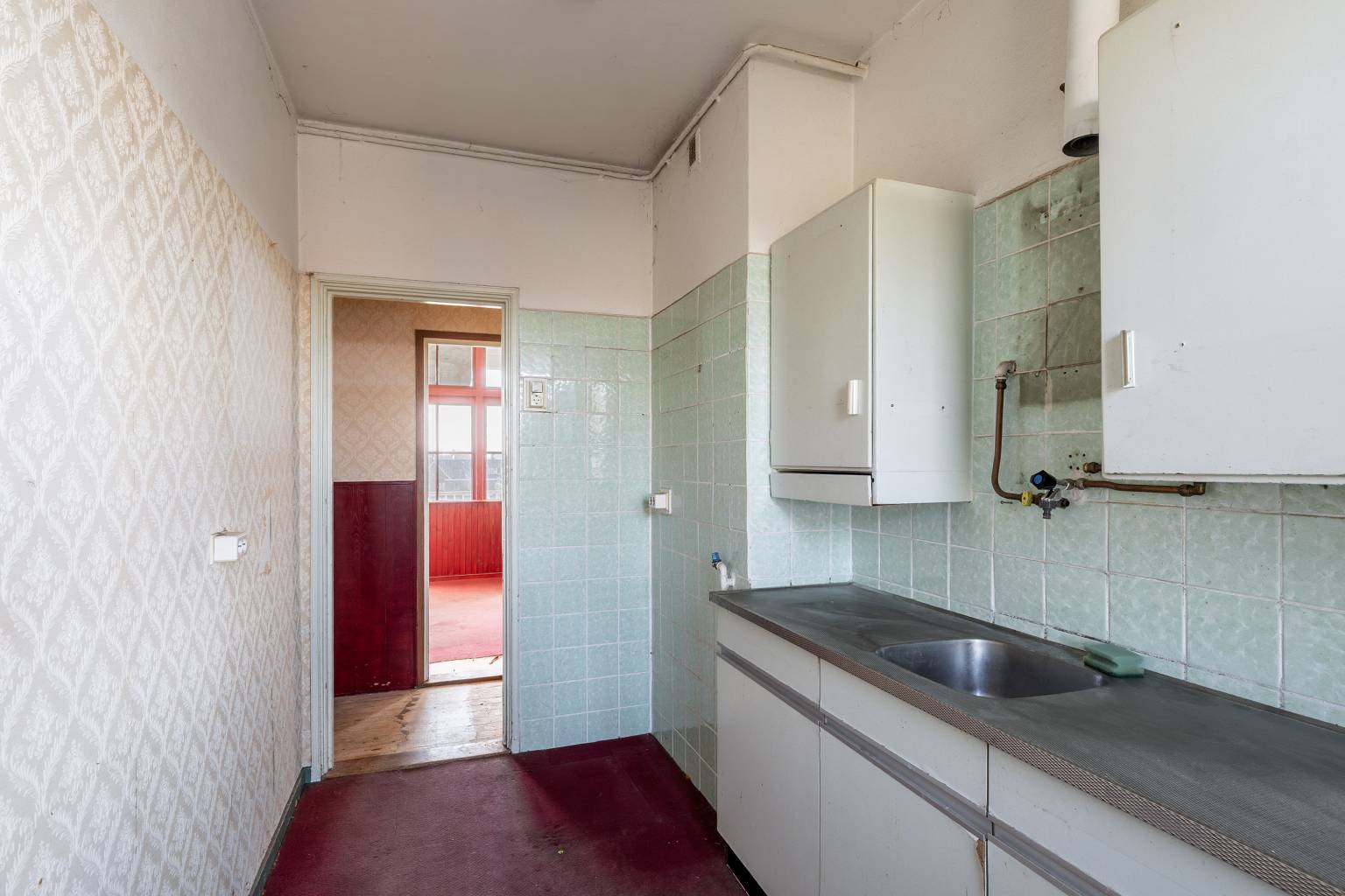 De keuken is voorzien van een recht keukenblok met bovenkasten. Sommige wanden zijn hier halfhoog betegeld en sommige wanden zijn voorzien van behang. Op de vloer ligt vloerbedekking en vanuit de keuken is er toegang tot de badkamer.