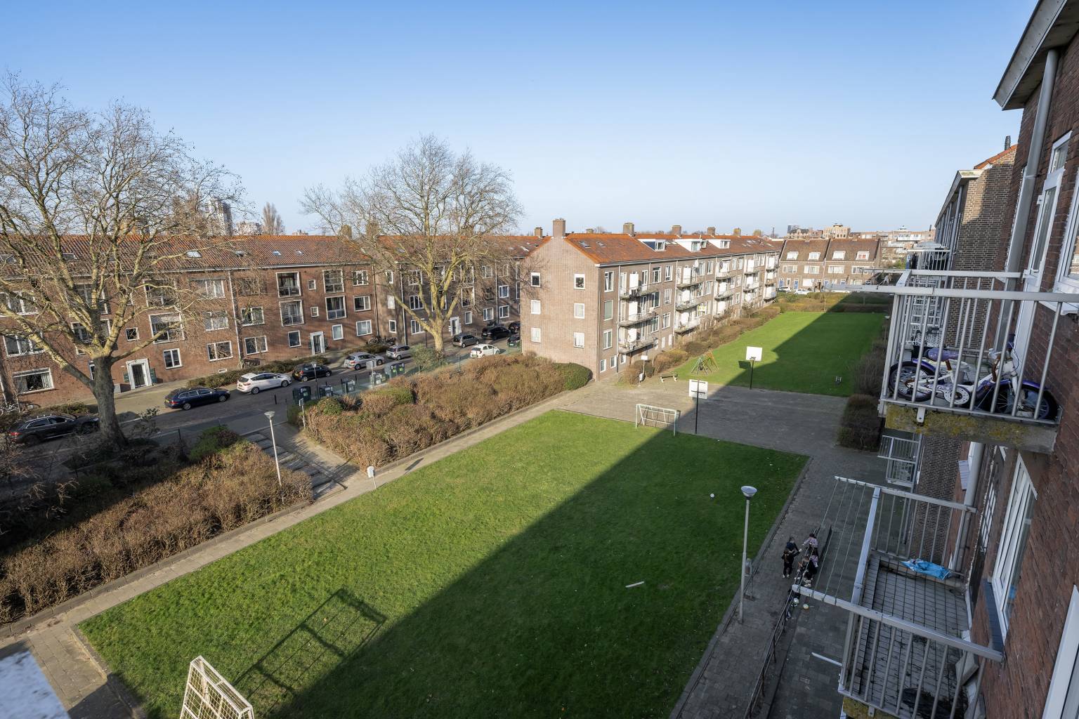 De grotendeels betegelde badkamer is uitgerust met een ruime inloopdouche en heeft een deur naar het balkon aan de achterzijde, dat een rustig zicht biedt over de wijk met het aangrenzende grasveld en speeltoestellen.