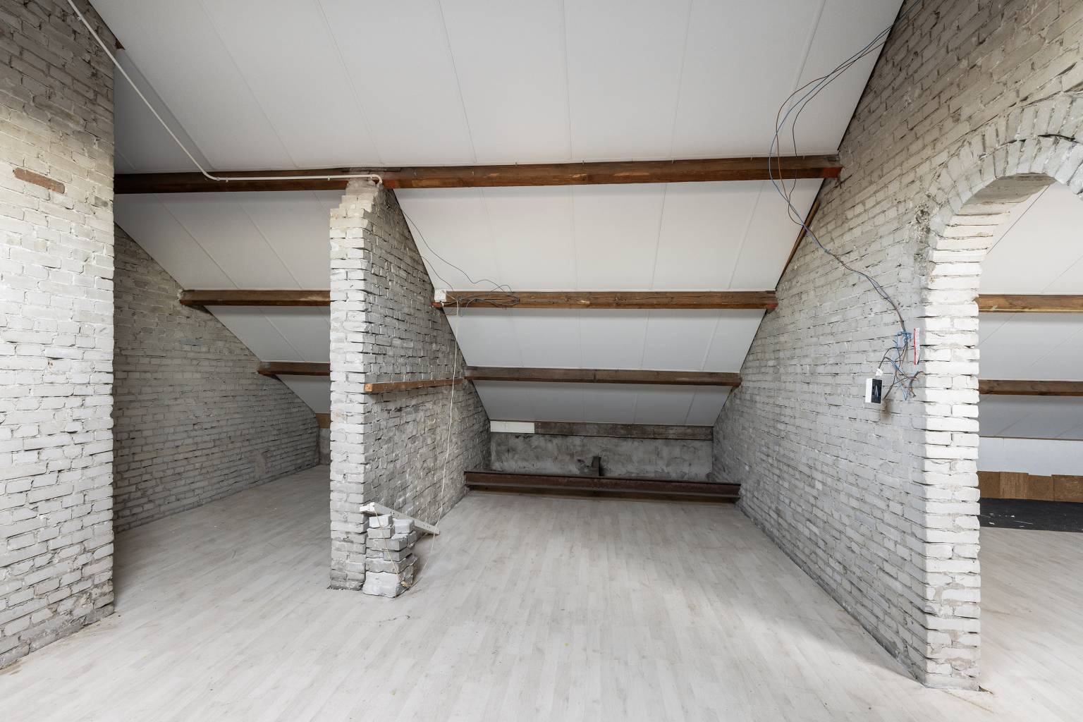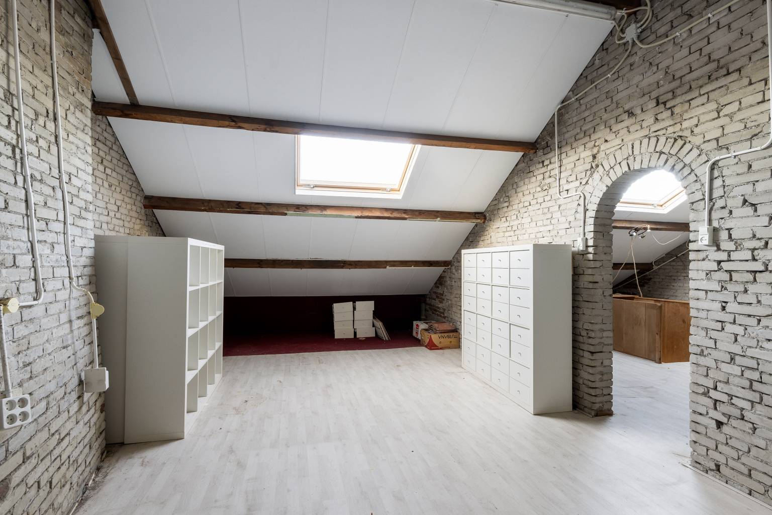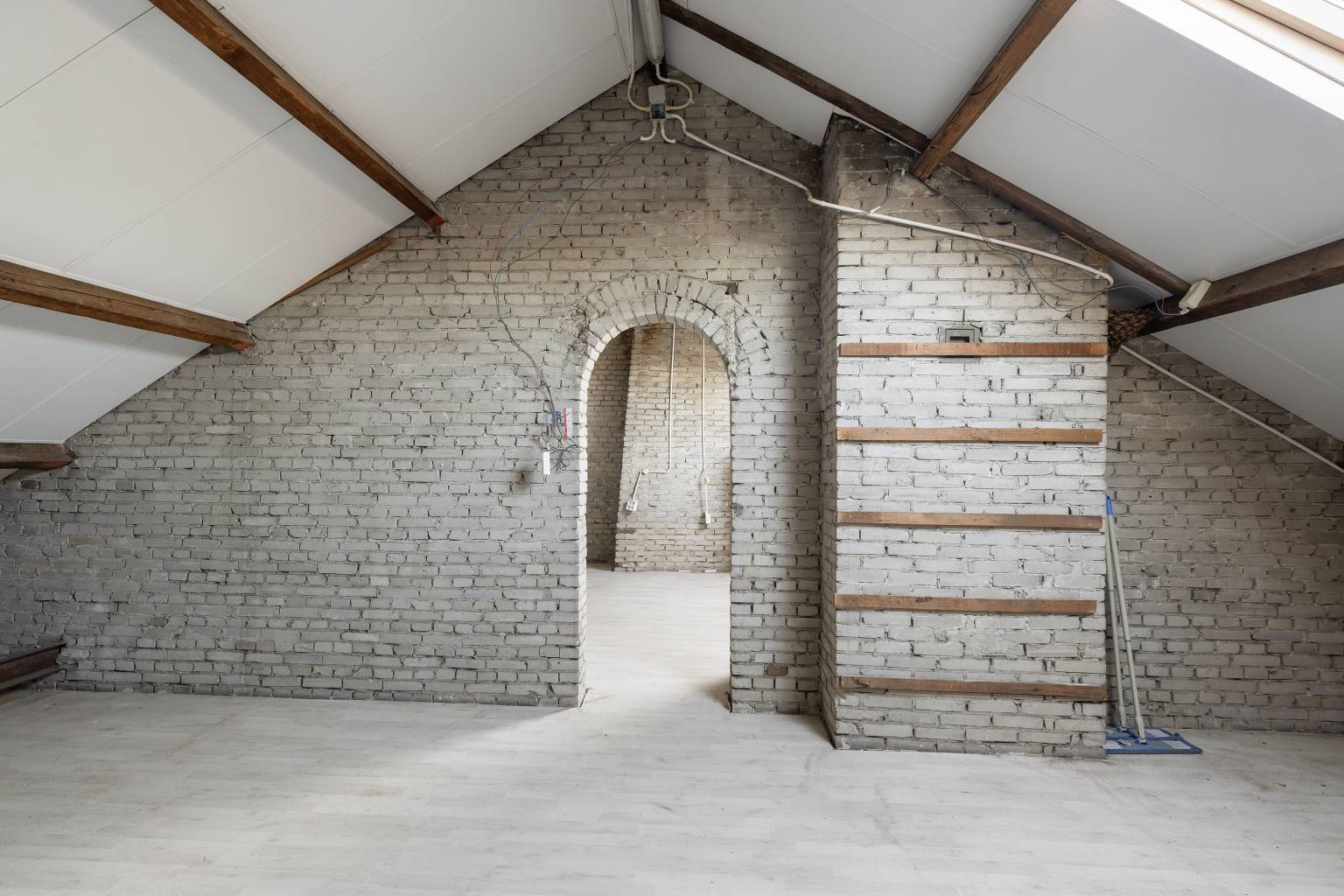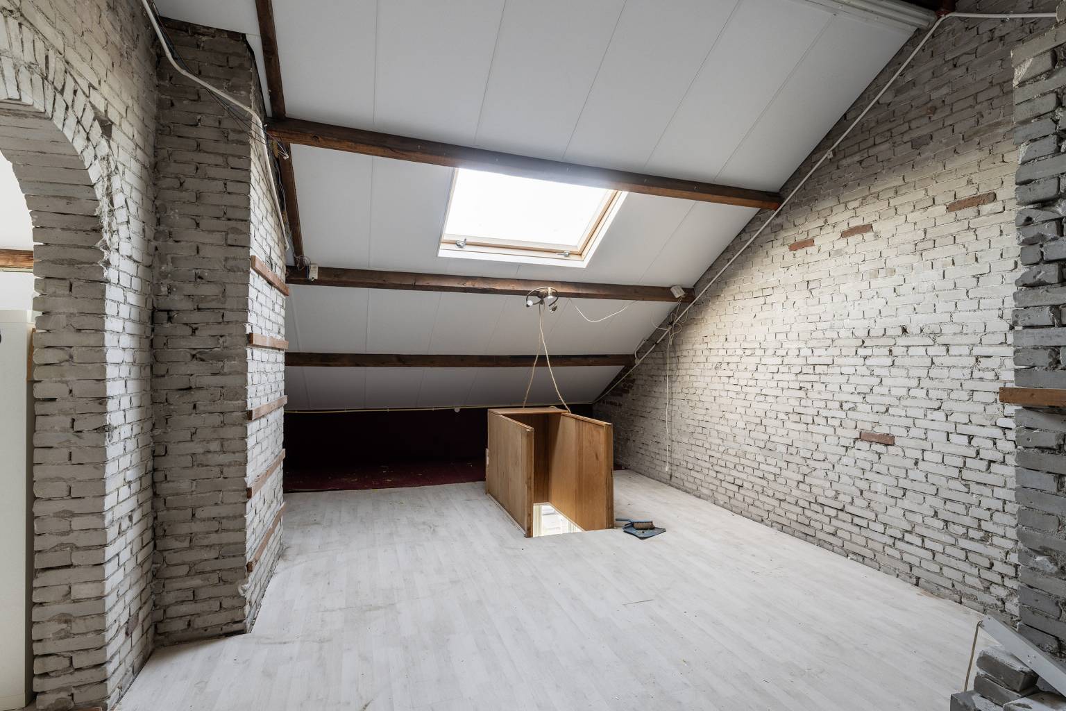Na de trapopgang is de zolder bereikbaar. Deze is opgedeeld in twee ruimtes, die beide zijn voorzien van een dakraam. De wanden zijn onafgewerkt en op de vloer ligt laminaat. Daarnaast is er verlichting en elektra aanwezig.