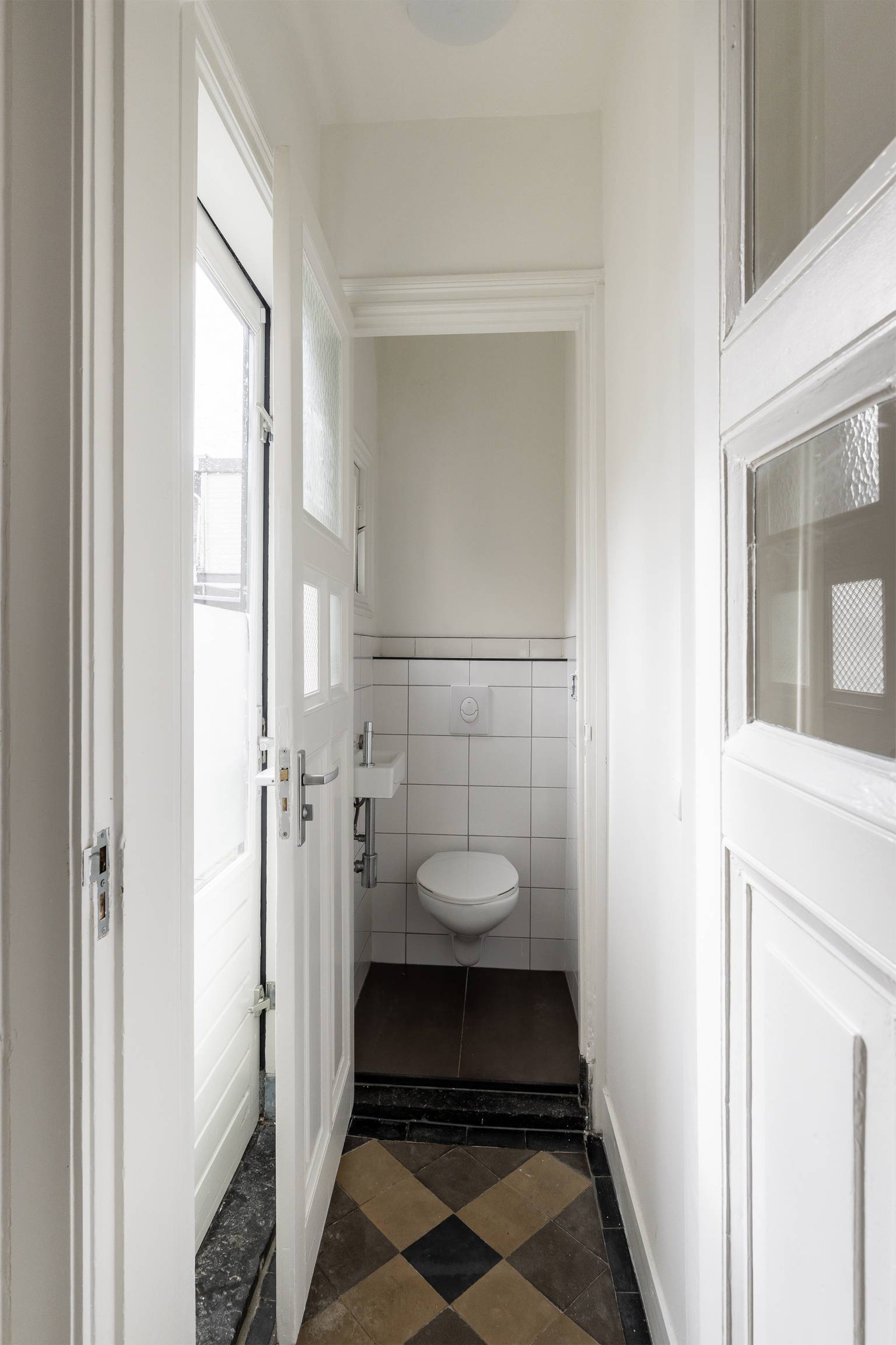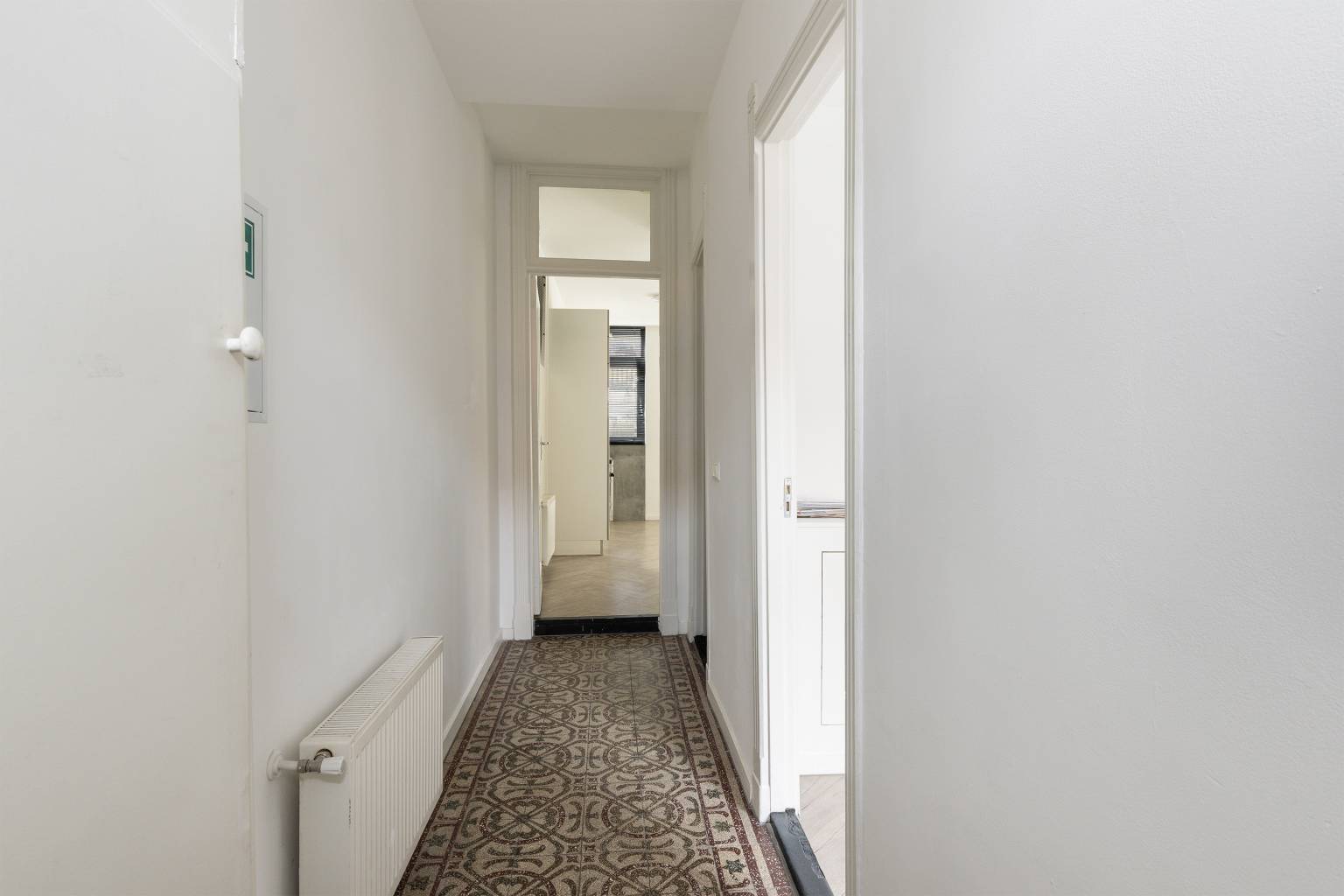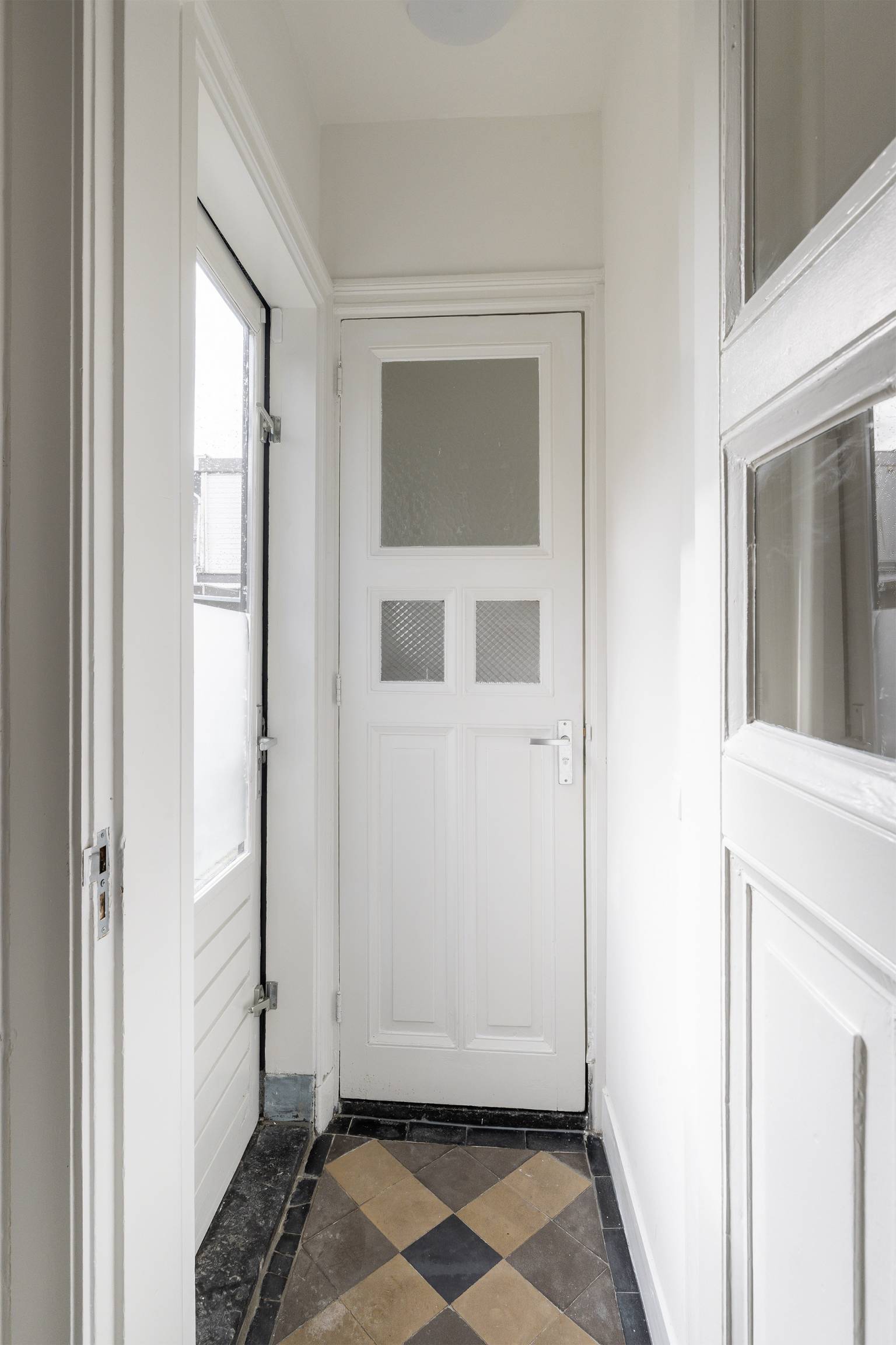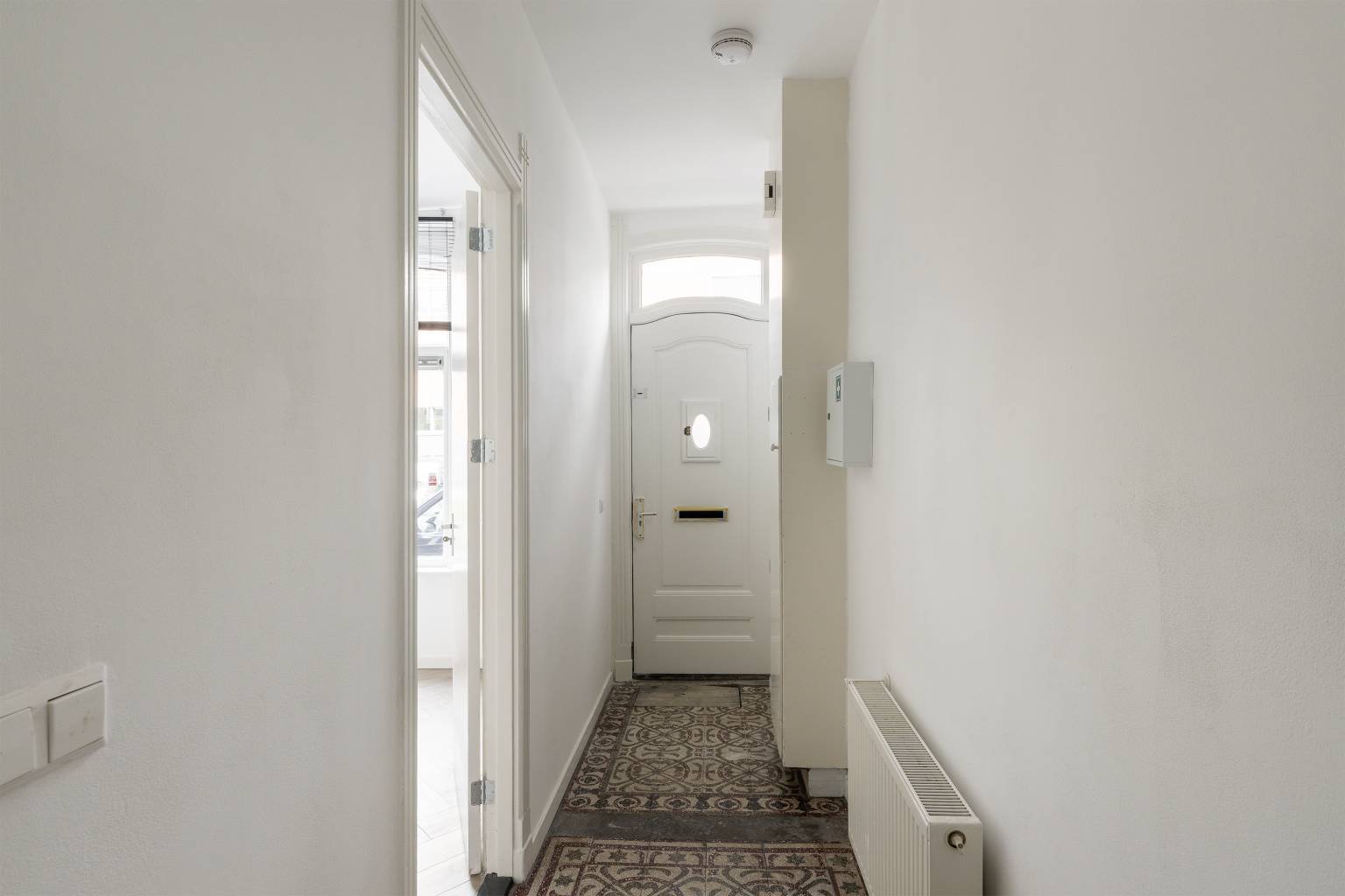 Vanaf de straat is er een directe toegang tot de voordeur, die zorgt voor een binnenkomst in de lange smalle entreehal. Naast de voordeur is er een poort naar de steeg, die toegang geeft tot de achtertuin.