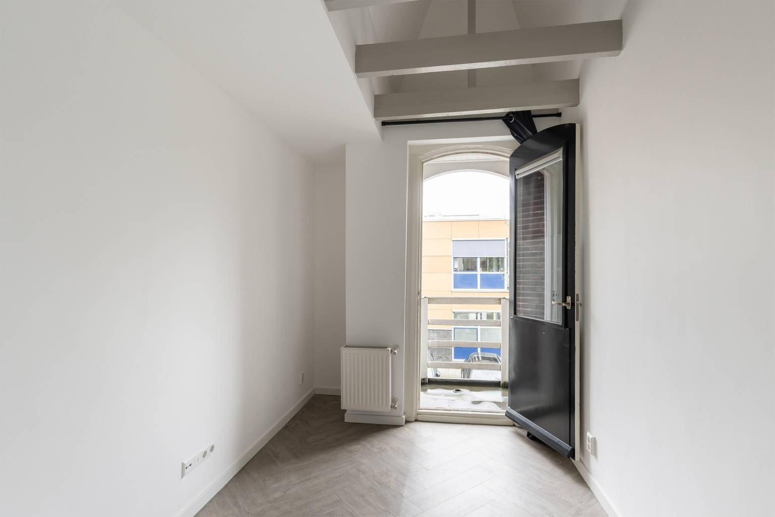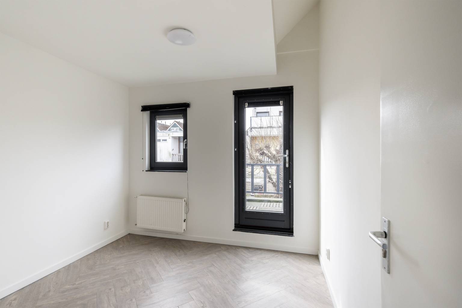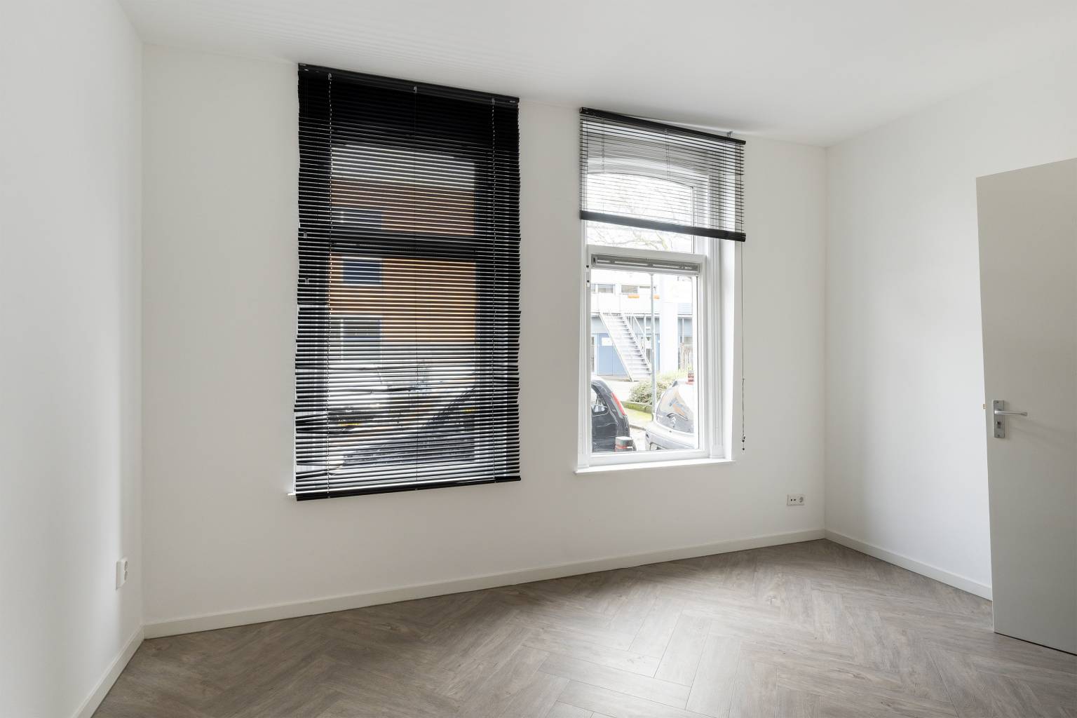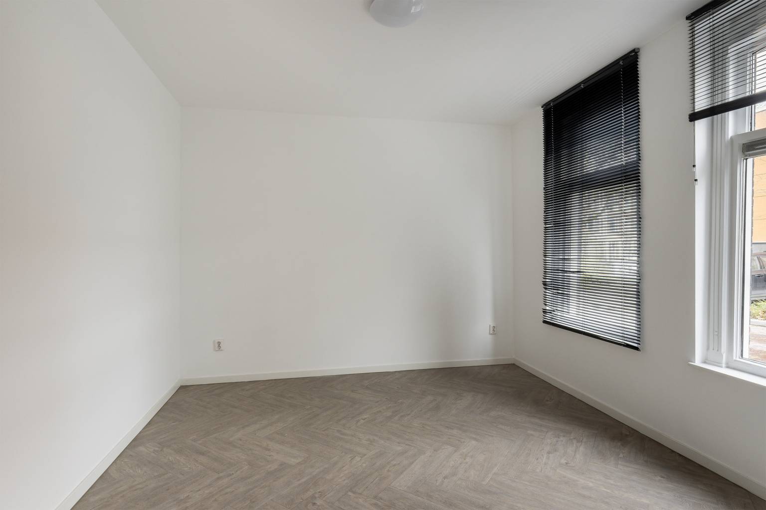 De eerste slaapkamer bevindt zich aan de voorzijde en heeft hoge ramen met zicht over de straat.