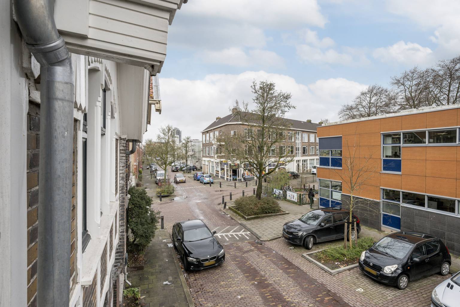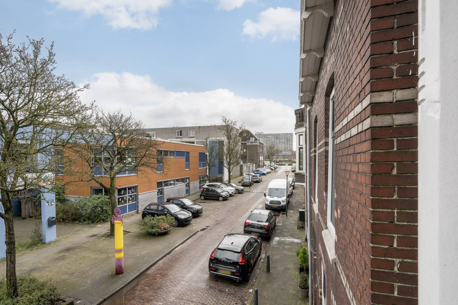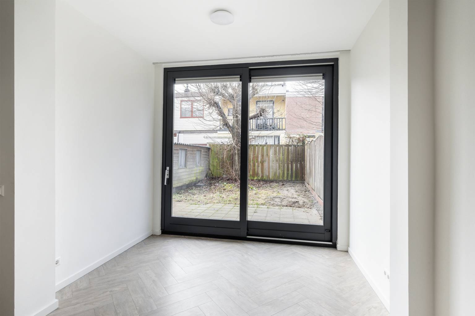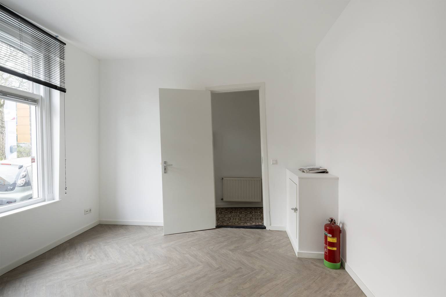 De eerste slaapkamer bevindt zich aan de voorzijde en heeft hoge ramen met zicht over de straat.