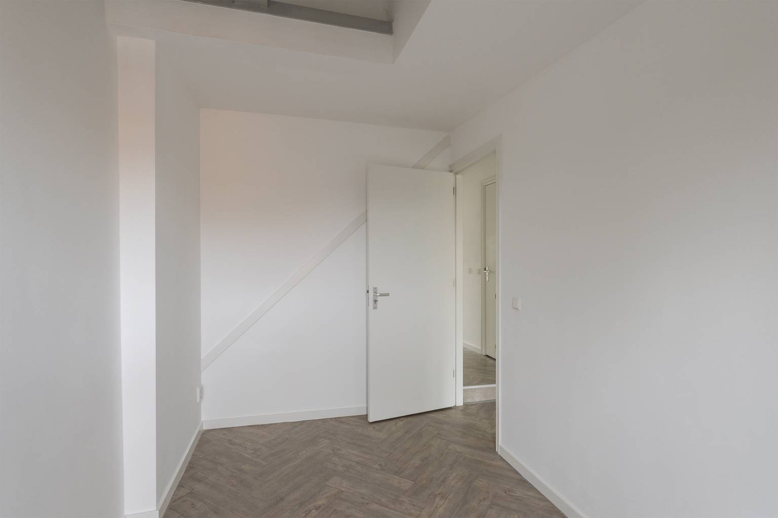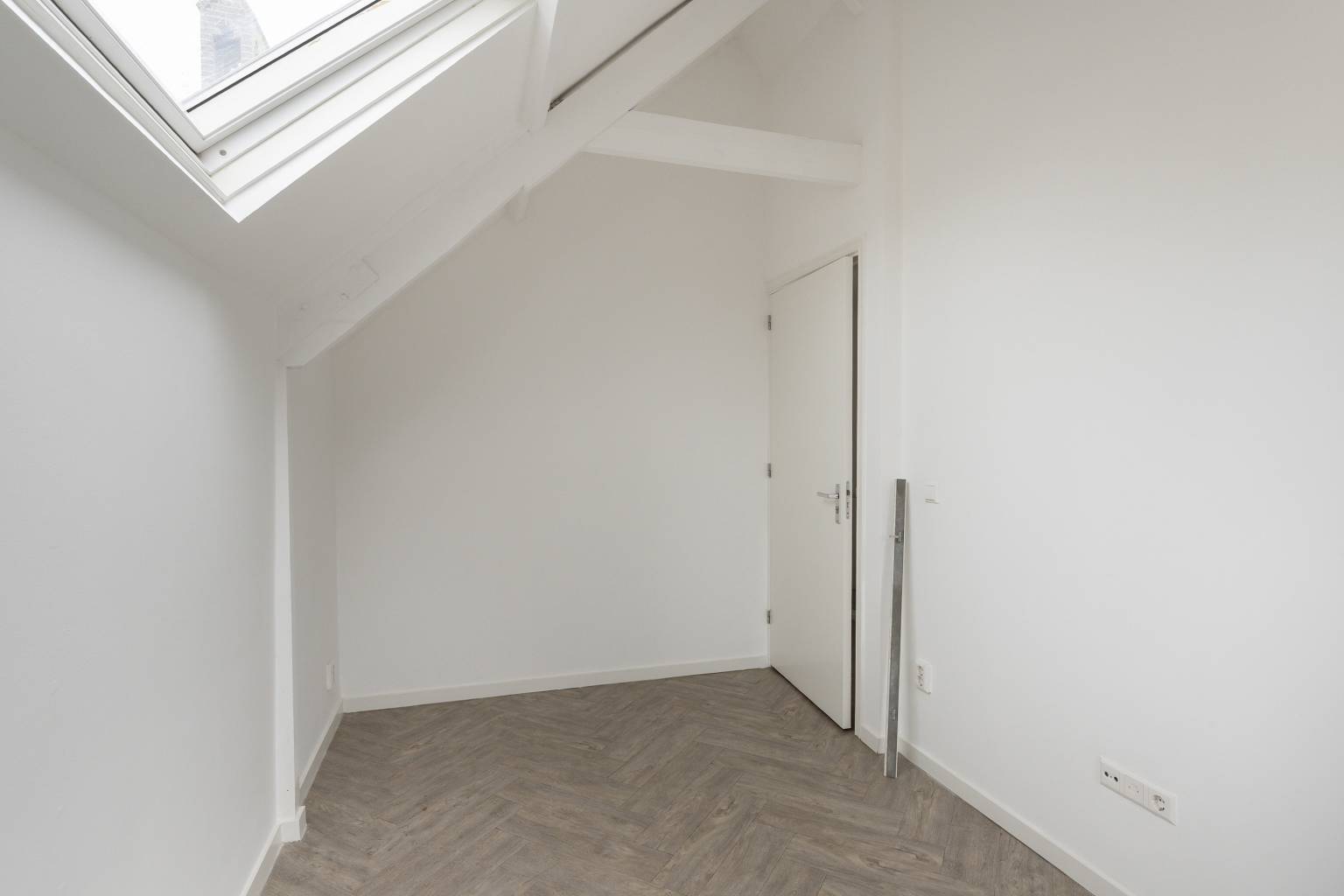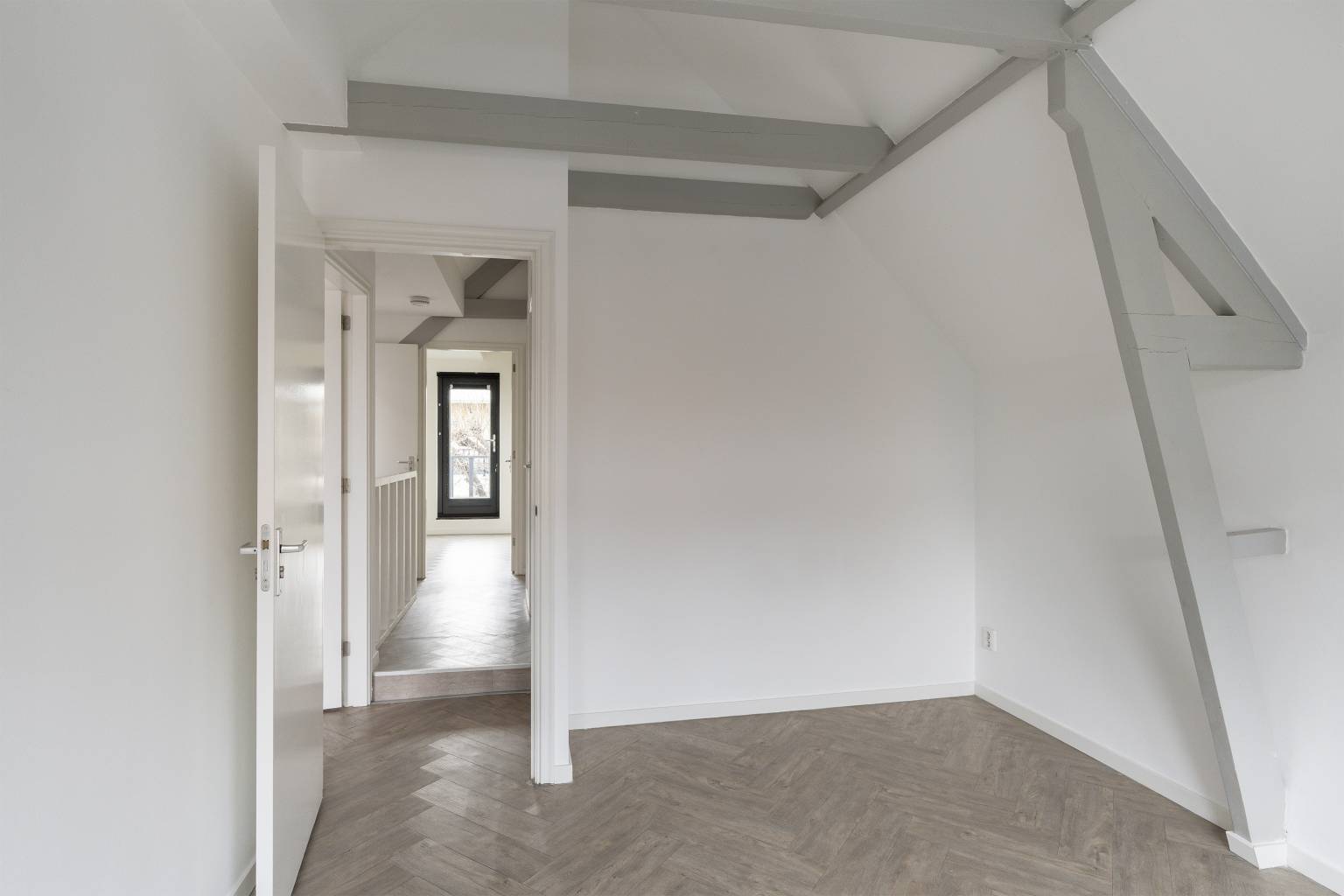 De eerste twee slaapkamers op deze verdieping zijn gelegen aan de voorzijde, waarbij er één slaapkamer toegang heeft tot het kleine balkon. Vanuit beide kamers is er zicht naar de nok, waarbij de balken nog aanwezig zijn.