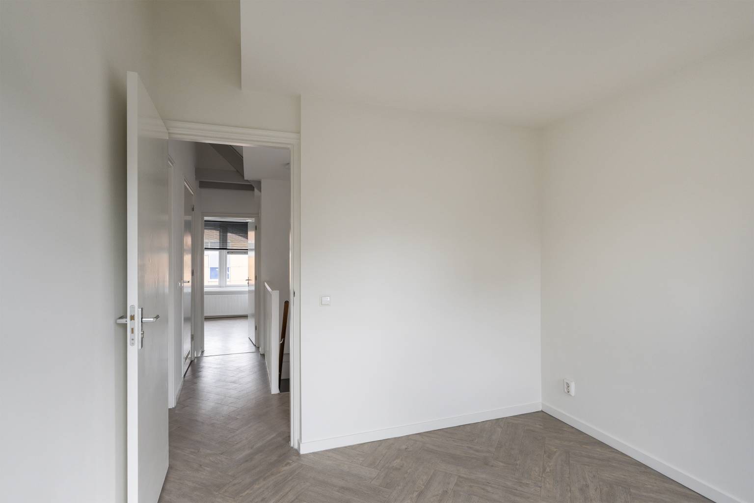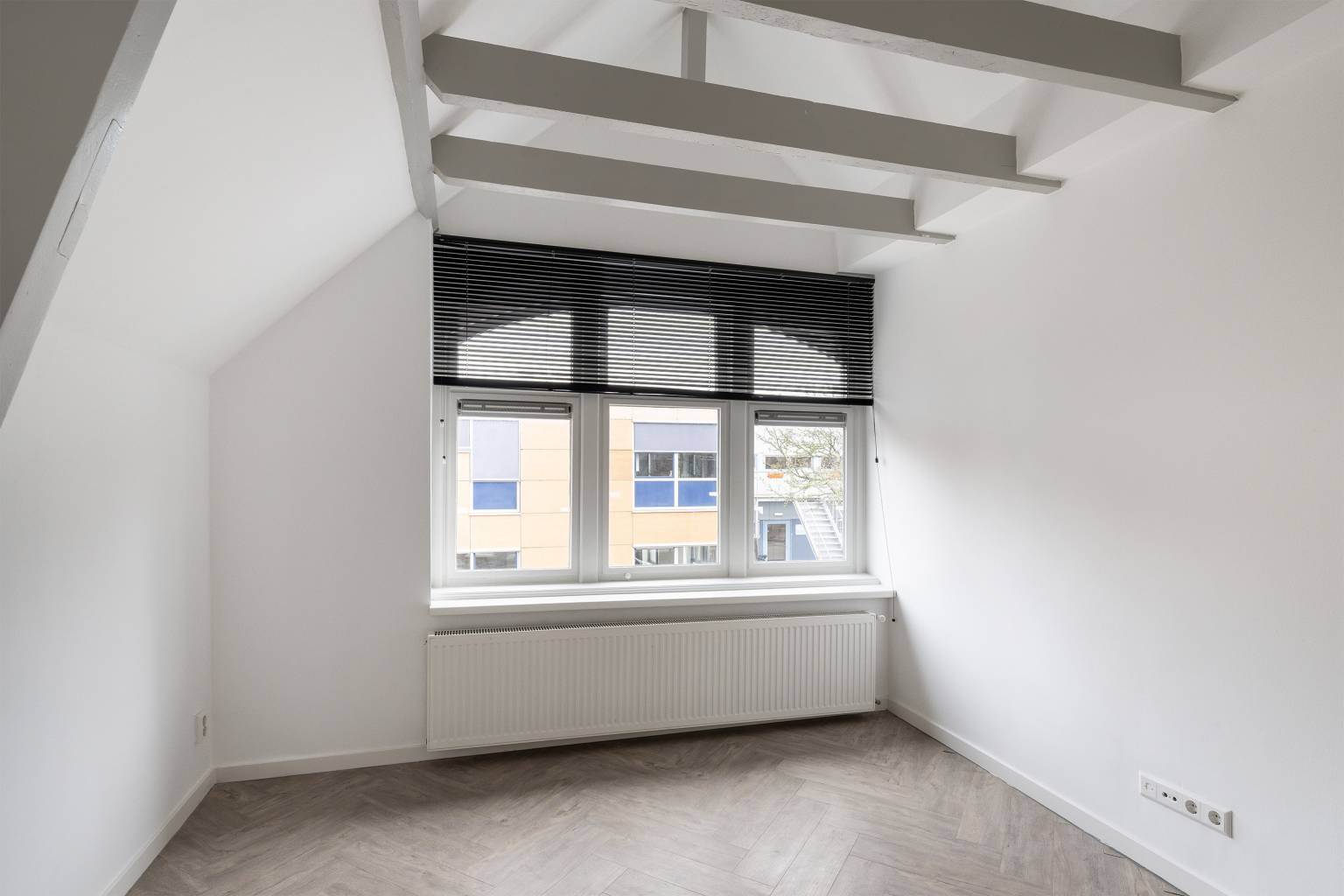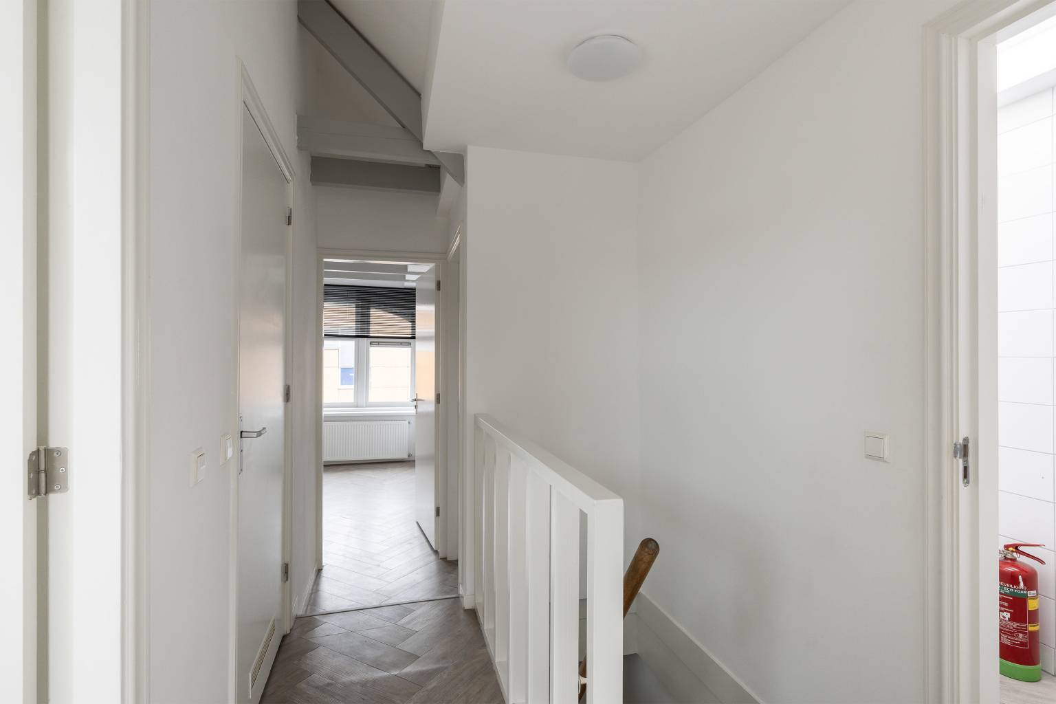 De eerste twee slaapkamers op deze verdieping zijn gelegen aan de voorzijde, waarbij er één slaapkamer toegang heeft tot het kleine balkon. Vanuit beide kamers is er zicht naar de nok, waarbij de balken nog aanwezig zijn.