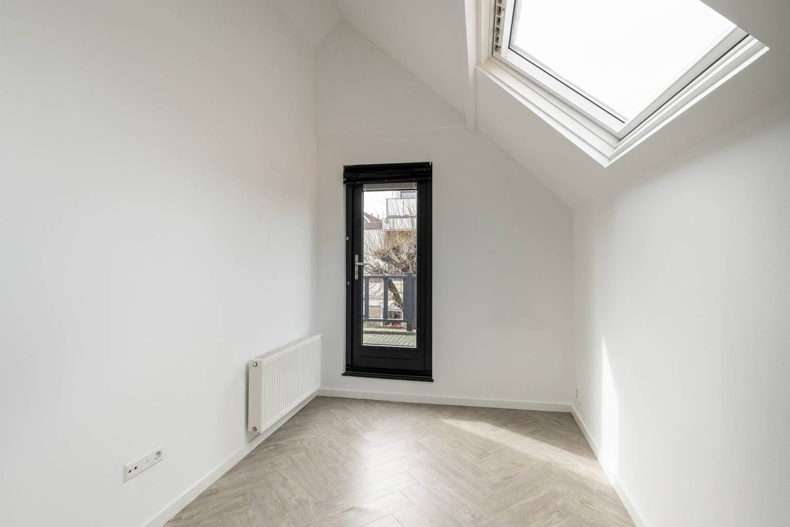 De overige twee slaapkamers bevinden zich aan de achterzijde en geven allebei toegang tot het ruime terras, dat uitzicht biedt over de tuin. Daarnaast is één van de slaapkamers ook voorzien van een dakraam in de schuine kap.
