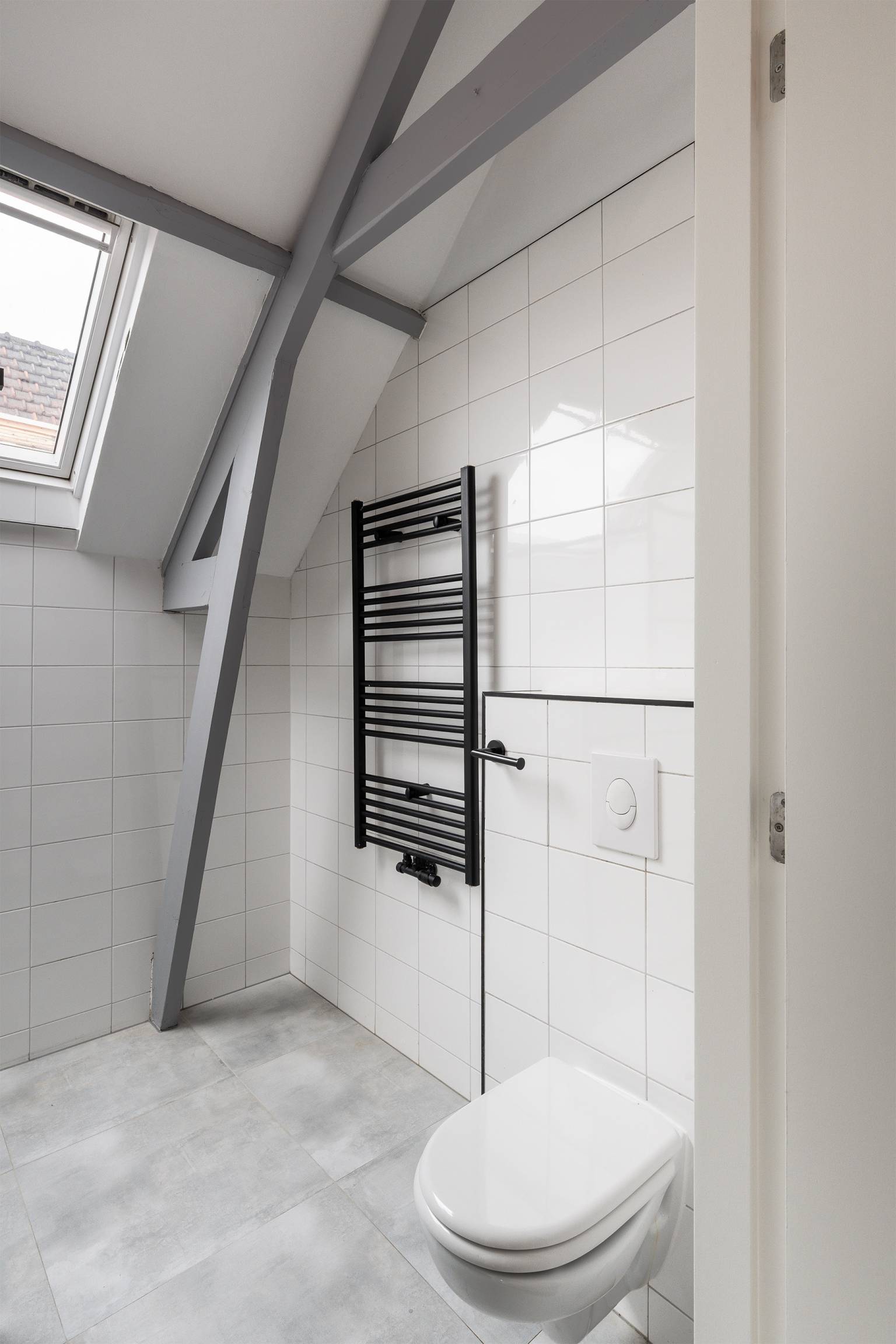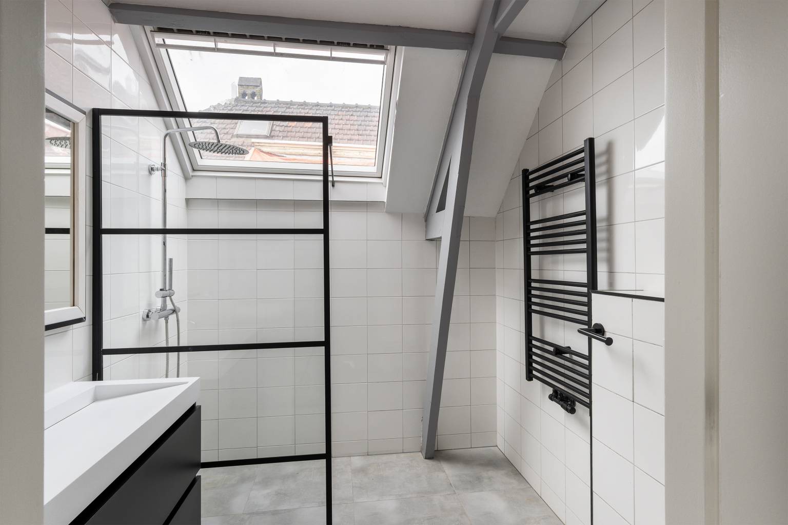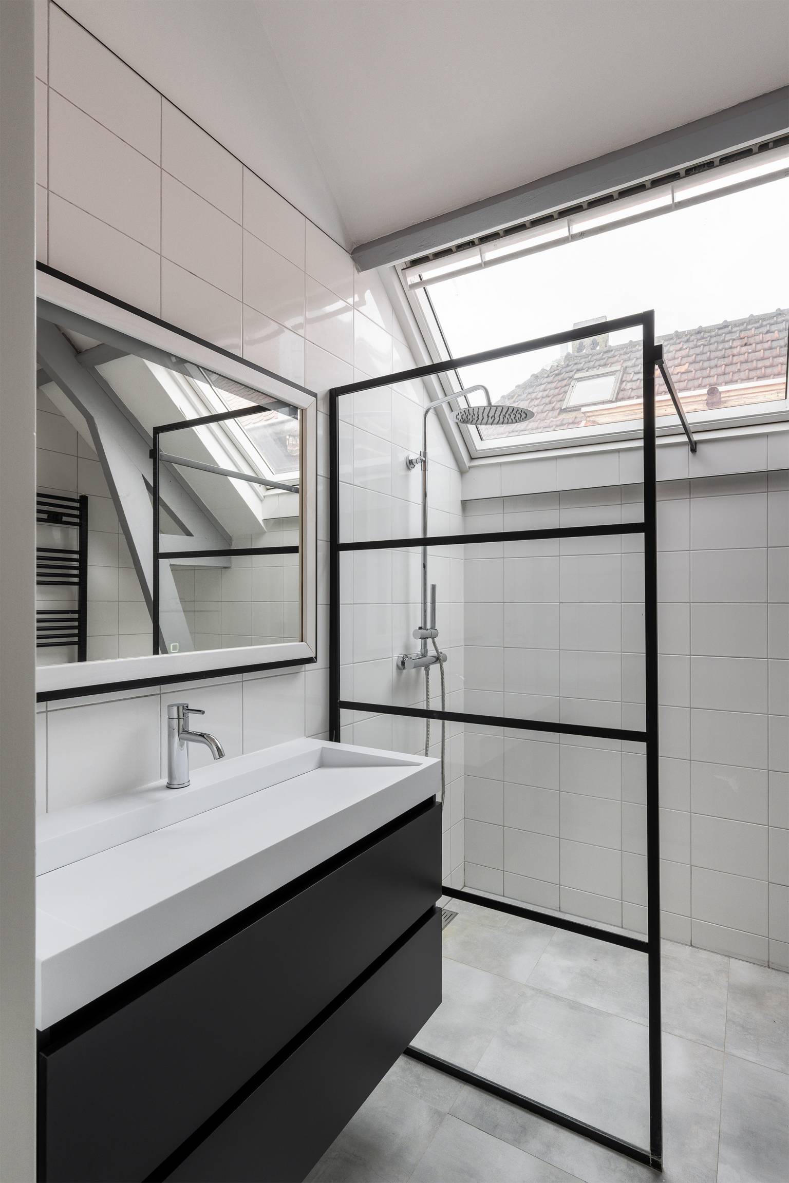 De inpandige badkamer is grotendeels betegeld en uitgerust met een inloopdouche, een toilet en een wastafelmeubel met daarboven een spiegel. Tevens hangt er een handdoeken radiator en is er een dakraam geplaatst in de schuine kap.