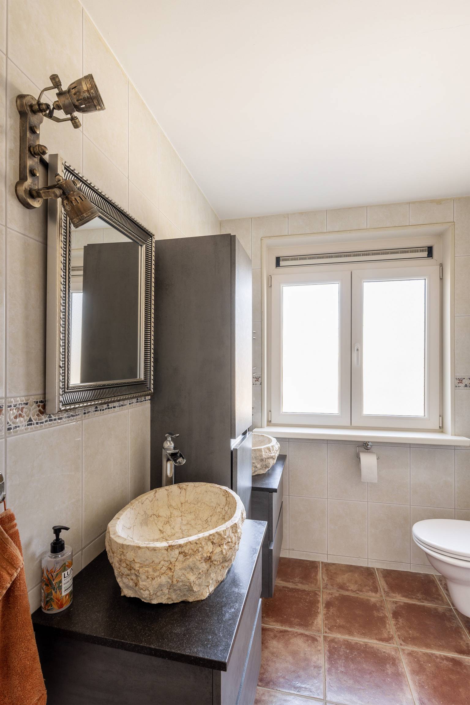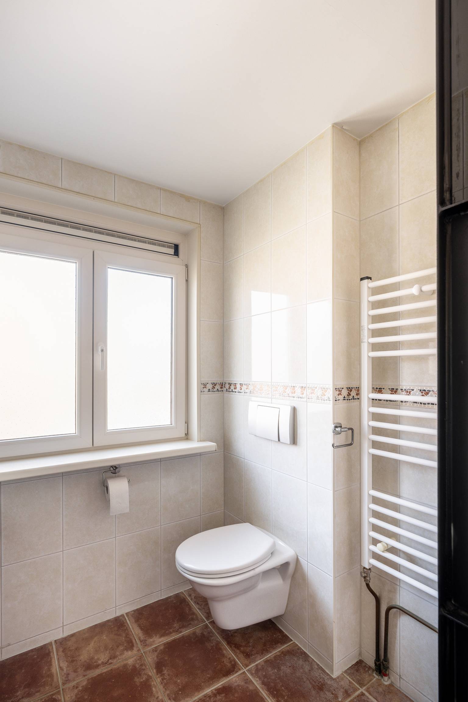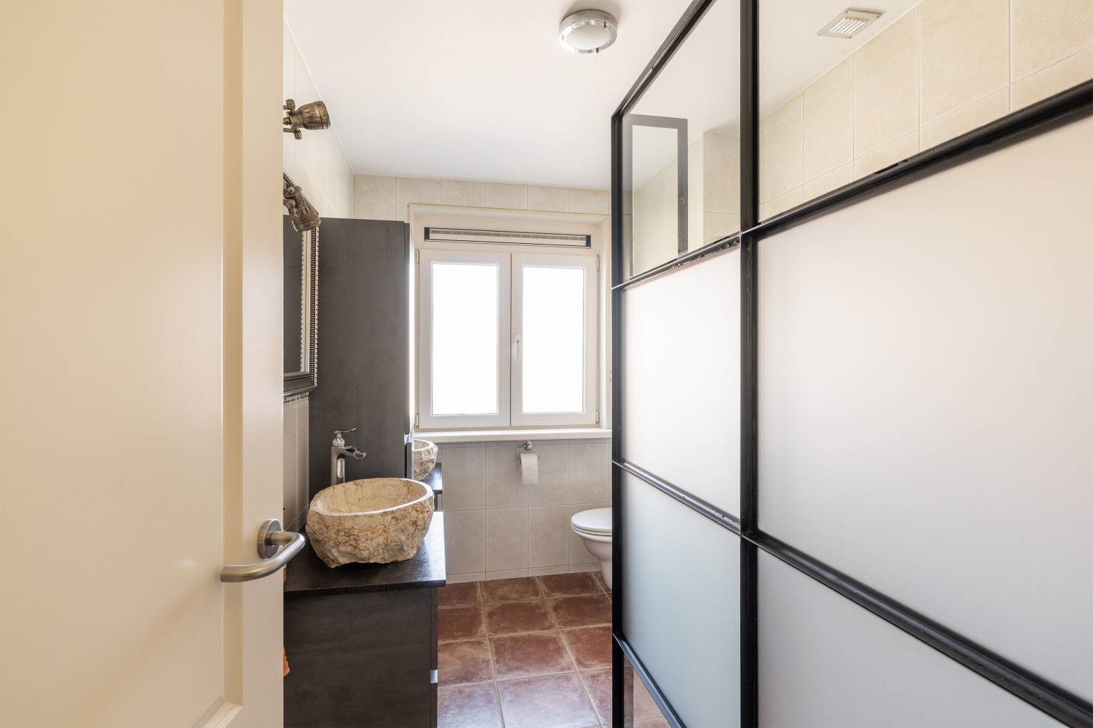 De volledig betegelde badkamer is uitgerust met een inloopdouche, een toilet en twee wastafelmeubels met waskommen. Er hangt een handdoeken radiator en er is een te openen raam voor natuurlijke ventilatie.