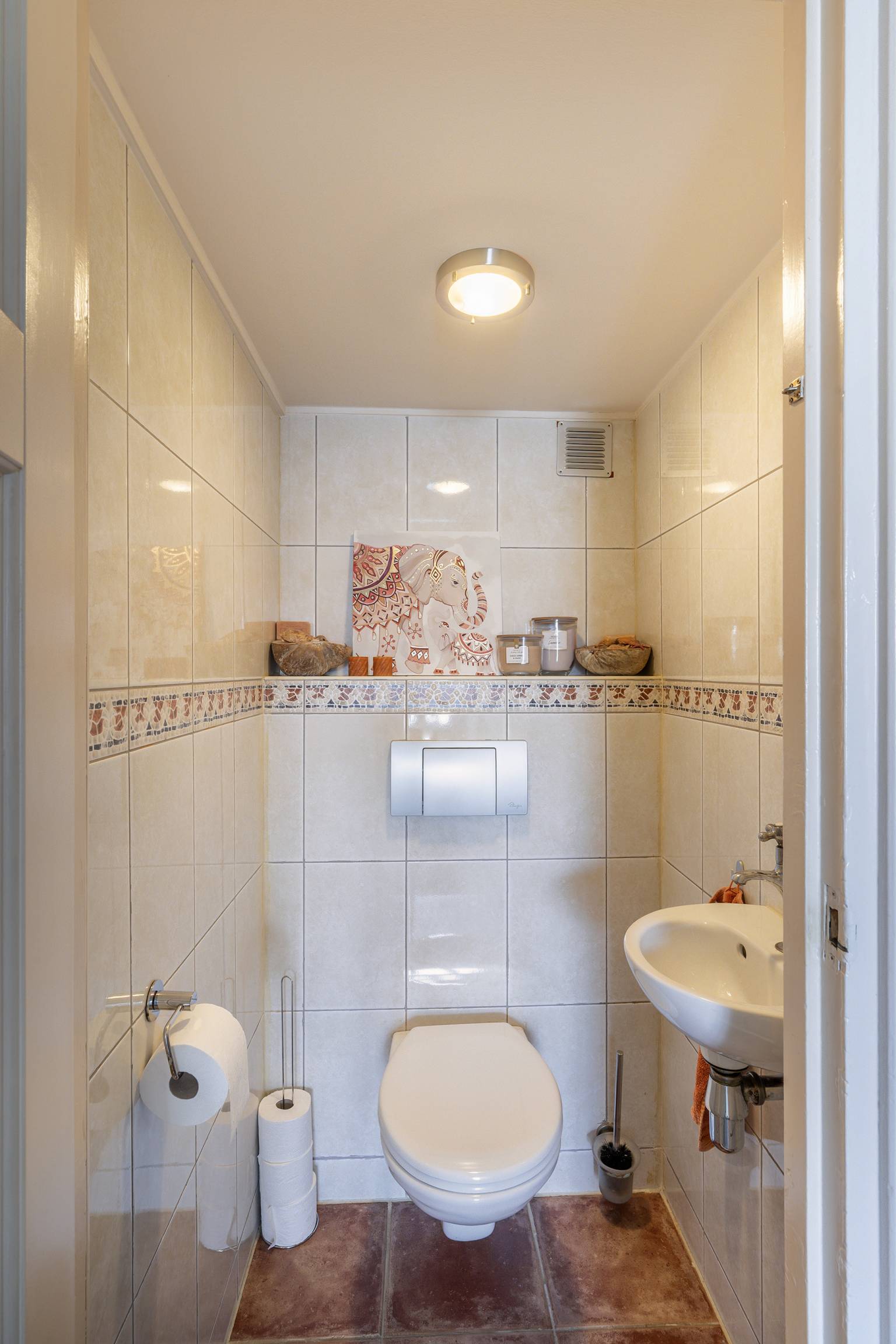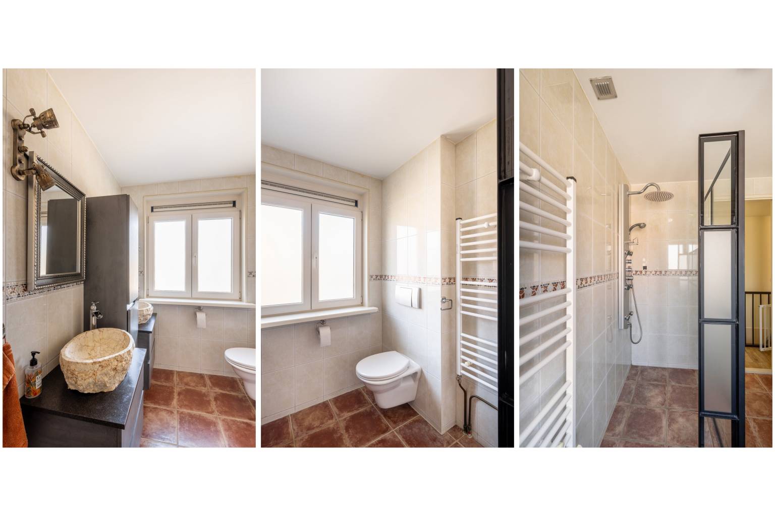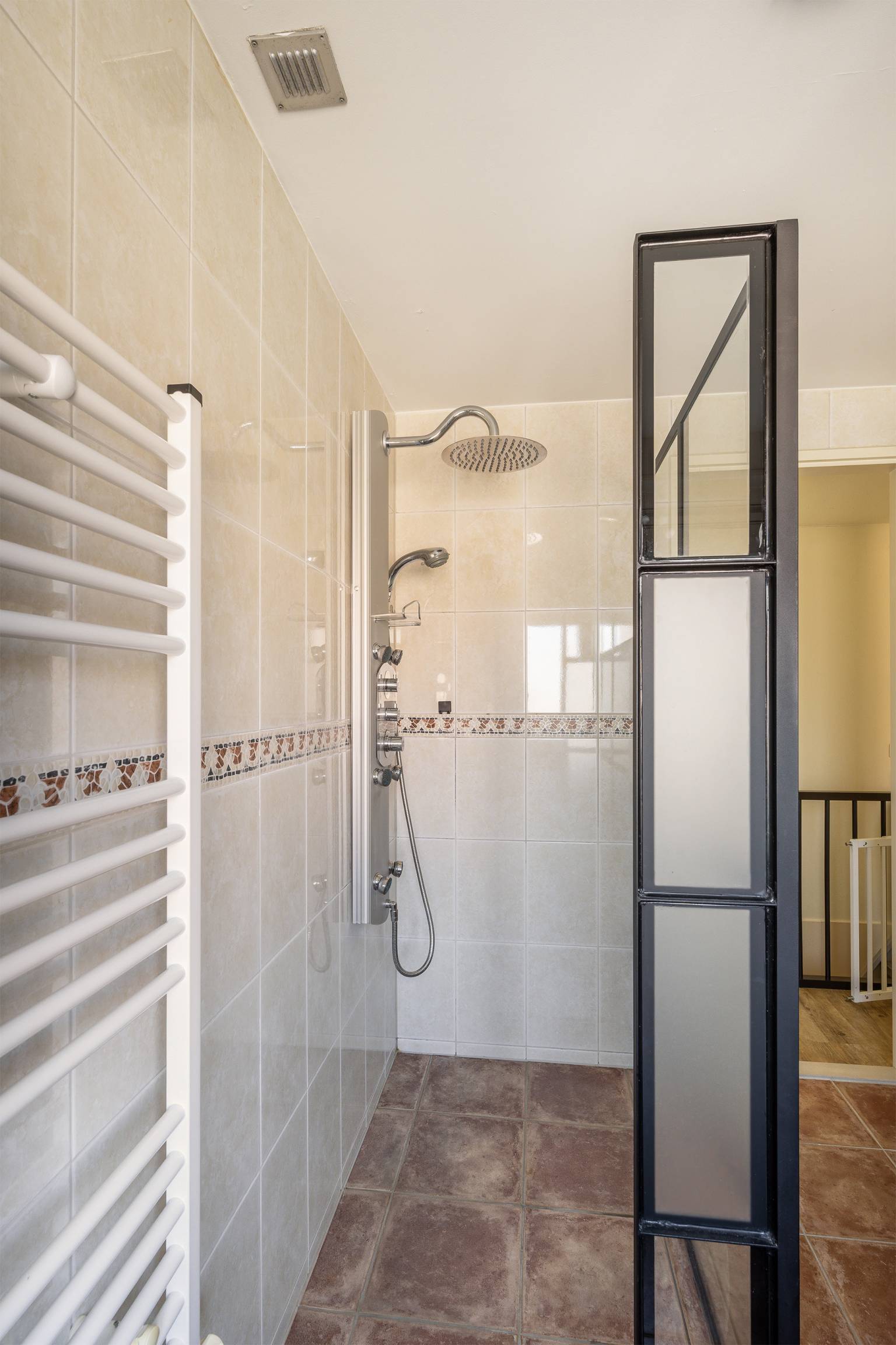 De volledig betegelde badkamer is uitgerust met een inloopdouche, een toilet en twee wastafelmeubels met waskommen. Er hangt een handdoeken radiator en er is een te openen raam voor natuurlijke ventilatie.
