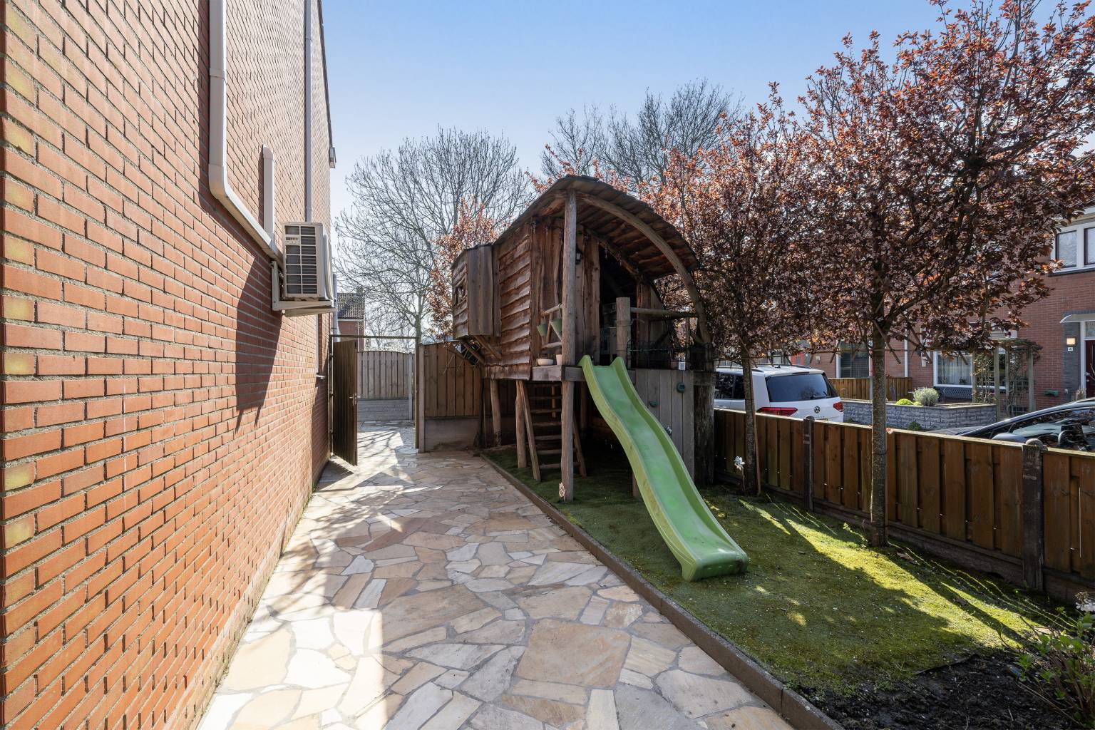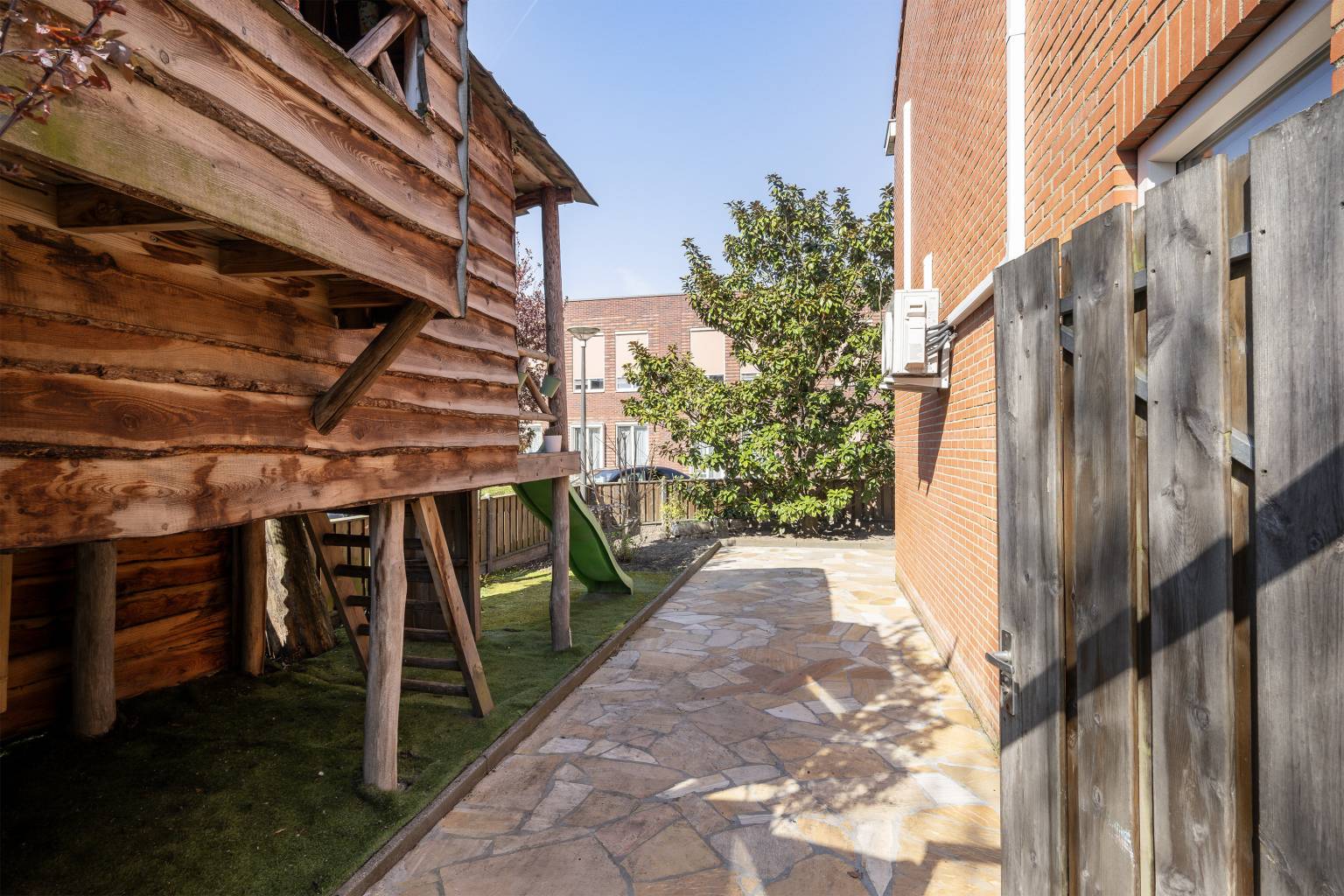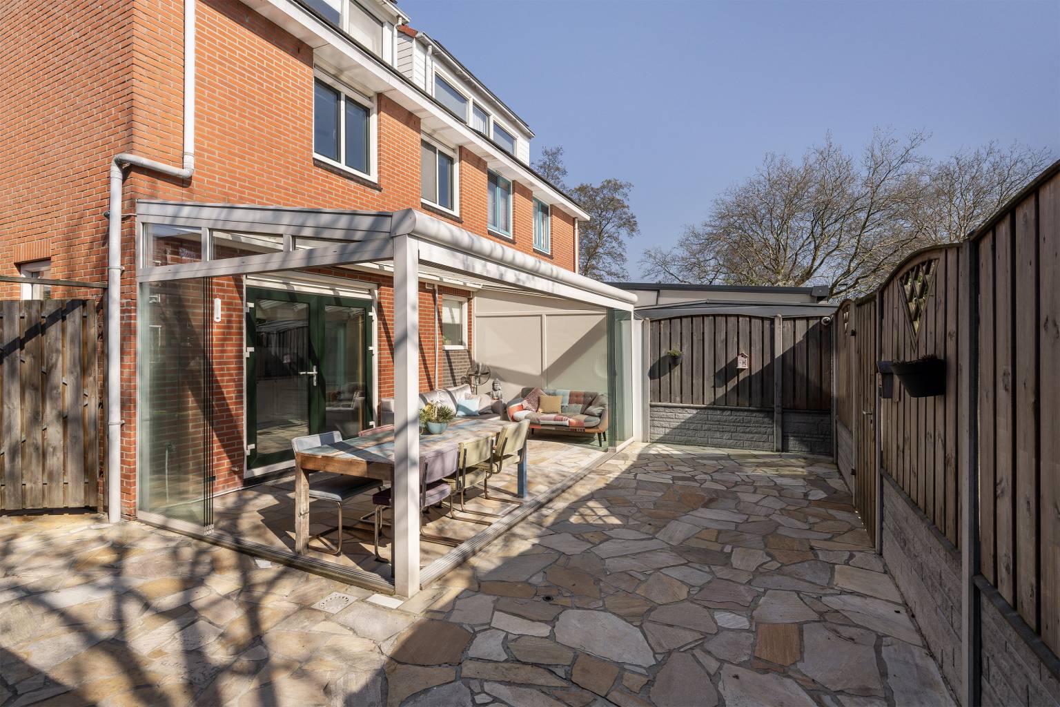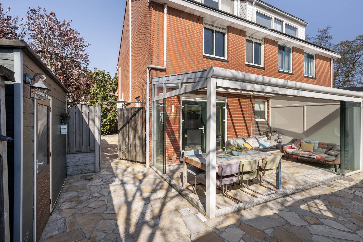De achtertuin biedt veel privacy doordat het volledig is omheind met houten schuttingen en er een poort is naar de zij- en voortuin. Tevens is er een poort naar het achterpad en staat er een houten berging met verlichting en elektra. Naast de berging is een houten overkapping voor het droog opbergen van spullen en de blikvanger van de tuin is toch wel glazen overkapping, die geplaatst is langs de gevel van de woning. Deze is volledig afsluitbaar met glazen panelen, waardoor het hier in alle jaargetijden heerlijk vertoeven is. Ook hangt er een waterkraantje aan de gevel en is de ondergrond van de tuin voorzien van grote mozaïek tegels. De zijtuin staat in verbinding met de voortuin en ook hier is de ondergrond voorzien van grote mozaïek tegels, afgewisseld met kunstgras en een grote stenen border met beplanting. Hier zorgt een lage schutting met mooie bomen voor een afscheiding en is er een poort richting de voordeur. Ook staat er een grote boomhut in de zijtuin, waar kinderen heerlijk kunnen spelen.