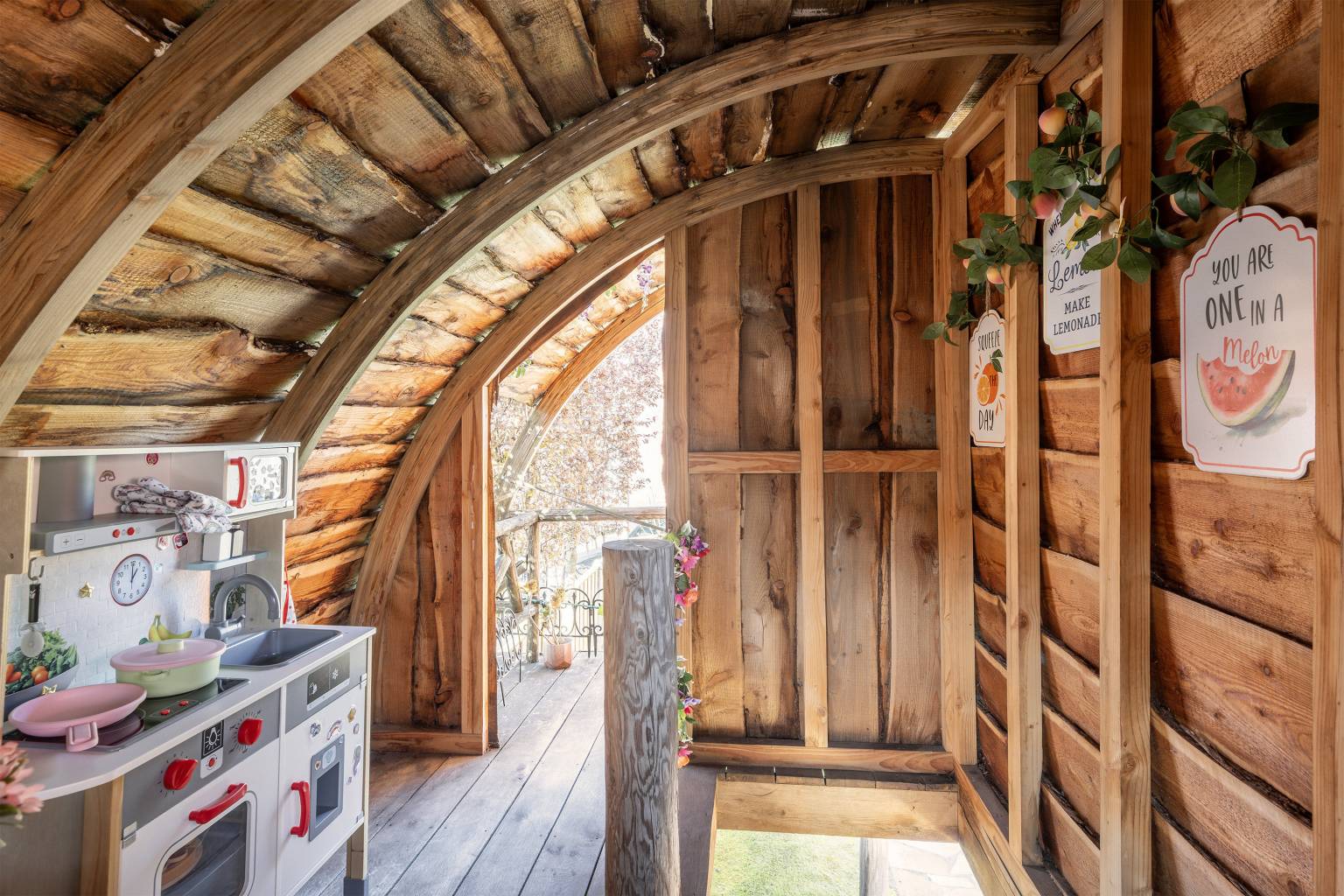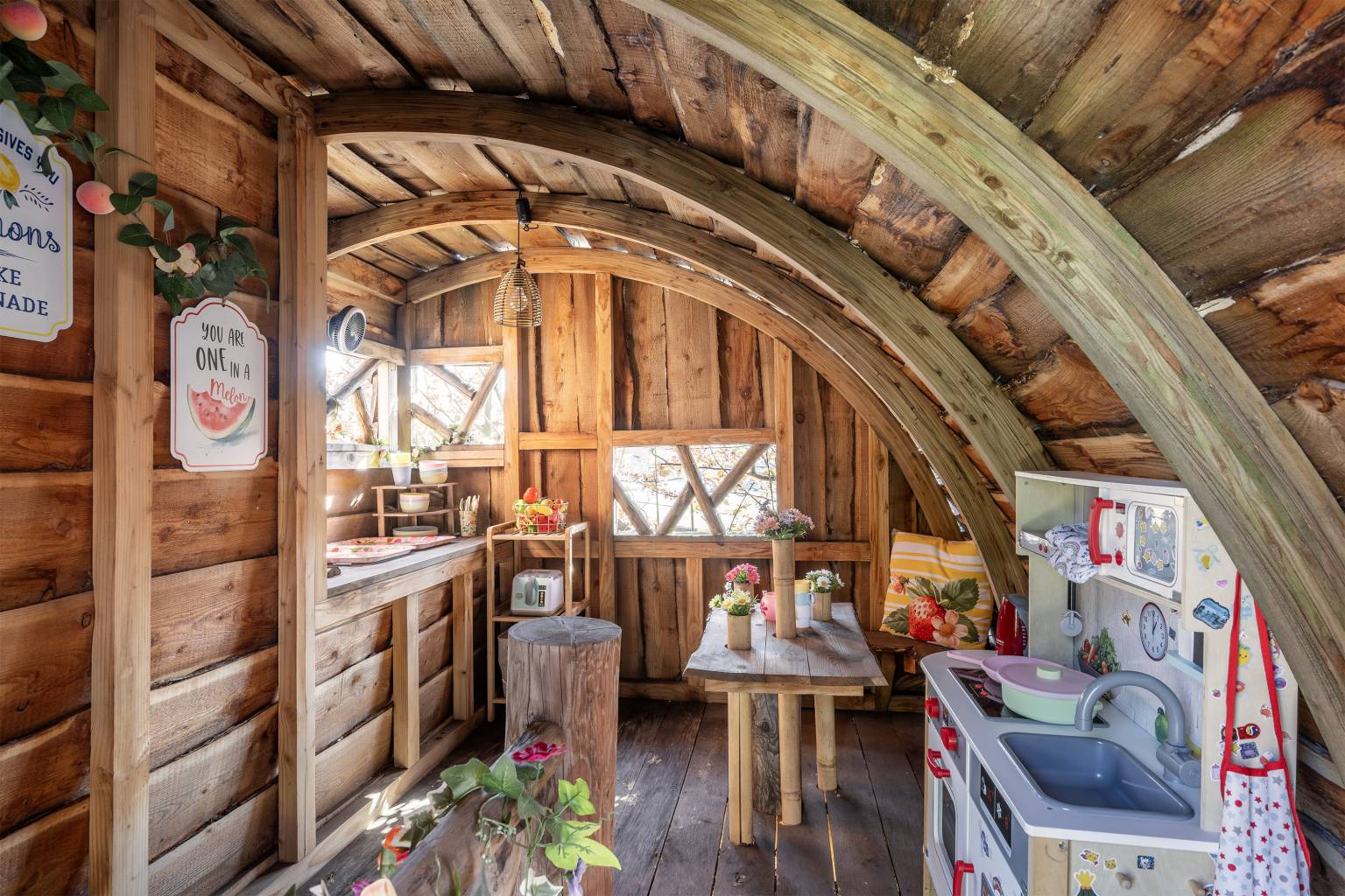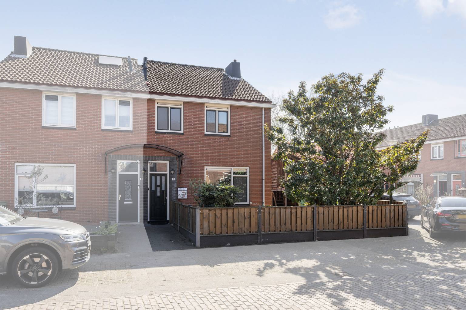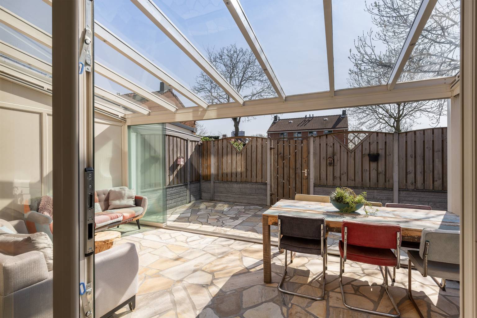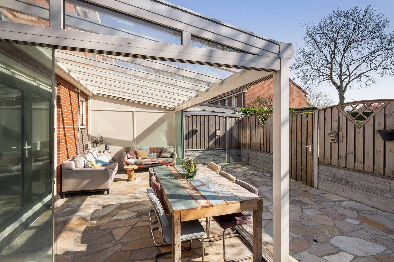 De achtertuin biedt veel privacy doordat het volledig is omheind met houten schuttingen en er een poort is naar de zij- en voortuin. Tevens is er een poort naar het achterpad en staat er een houten berging met verlichting en elektra. Naast de berging is een houten overkapping voor het droog opbergen van spullen en de blikvanger van de tuin is toch wel glazen overkapping, die geplaatst is langs de gevel van de woning. Deze is volledig afsluitbaar met glazen panelen, waardoor het hier in alle jaargetijden heerlijk vertoeven is. Ook hangt er een waterkraantje aan de gevel en is de ondergrond van de tuin voorzien van grote mozaïek tegels. De zijtuin staat in verbinding met de voortuin en ook hier is de ondergrond voorzien van grote mozaïek tegels, afgewisseld met kunstgras en een grote stenen border met beplanting. Hier zorgt een lage schutting met mooie bomen voor een afscheiding en is er een poort richting de voordeur. Ook staat er een grote boomhut in de zijtuin, waar kinderen heerlijk kunnen spelen.