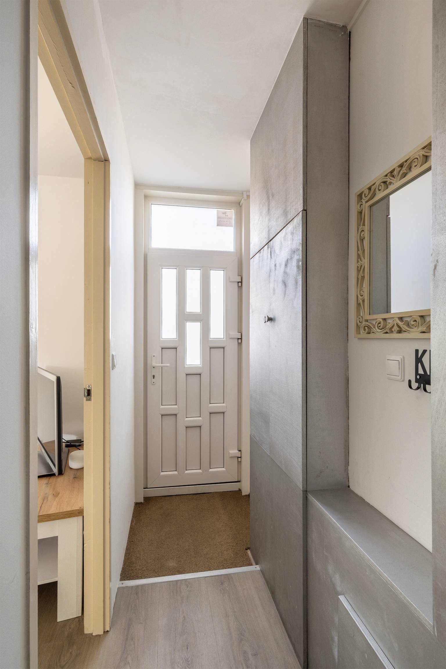 Vanaf de straat is de voordeur met glazen luifel bereikbaar, die zorgt voor een binnenkomst in de entreehal. Hier bevindt zich de meterkast en vanuit hier is er toegang tot de woonkamer, maar ook tot het volledig betegelde toilet en de trap naar de1e verdieping, die bereikbaar zijn via drie tredes. Alle wanden zijn gestuukt en er ligt een PVC vloer die is doorgetrokken naar de woonkamer.