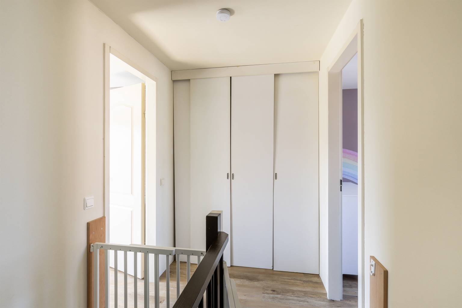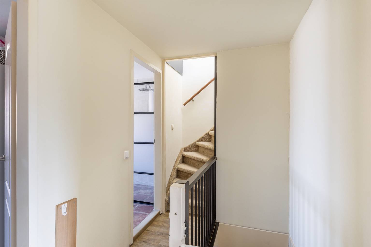 Na de trapopgang is er een bovenkomst op de overloop. Deze geeft toegang tot twee slaapkamers, de badkamer en de trap naar de 2e verdieping. Er is een grote vaste kast aanwezig met daarin de aansluiting voor de wasmachine, de wanden zijn gestuukt en op de vloer ligt PVC, dat is doorgetrokken naar de slaapkamers.