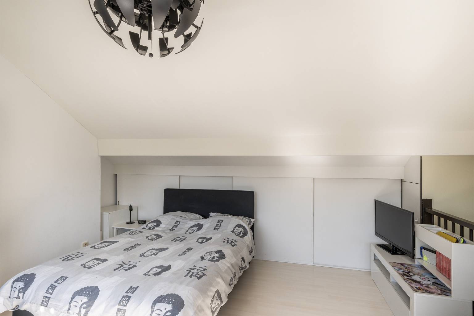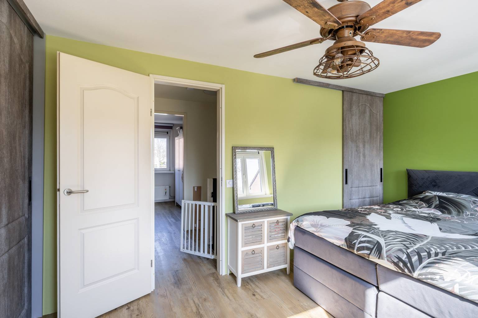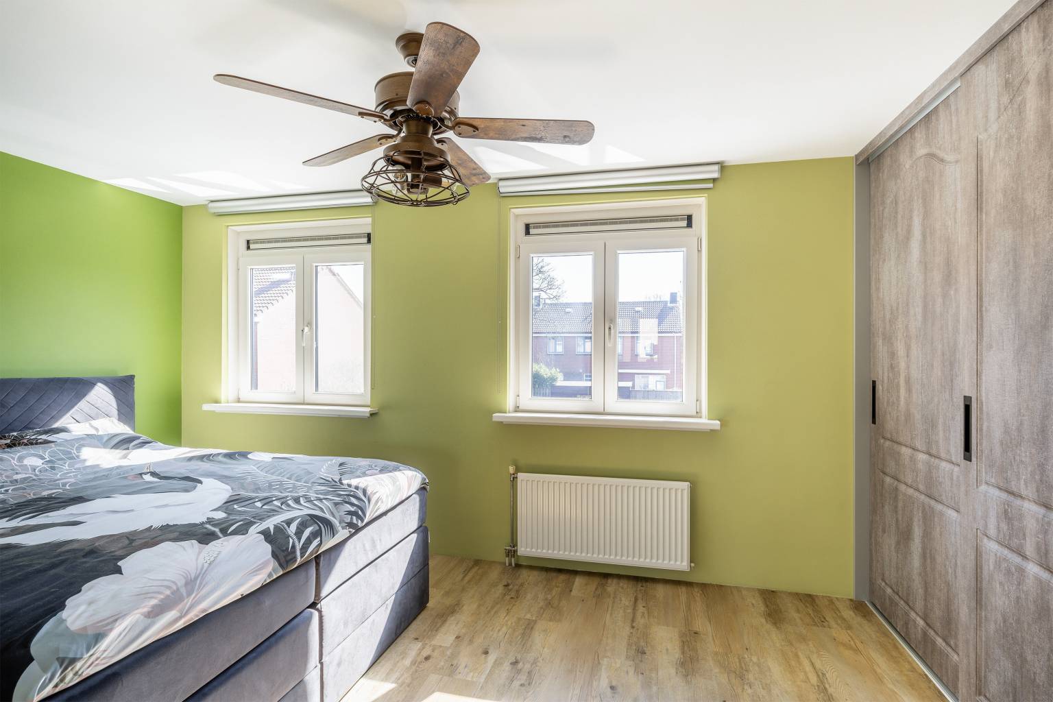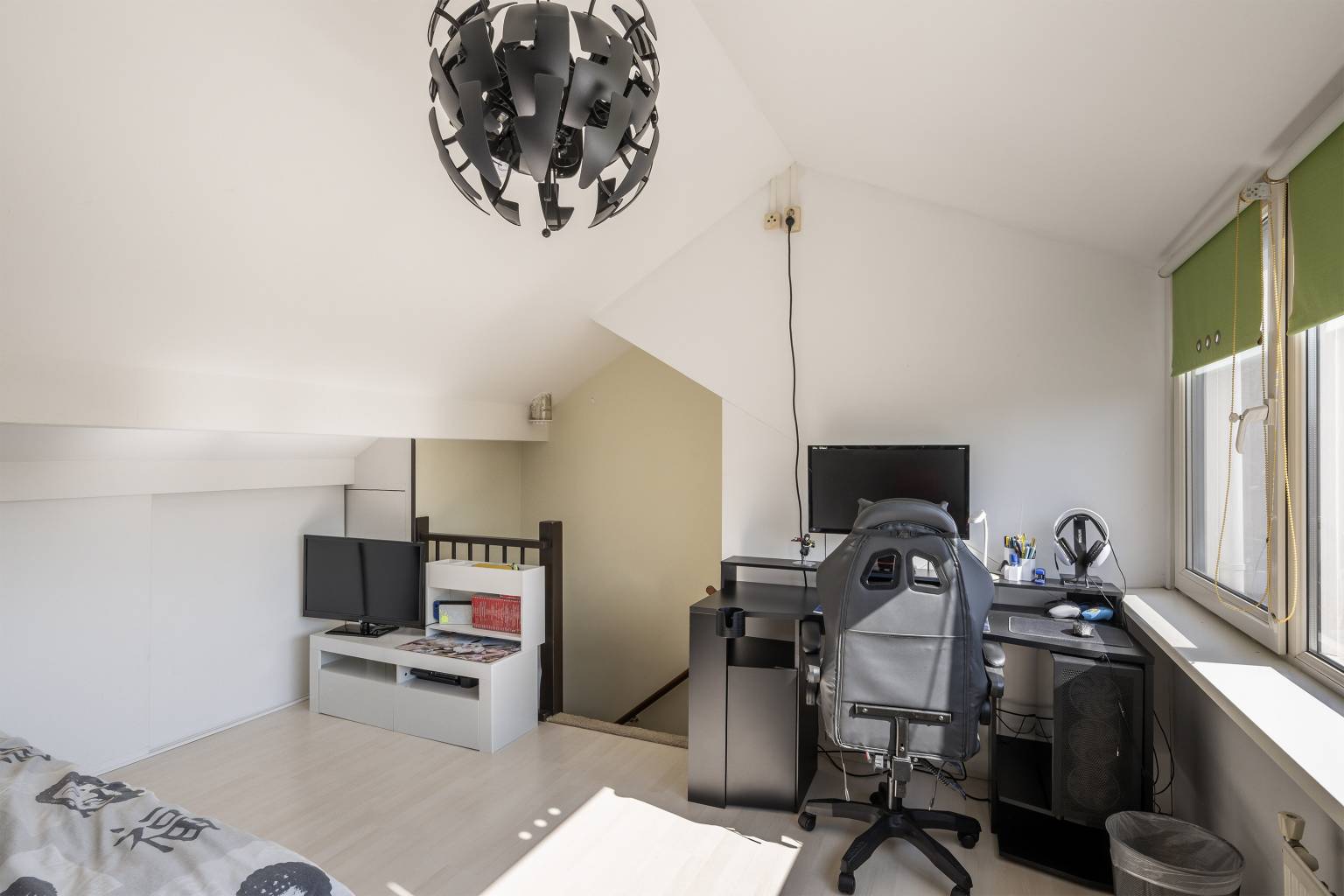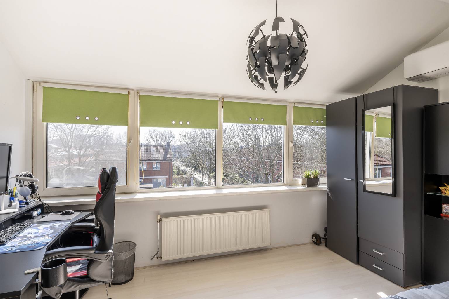 Op deze verdieping is er direct een bovenkomst in de derde slaapkamer. Deze beschikt over een grote dakkapel, die zorgt voor veel lichtinval. Er zijn knieschotten aanwezig, de opstelling van de Cv-ketel is netjes weggewerkt en er hangt airconditioning. Ook hier zijn de wanden gestuukt en er ligt een laminaatvloer.