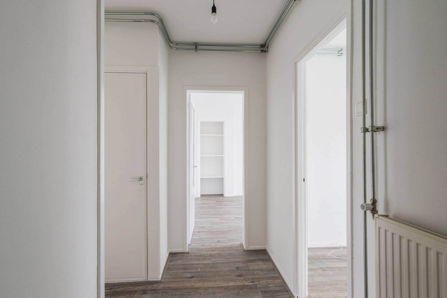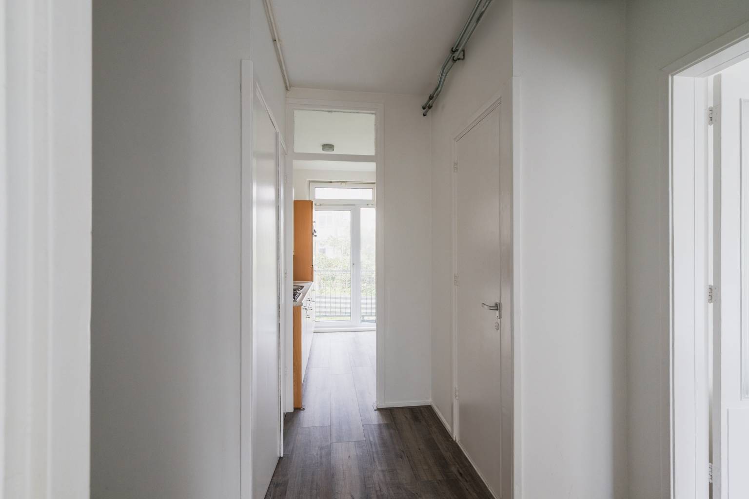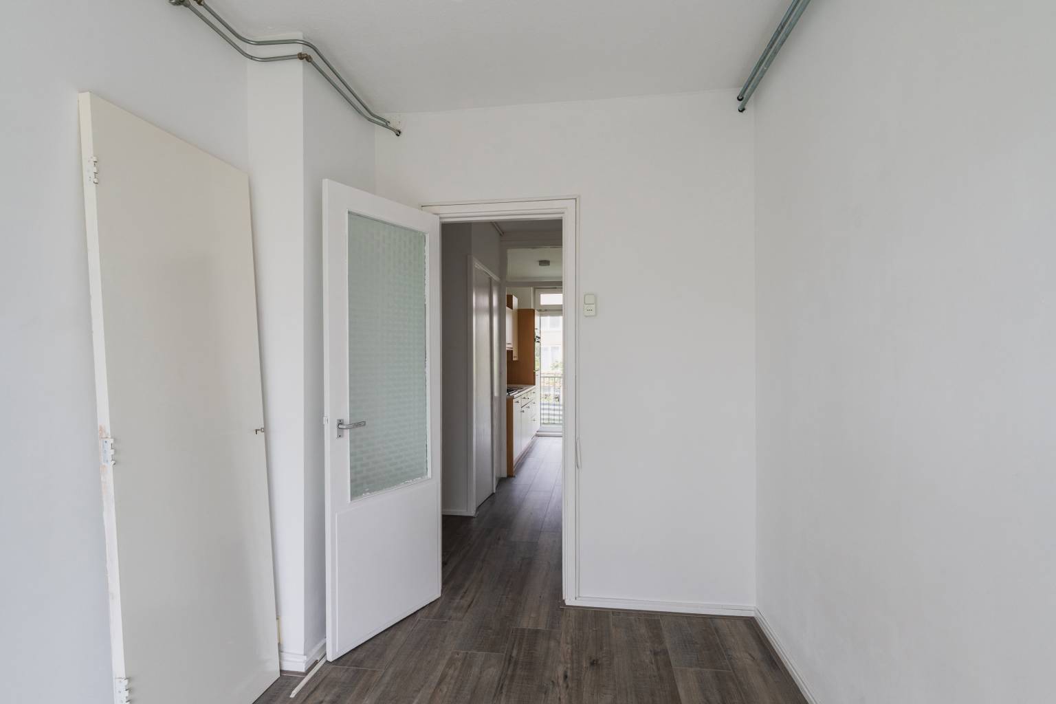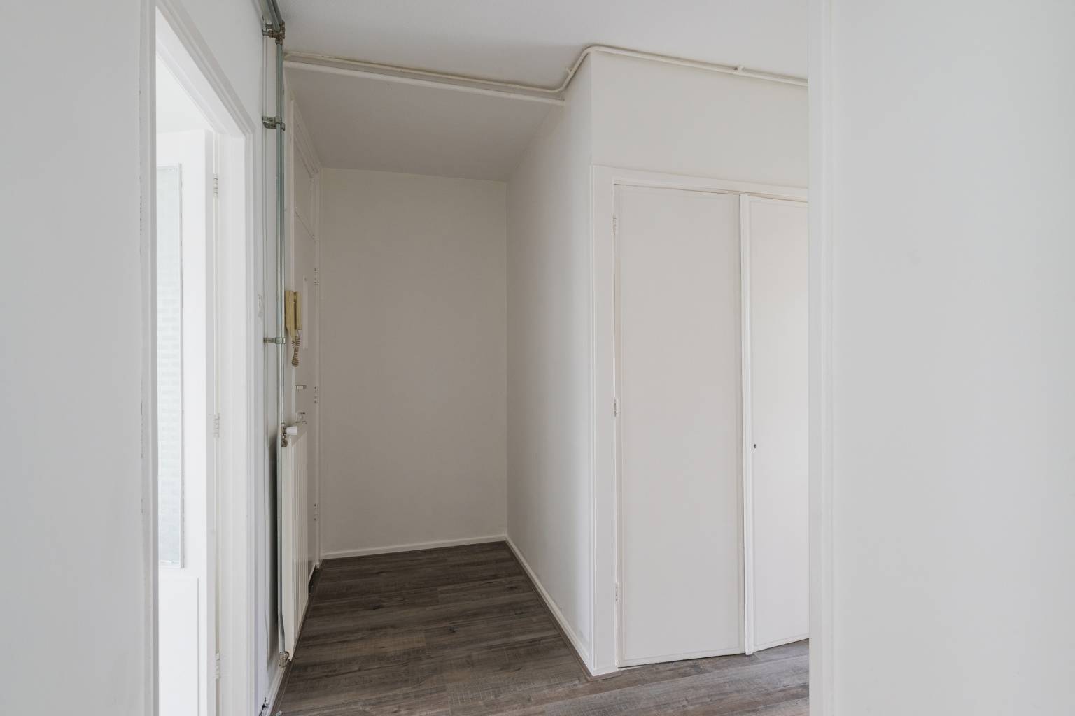 Na de voordeur is er een binnenkomst in de entreehal met vaste kast, die toegang geeft tot de eerste slaapkamer, de woonkamer, de keuken en het gedeeltelijk betegelde toilet. In het appartement zijn alle wanden zijn gestuukt en ligt er een laminaatvloer.