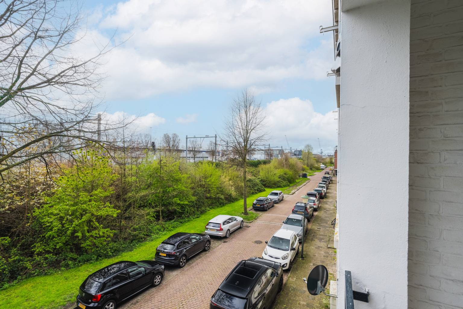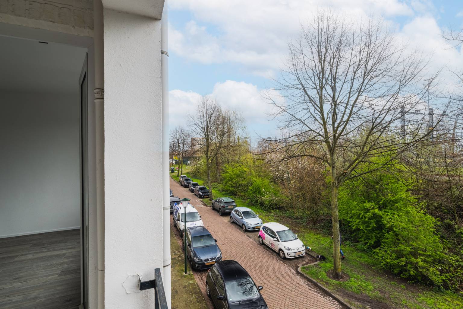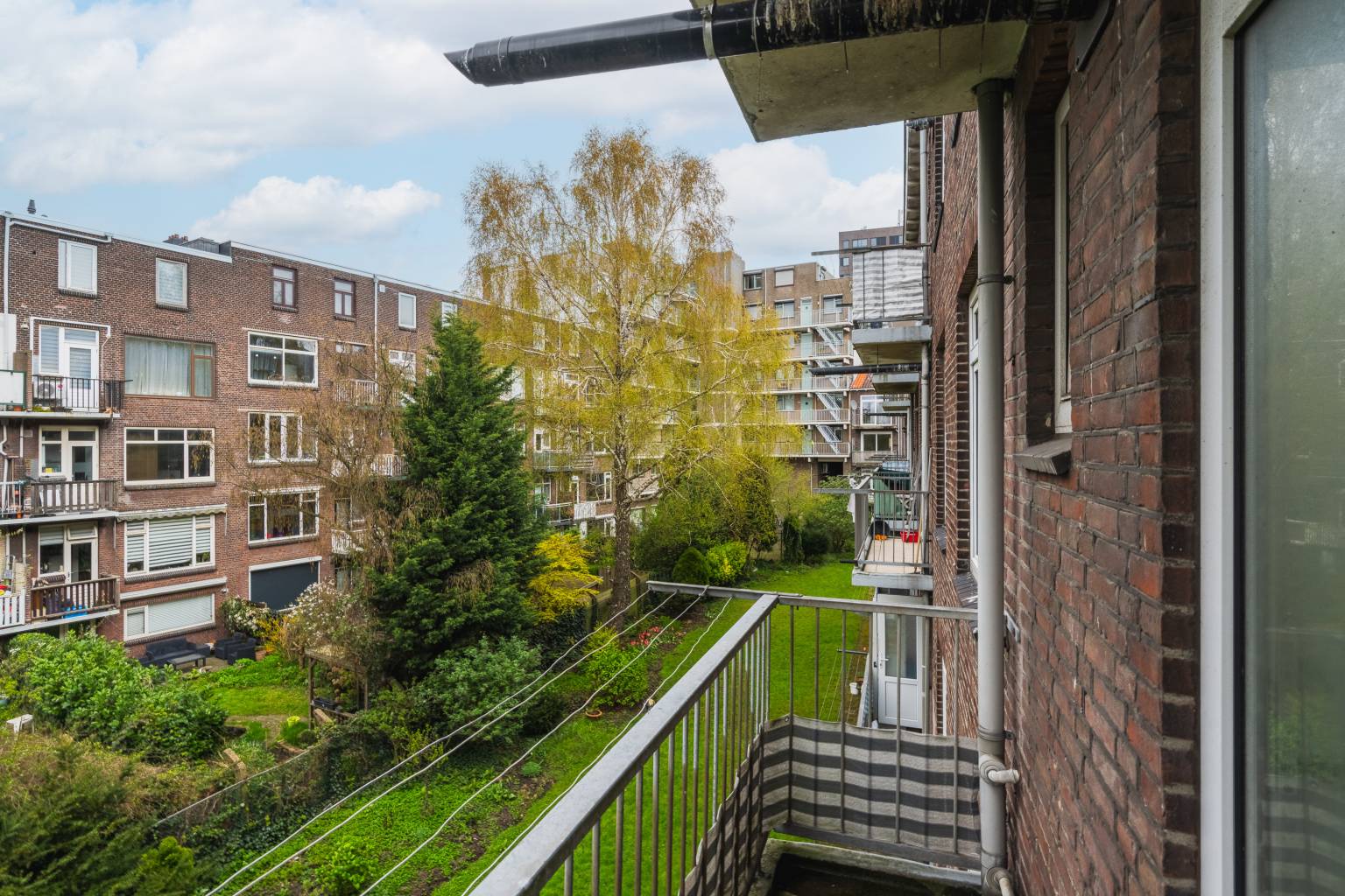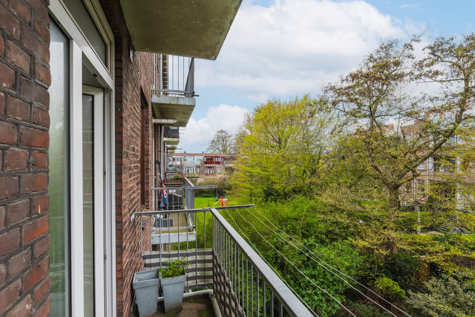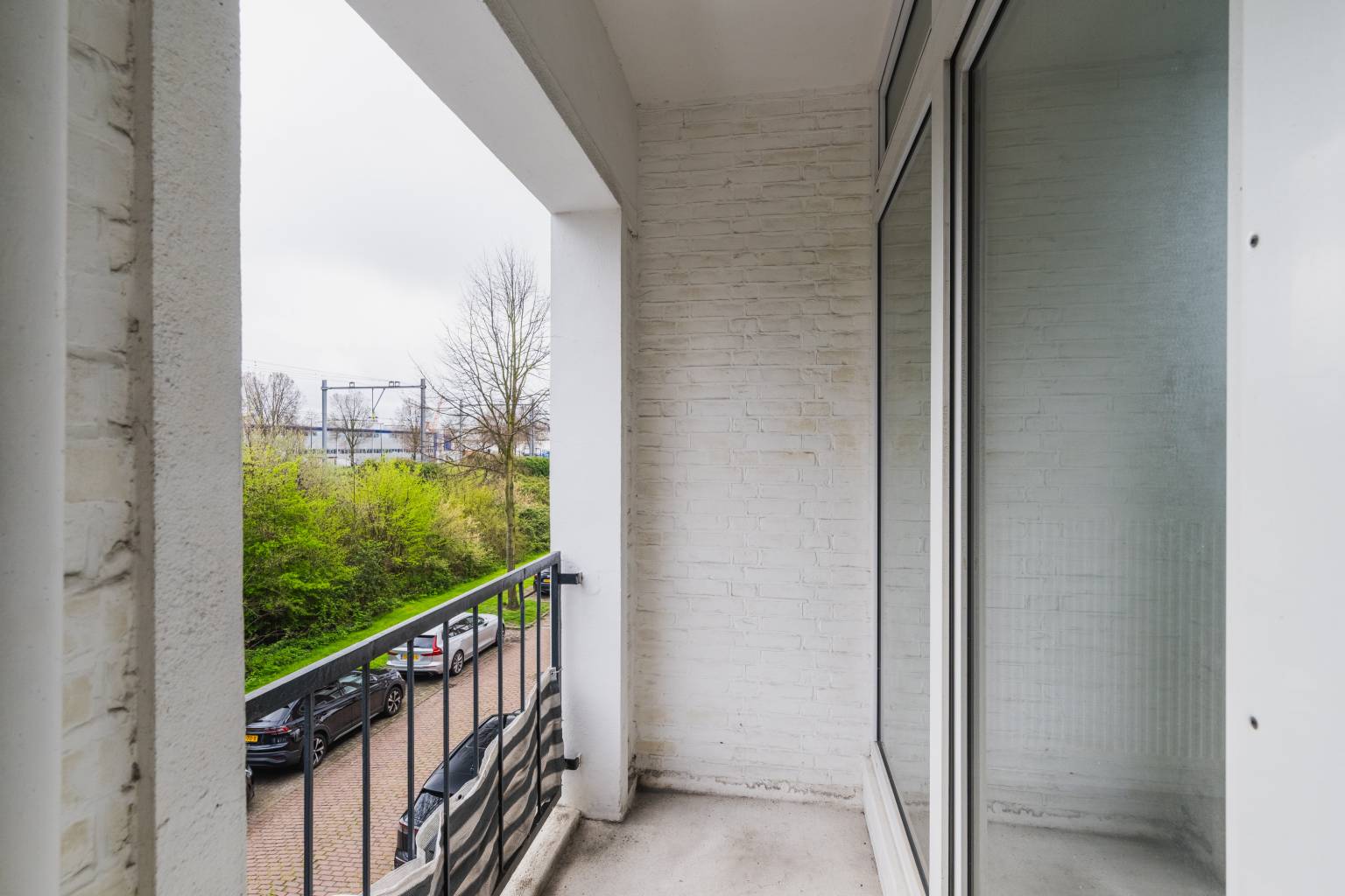 Het balkon is beschut, doordat het deels inpandig is. Er is een metalen hekwerk en het biedt uitzicht over de straat.