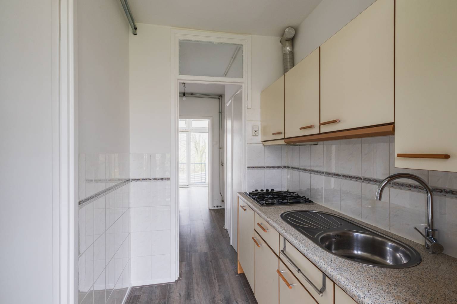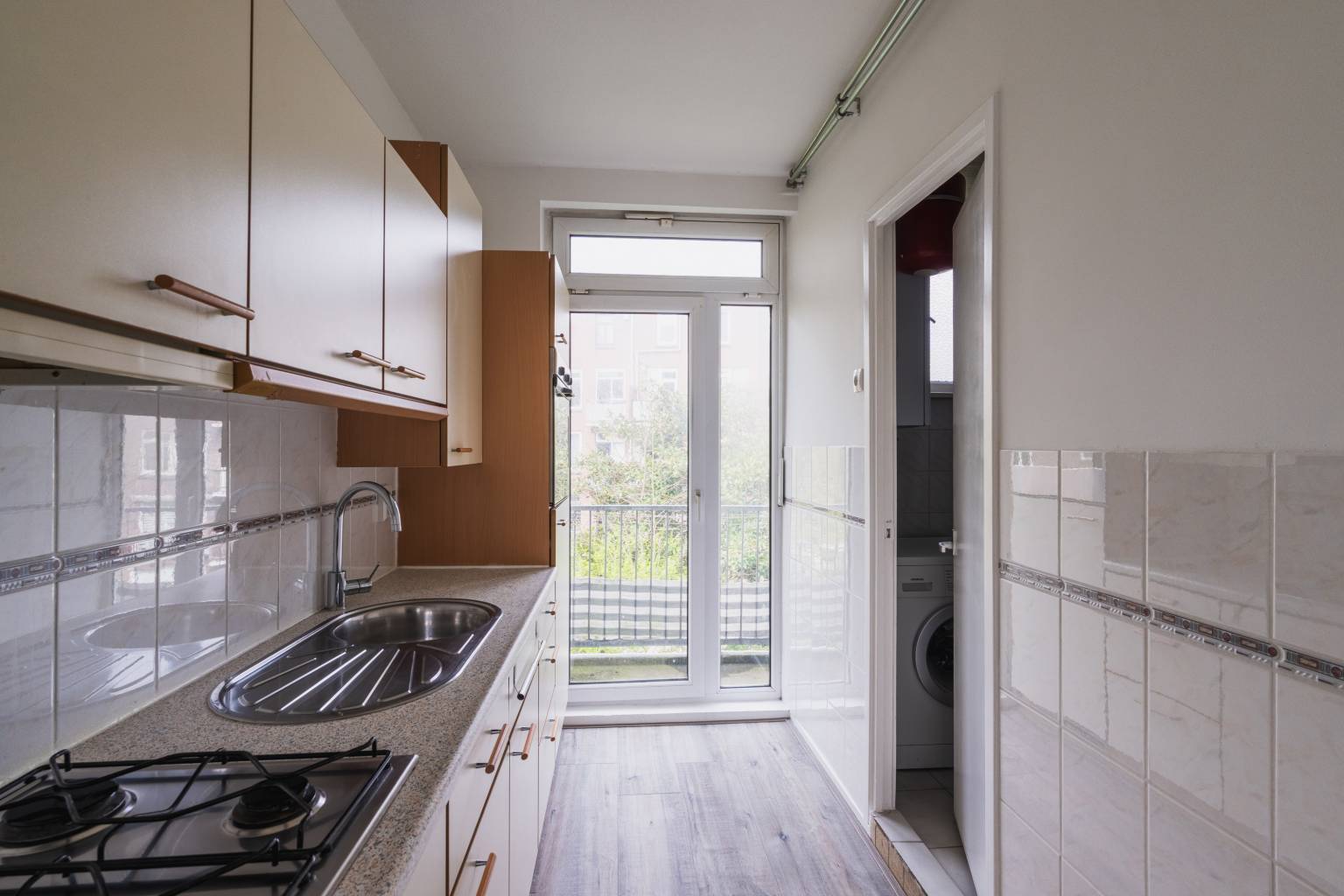 De keuken beschikt over een recht keukenblok met bovenkasten en diverse apparatuur, zoals een koelkast, een oven, een gaskookplaat en een afzuigkap. De wanden zijn deels betegeld en er is toegang tot het tweede balkon, dat is overdekt en uitzicht biedt over de binnentuin.