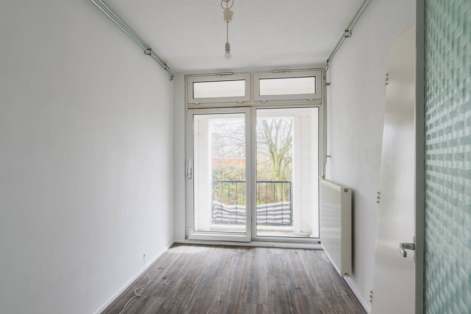 De eerste slaapkamer is gelegen naast de woonkamer en beschikt over een schuifpui naar het balkon.