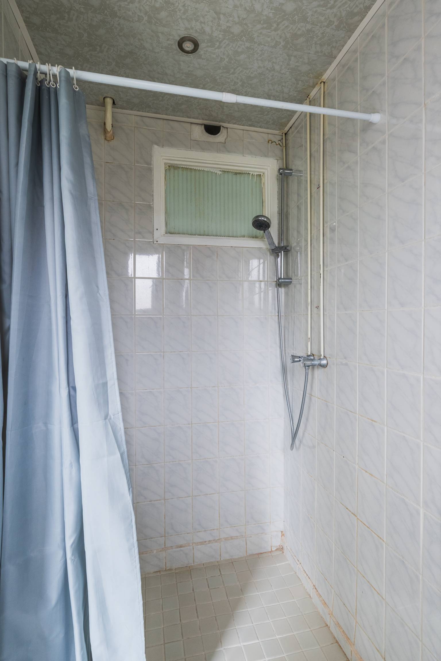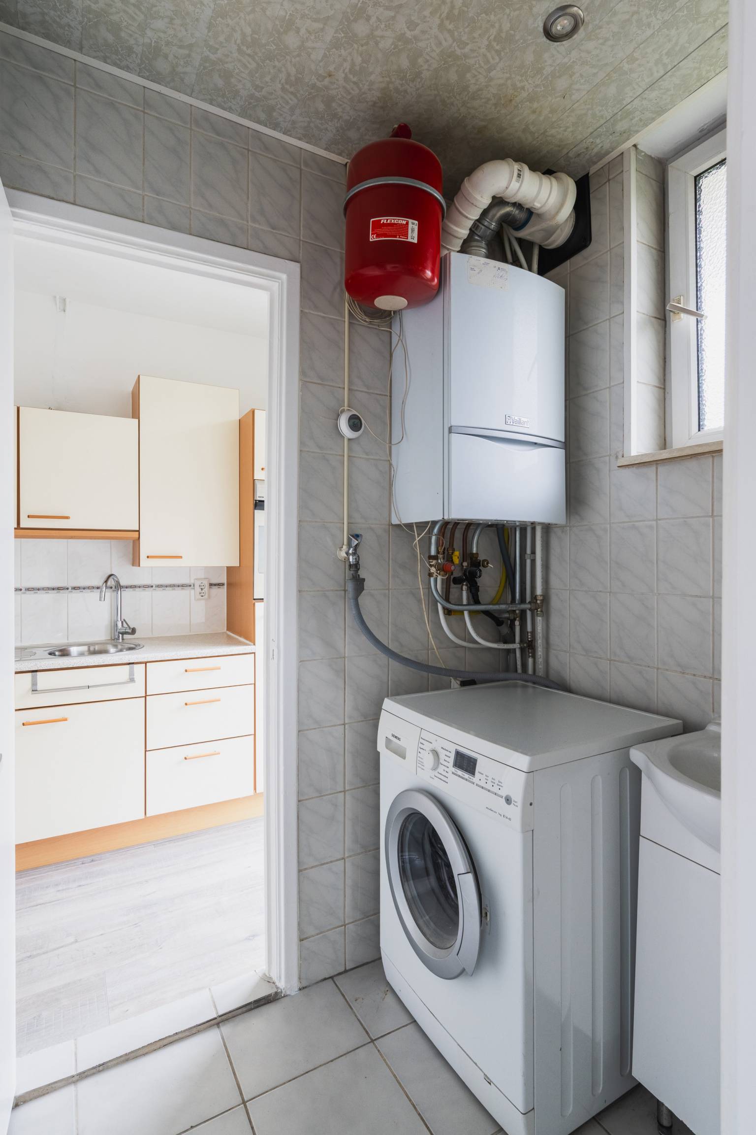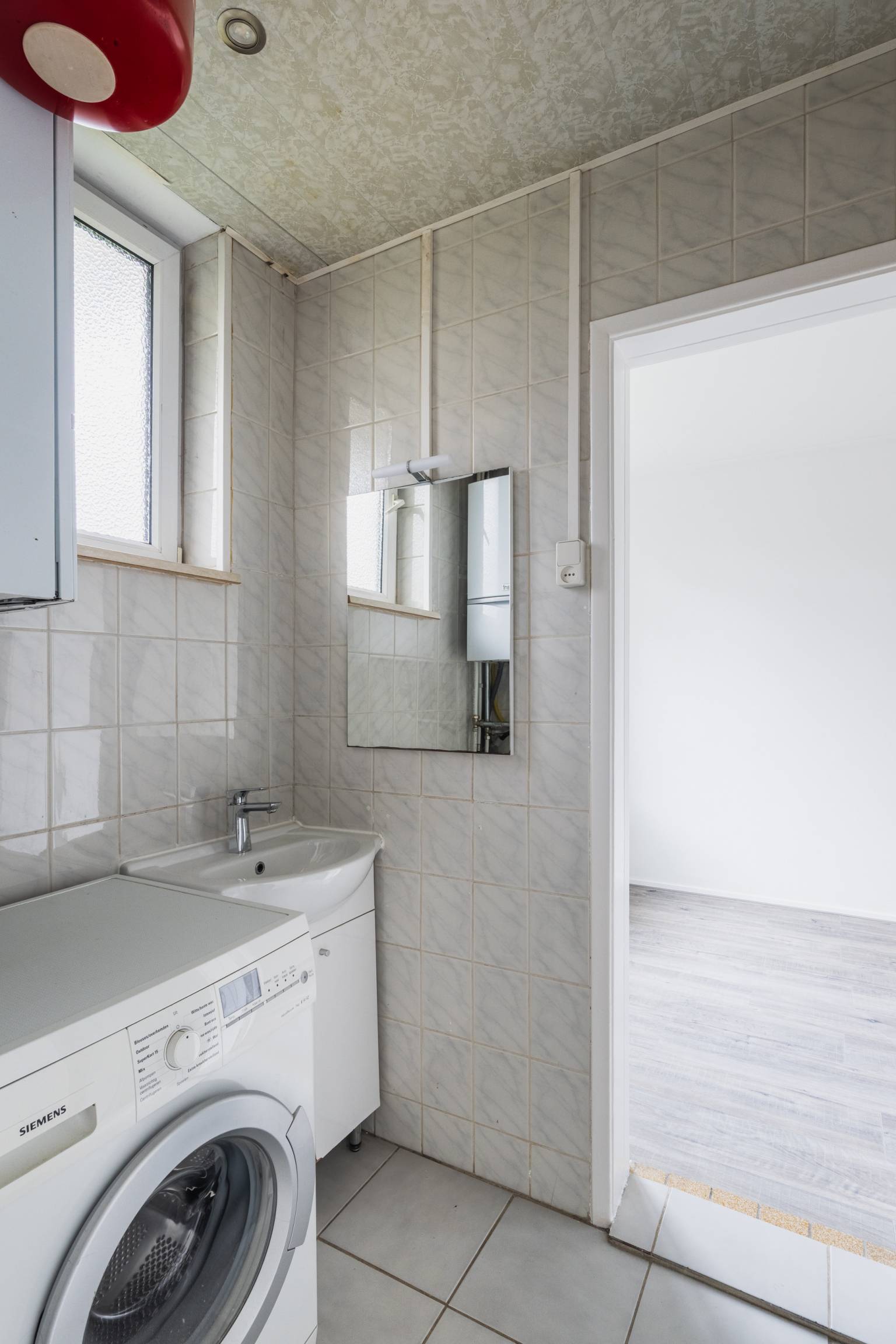 De tweede slaapkamer is gelegen aan de achterzijde en beschikt over twee vaste kasten. Daarnaast is er vanuit hier toegang tot de badkamer. Deze is volledig betegeld en uitgerust met een douche, een wastafelmeubel en een wasmachine aansluiting. In deze ruimte hangt ook de Cv-ketel en is er een te openen raam voor natuurlijke ventilatie. Handig is dat er vanuit hier ook toegang is tot de keuken.