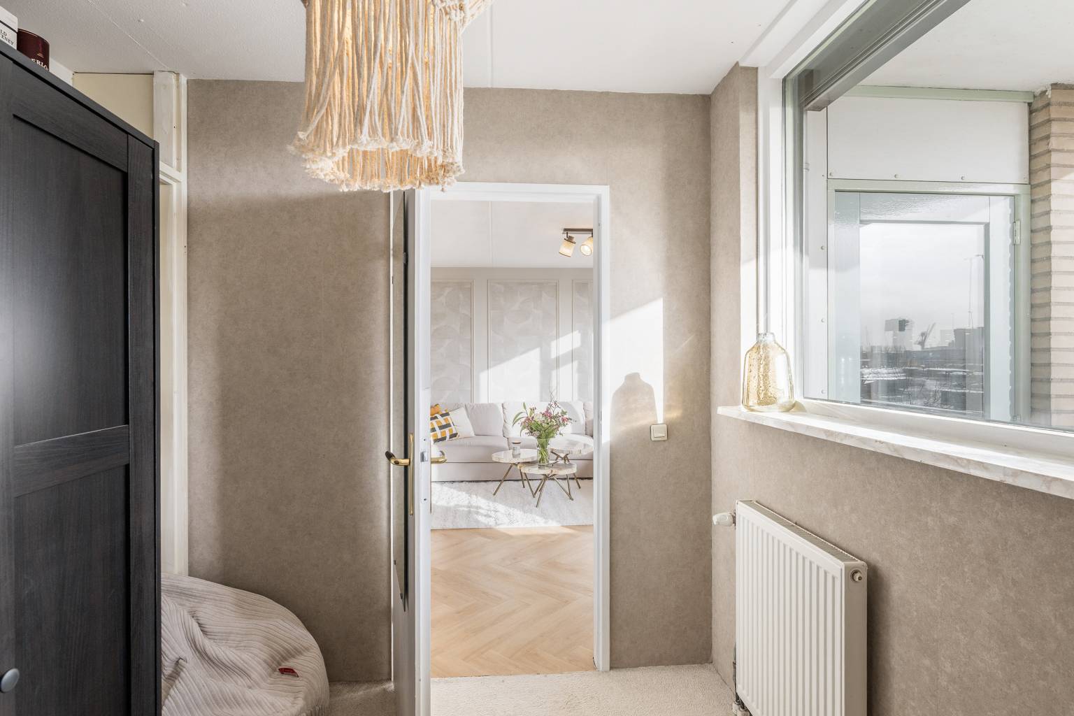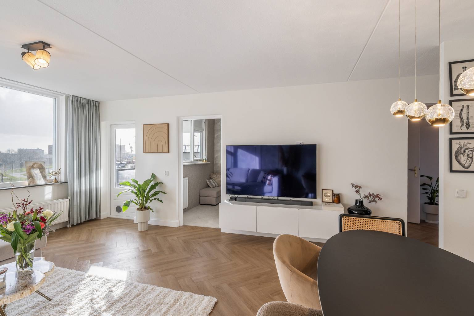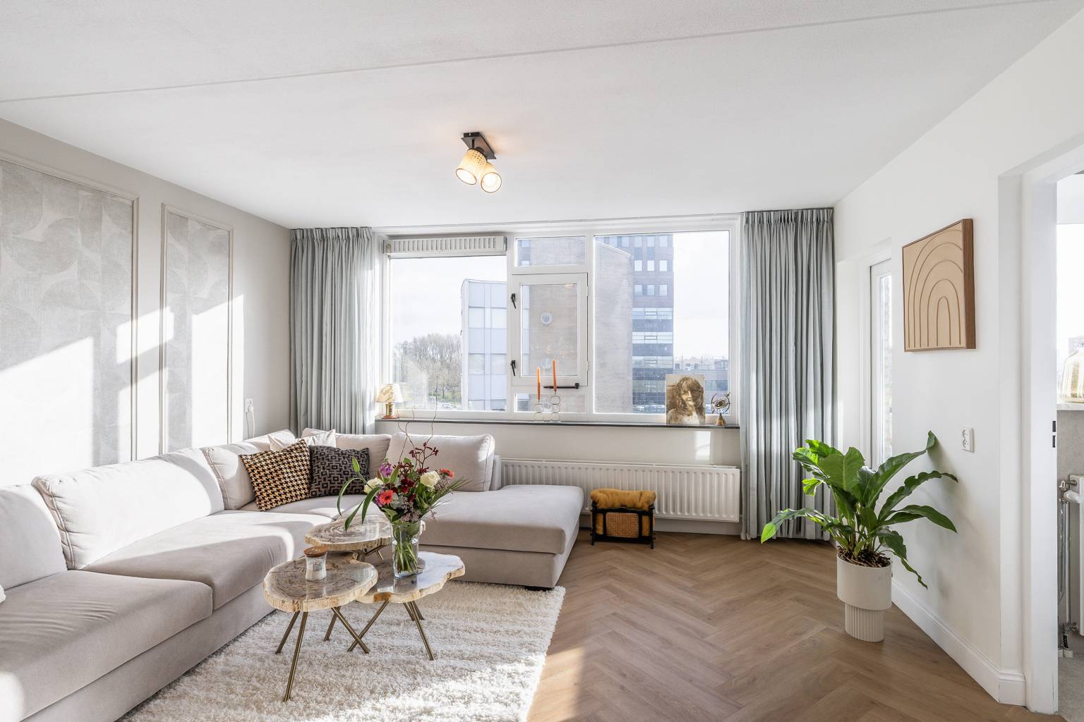 De woonkamer is een sfeervolle lichte ruimte, waarbij een wand deels is voorzien van sierlijsten. Er is voldoende ruimte voor zowel een zit- als een eethoek en vanuit de woonkamer is er toegang tot de tweede slaapkamer en het overdekte balkon, dat een vrij uitzicht geeft over de wijk. De balustrade is deels voorzien van glaspanelen en de hogere afscheiding zorgt voor een heerlijk beschut plekje.