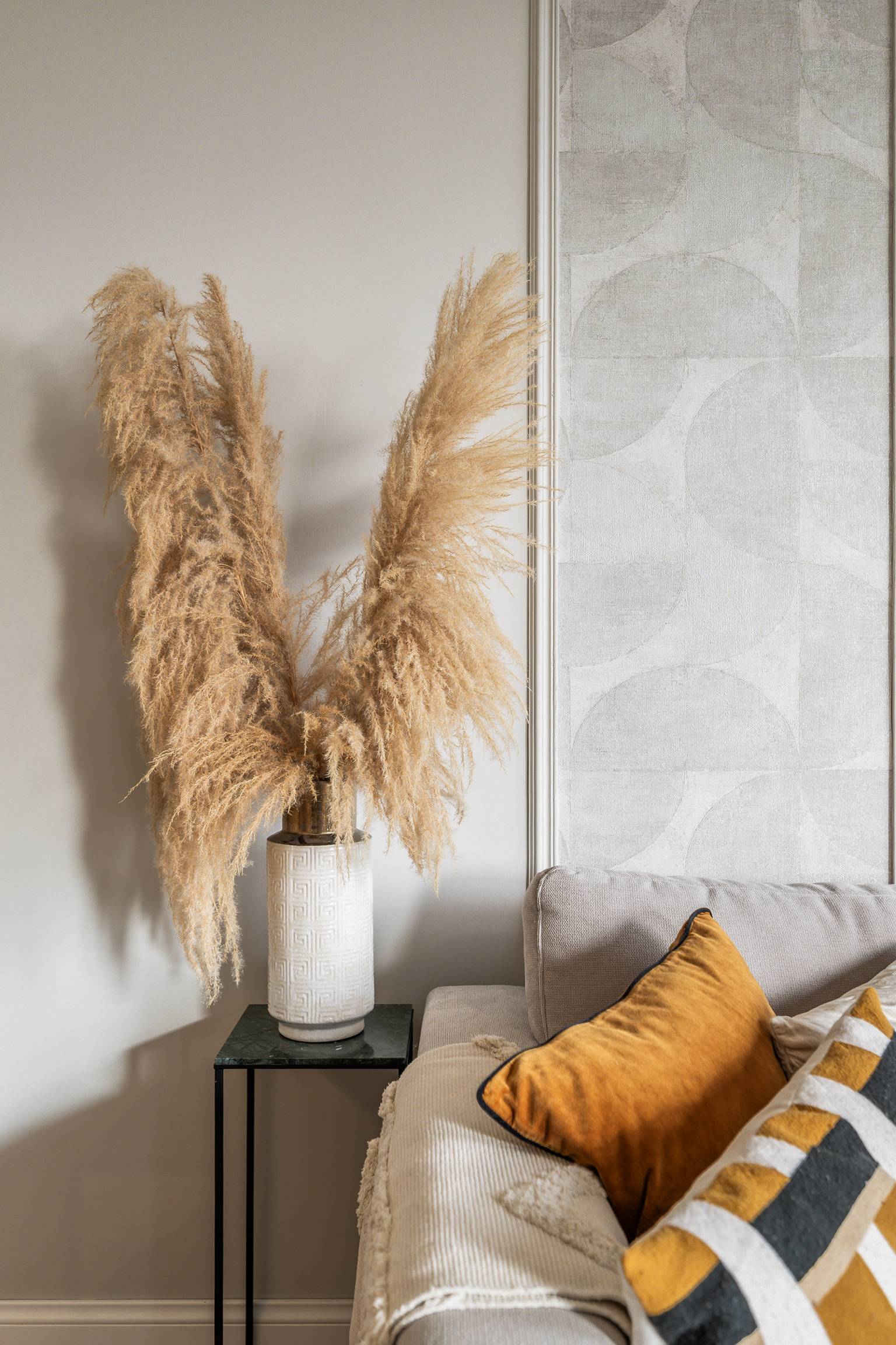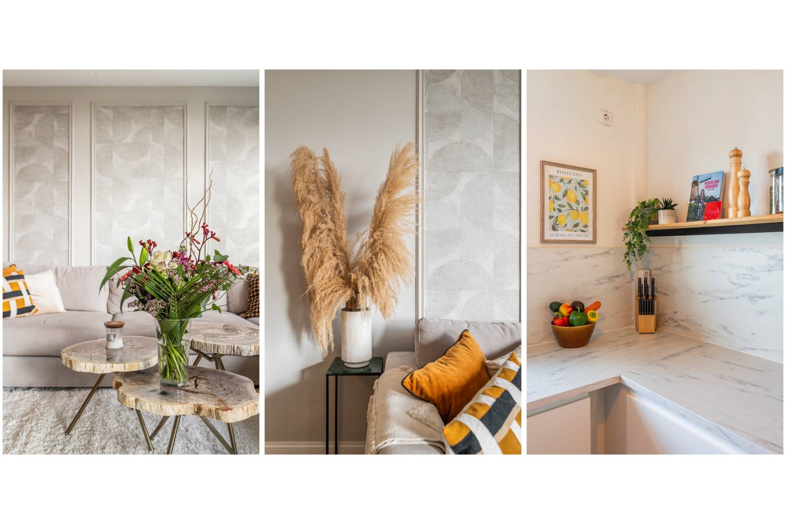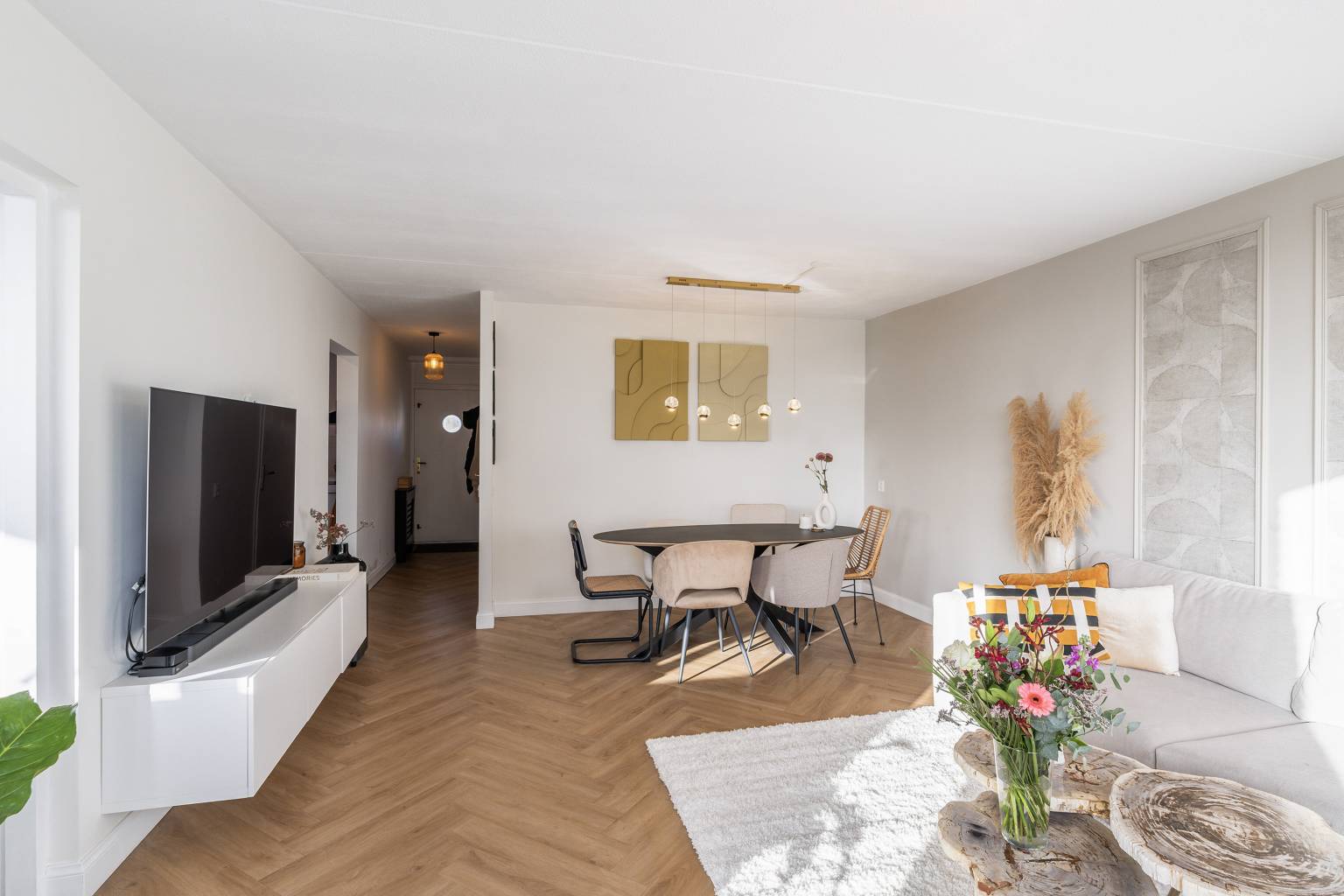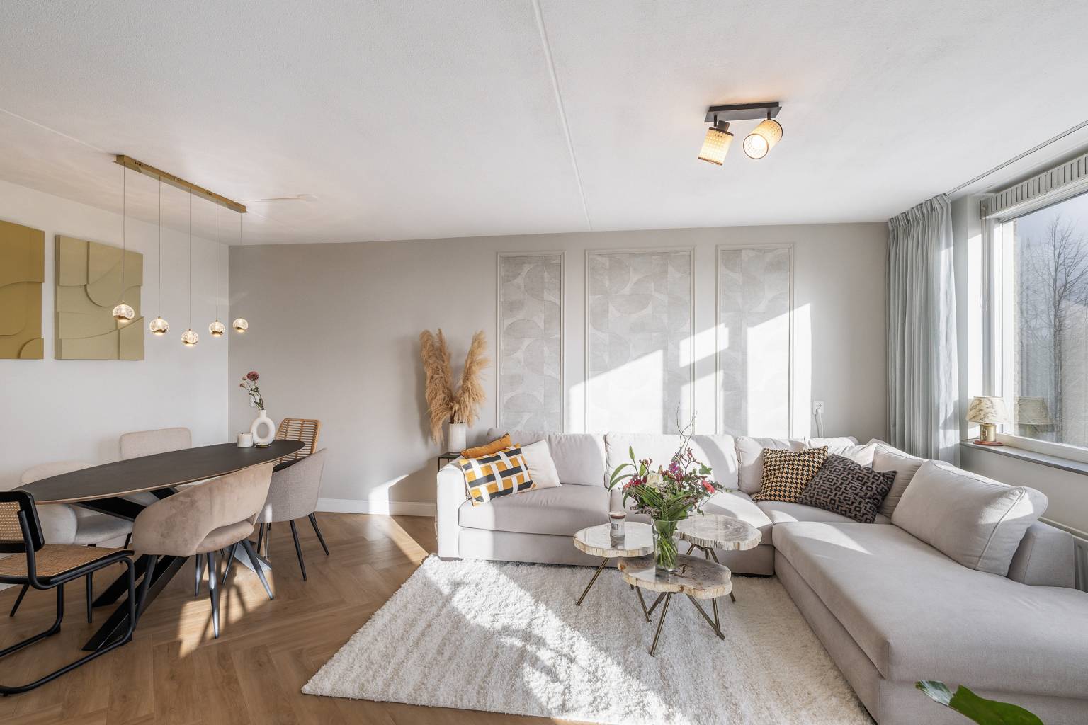 De woonkamer is een sfeervolle lichte ruimte, waarbij een wand deels is voorzien van sierlijsten. Er is voldoende ruimte voor zowel een zit- als een eethoek en vanuit de woonkamer is er toegang tot de tweede slaapkamer en het overdekte balkon, dat een vrij uitzicht geeft over de wijk. De balustrade is deels voorzien van glaspanelen en de hogere afscheiding zorgt voor een heerlijk beschut plekje.