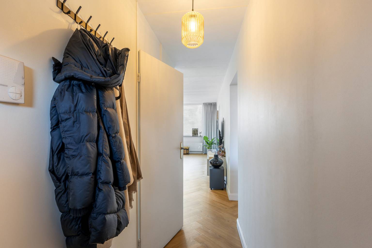 Vanaf de overdekte galerij is de voordeur bereikbaar, die zorgt voor een binnenkomst in de open entreehal. Hier bevindt zich de meterkast en vanuit hier is er toegang tot de eerste slaapkamers, de woonkamer en de keuken. In het appartement zijn alle wanden gestuukt en er ligt een klik PVC vloer in visgraatmotief.