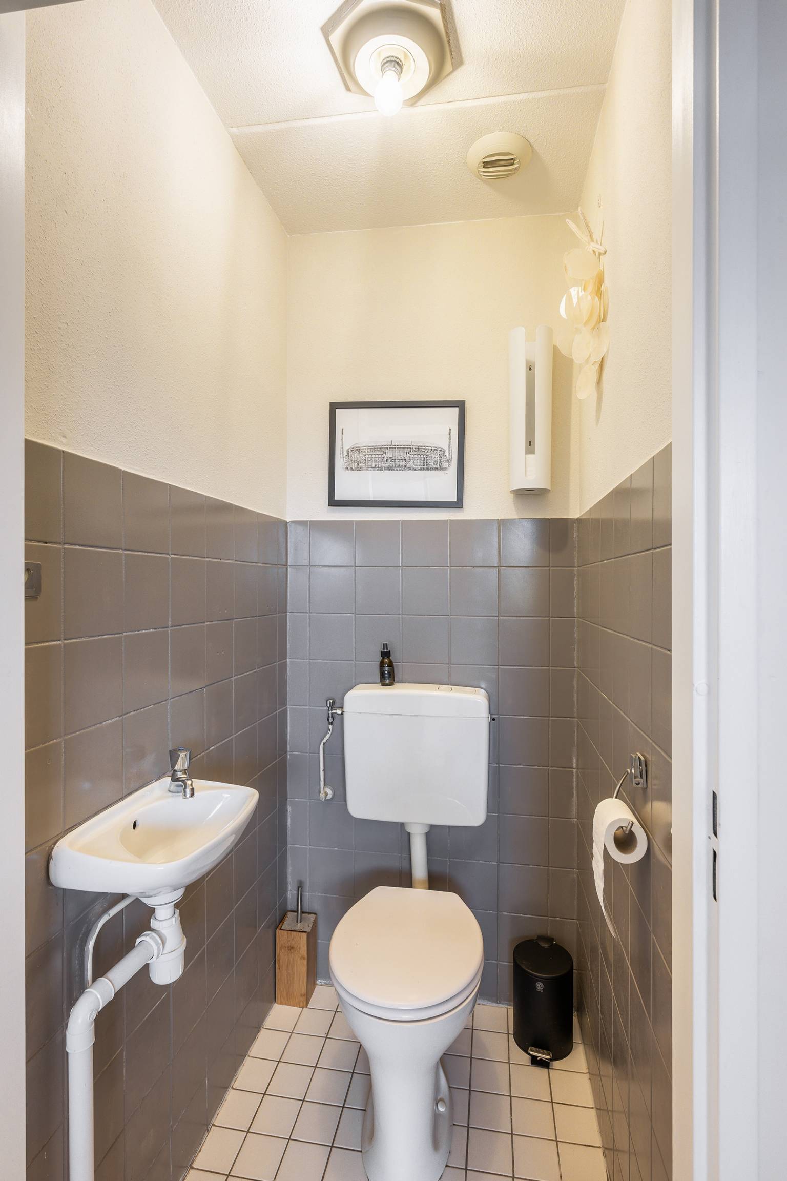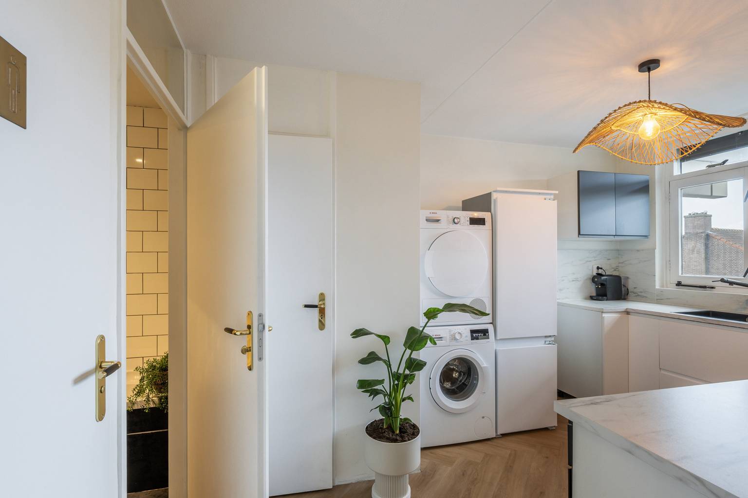 De keuken is opgesteld in een verlengde hoek en is voorzien van twee bovenkasten. Het aanrechtblad loopt door naar de achterwand en er is diverse apparatuur aanwezig, zoals een koelkast, een vaatwasser, een inductiekookplaat en een recirculatie afzuigkap. Ook bevindt zich hier de wasmachineaansluiting en is er een vaste kast aanwezig, met daarin de opstelling van de Cv-ketel. Vanuit de keuken zijn er twee deuren, één naar het deels betegelde toilet en de andere naar de badkamer.