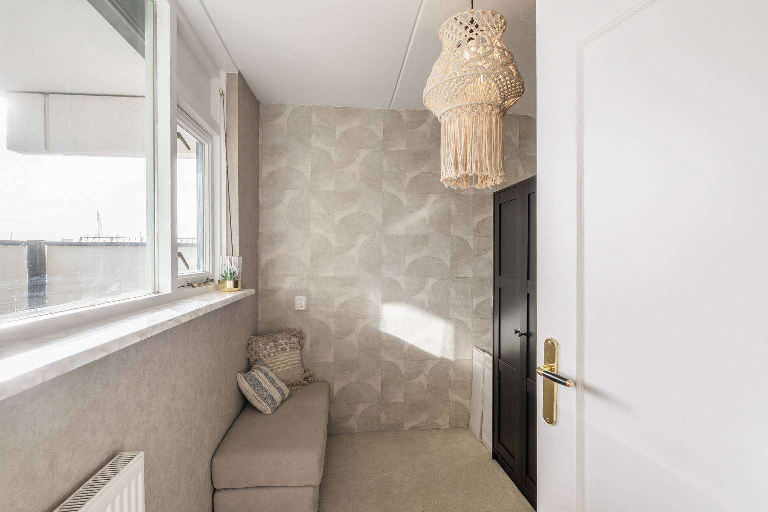 In de tweede slaapkamer zijn de wanden behangen, ligt er vloerbedekking en is er een open kast aanwezig.