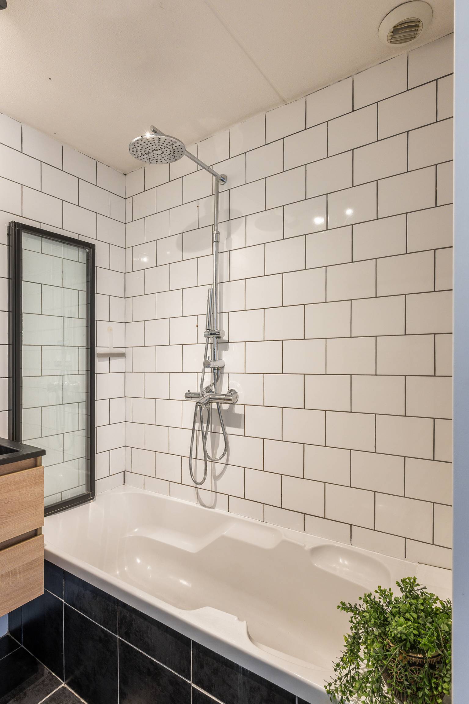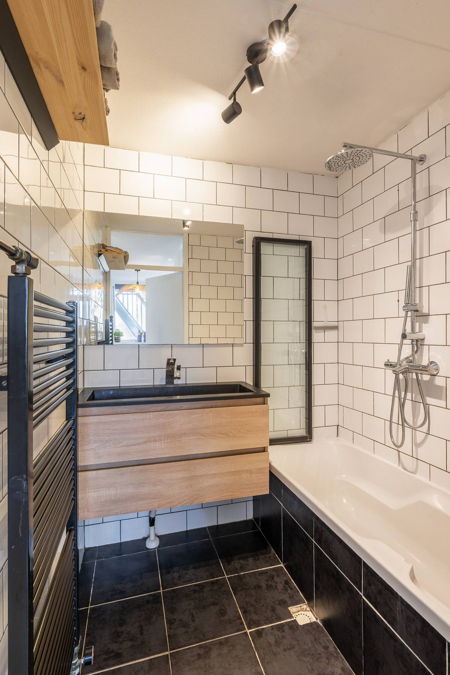 De badkamer is volledig betegeld en uitgerust met een ligbad met een douche, een wastafelmeubel en een handdoeken radiator.