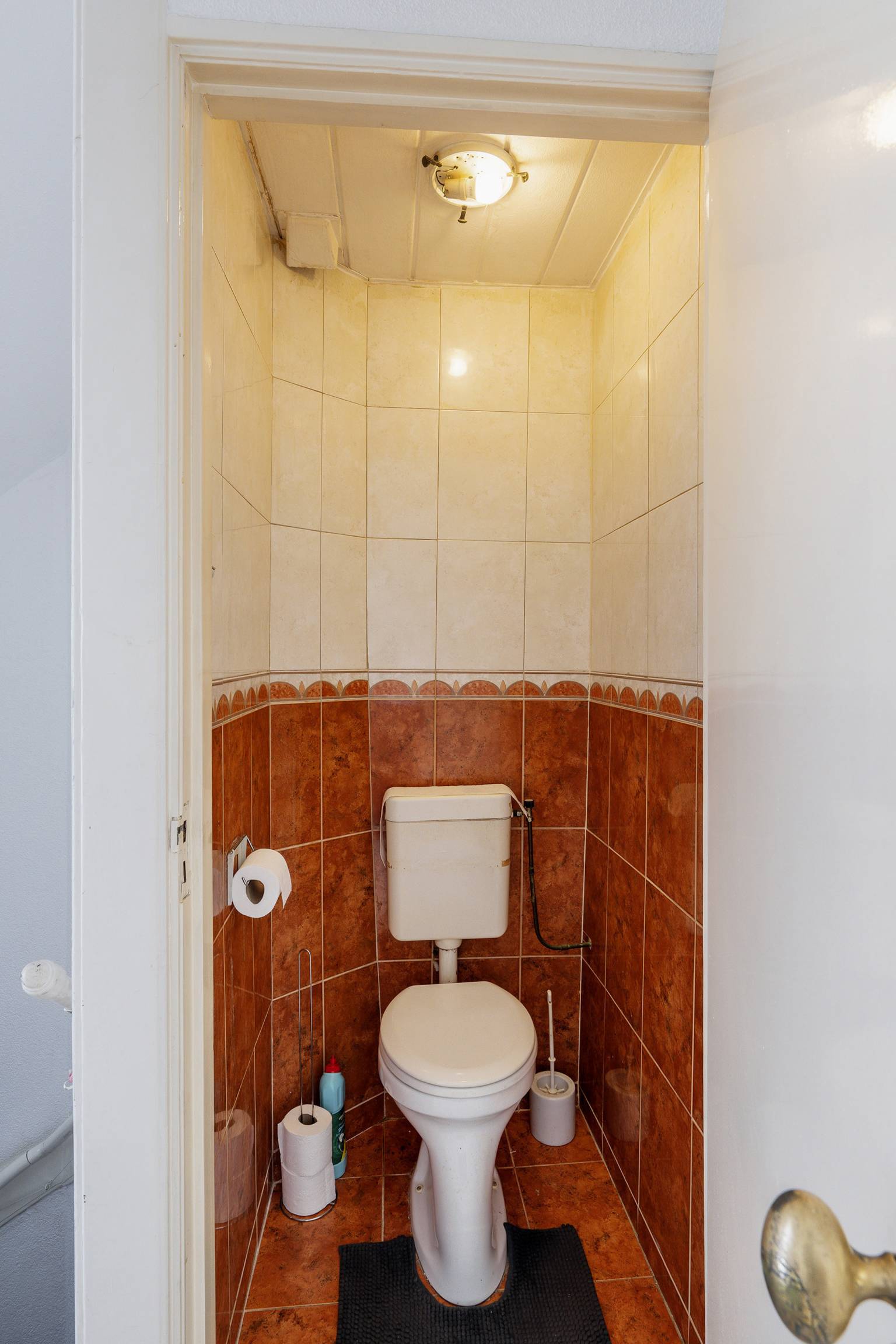 Na de trapopgang is er een bovenkomst op de overloop, die toegang geeft tot het volledig betegelde toilet, de eetkamer, de eerste slaapkamer en de gestoffeerde trap naar de 2e verdieping. De wanden zijn afgewerkt met granol en op de vloer ligt laminaat.