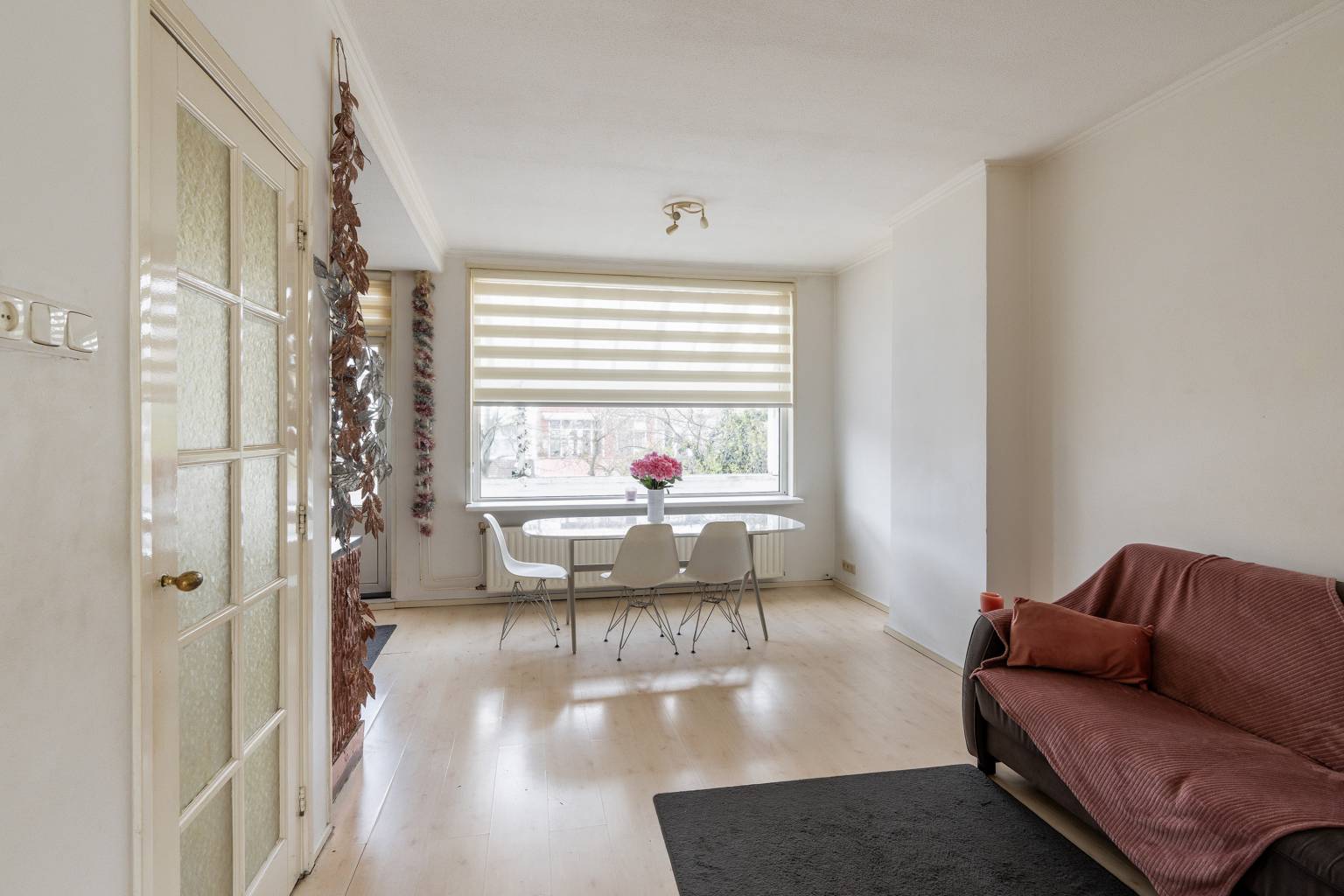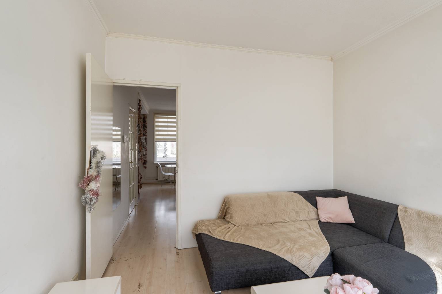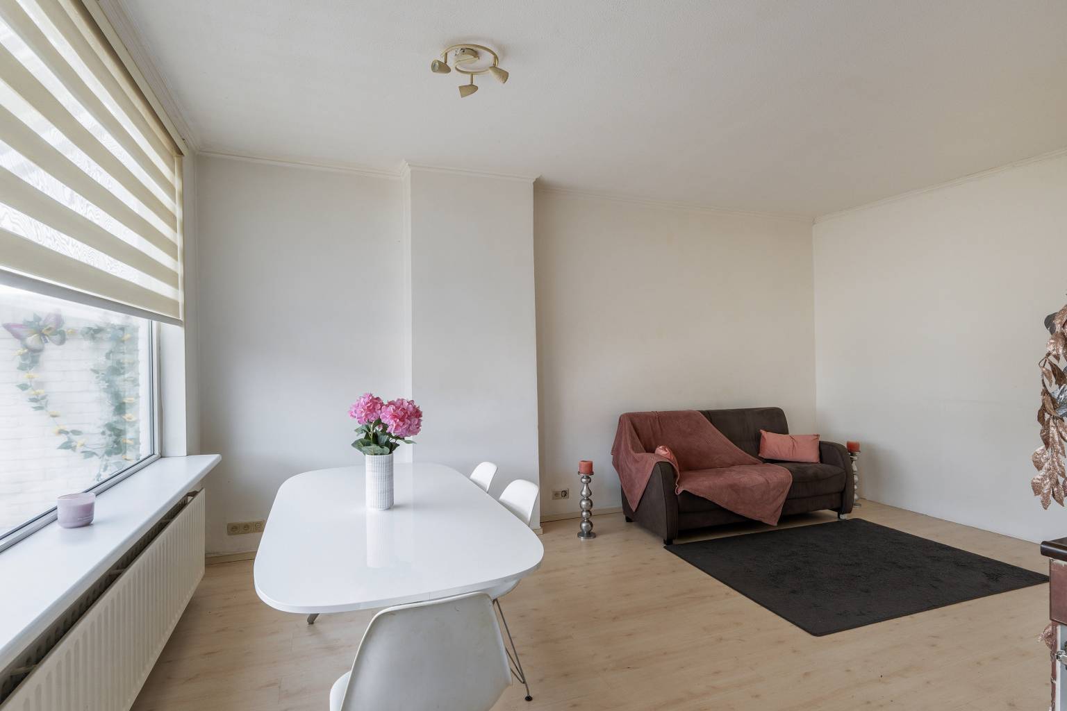 De woonkamer is gesitueerd aan de voorzijde en biedt uitzicht over de straat. Naar wens is deze ruimte bij de eetkamer te betrekken, of eventueel te gebruiken als slaapkamer. Ook hier zijn de wanden afgewerkt met pleisterwerk en ligt er een laminaatvloer.