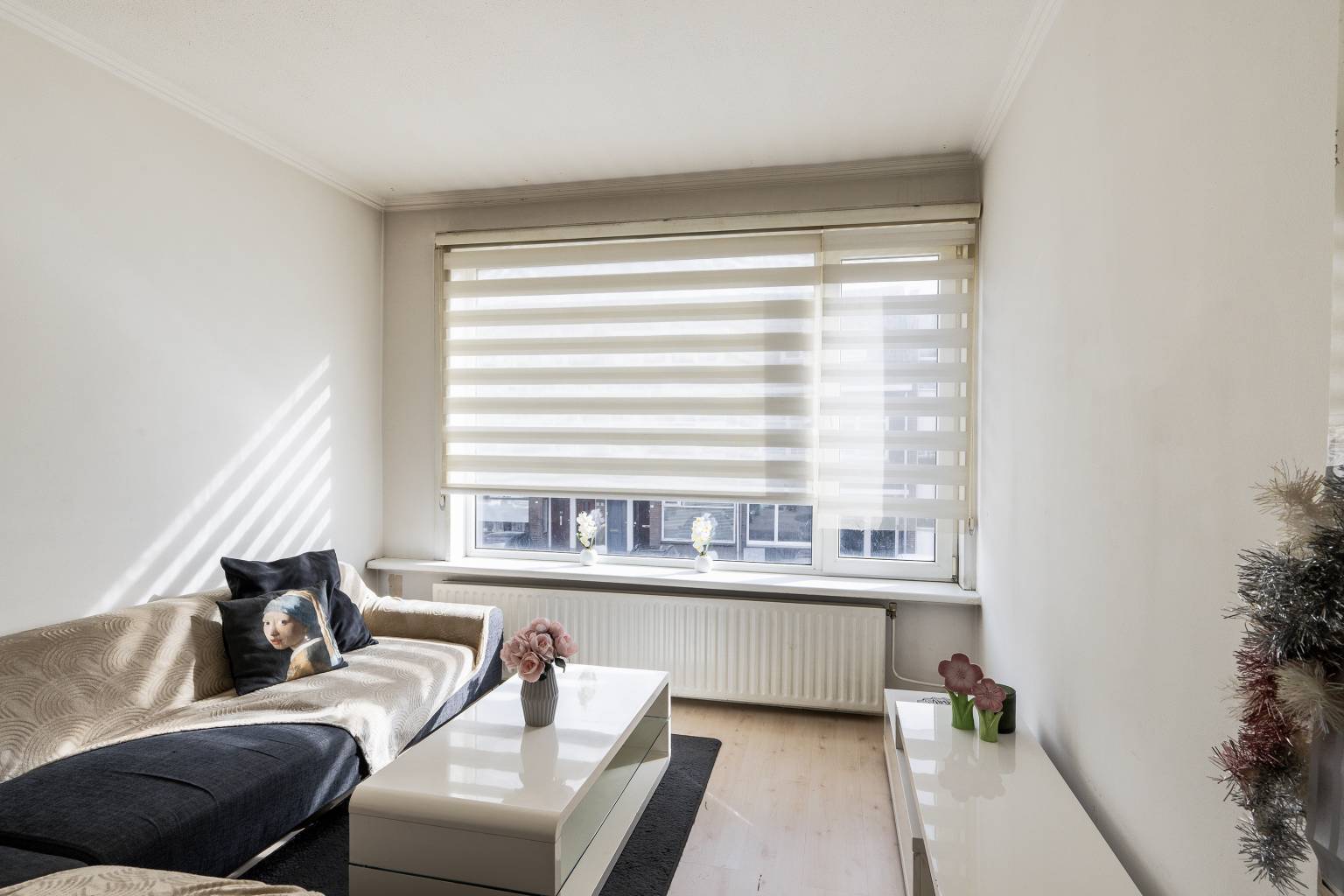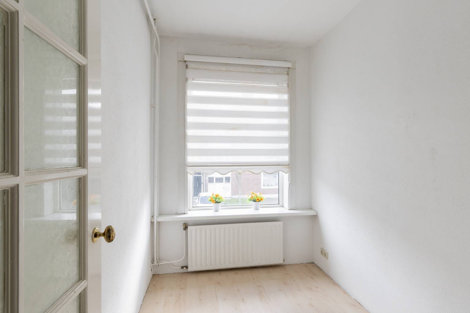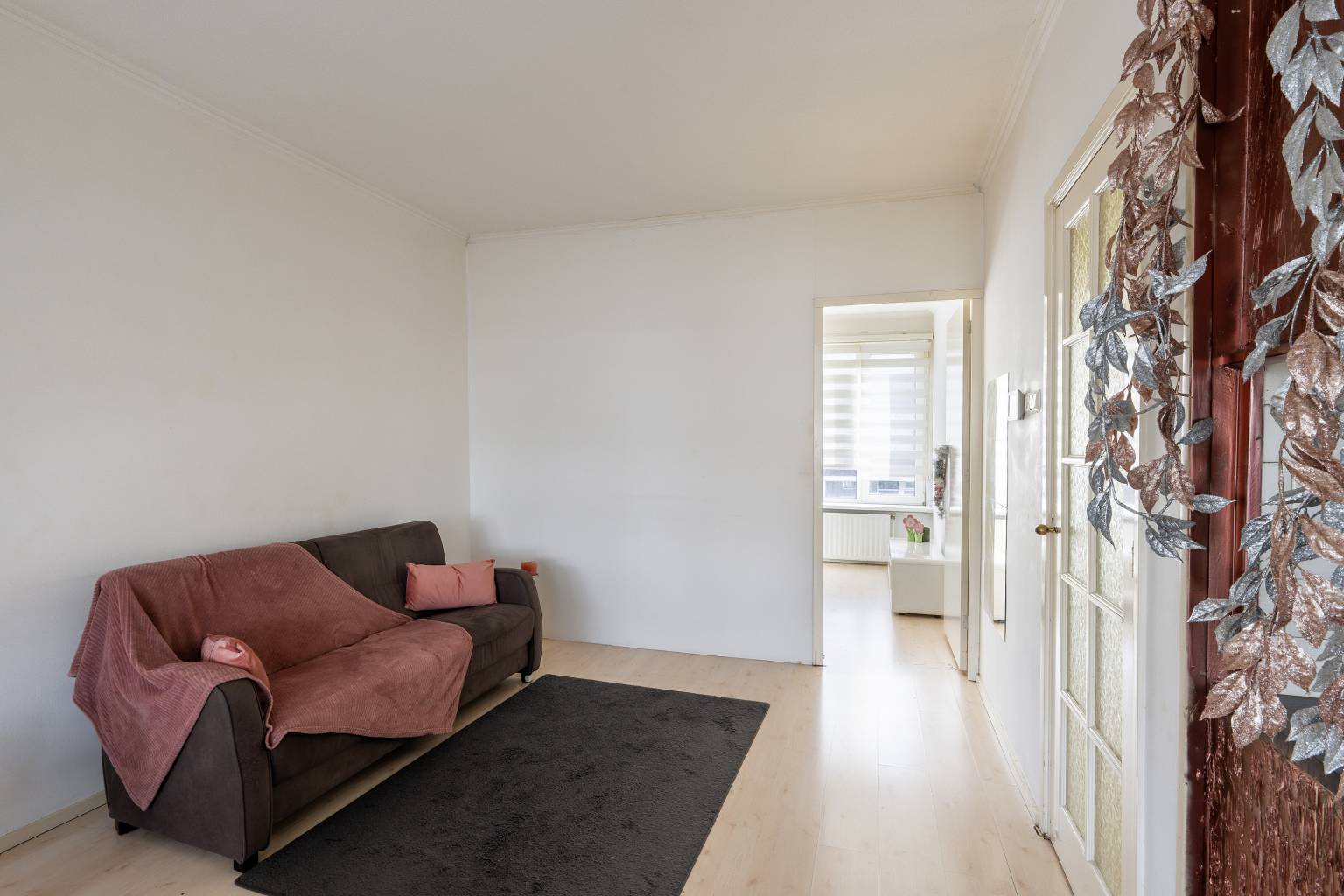 De woonkamer is gesitueerd aan de voorzijde en biedt uitzicht over de straat. Naar wens is deze ruimte bij de eetkamer te betrekken, of eventueel te gebruiken als slaapkamer. Ook hier zijn de wanden afgewerkt met pleisterwerk en ligt er een laminaatvloer.