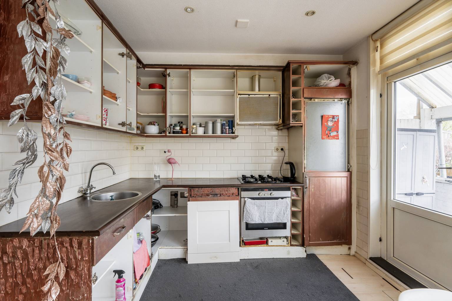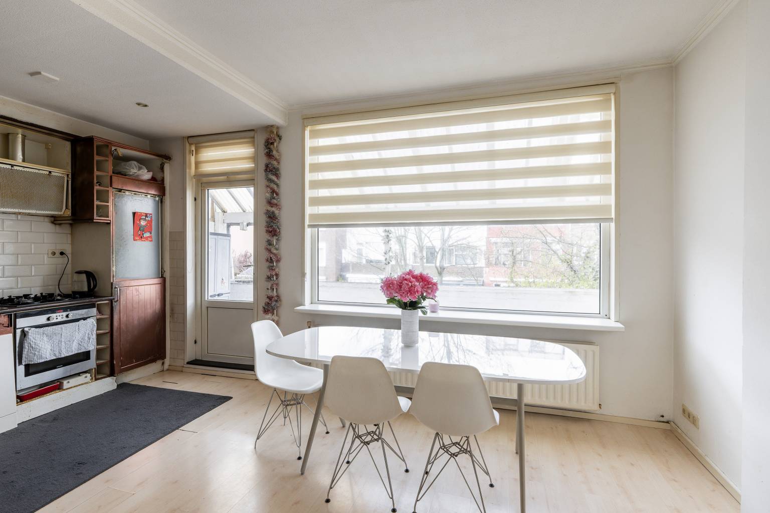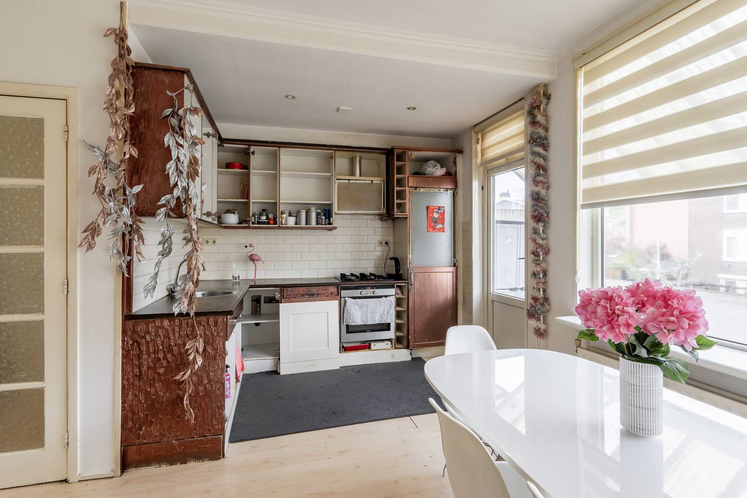 De riante eetkamer met open keuken, is ook wel een leefkeuken te noemen. Het biedt naast ruimte voor een eethoek, zelfs plek voor een kleine zithoek. De keuken behoeft enige aandacht, maar is praktisch opgesteld in een L-vorm met bovenkasten en een betegelde achterwand. Het plafond is voorzien van inbouw spots en vanuit hier is er toegang tot de woonkamer en het overdekte balkon aan de achterzijde. Alle wanden zijn afgewerkt met pleisterwerk en er ligt een laminaatvloer.