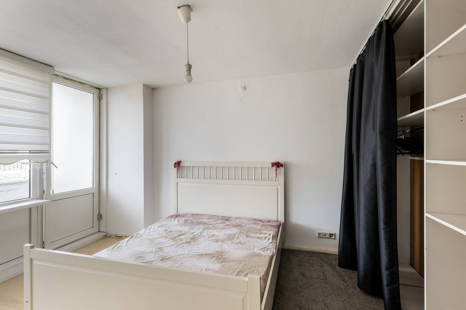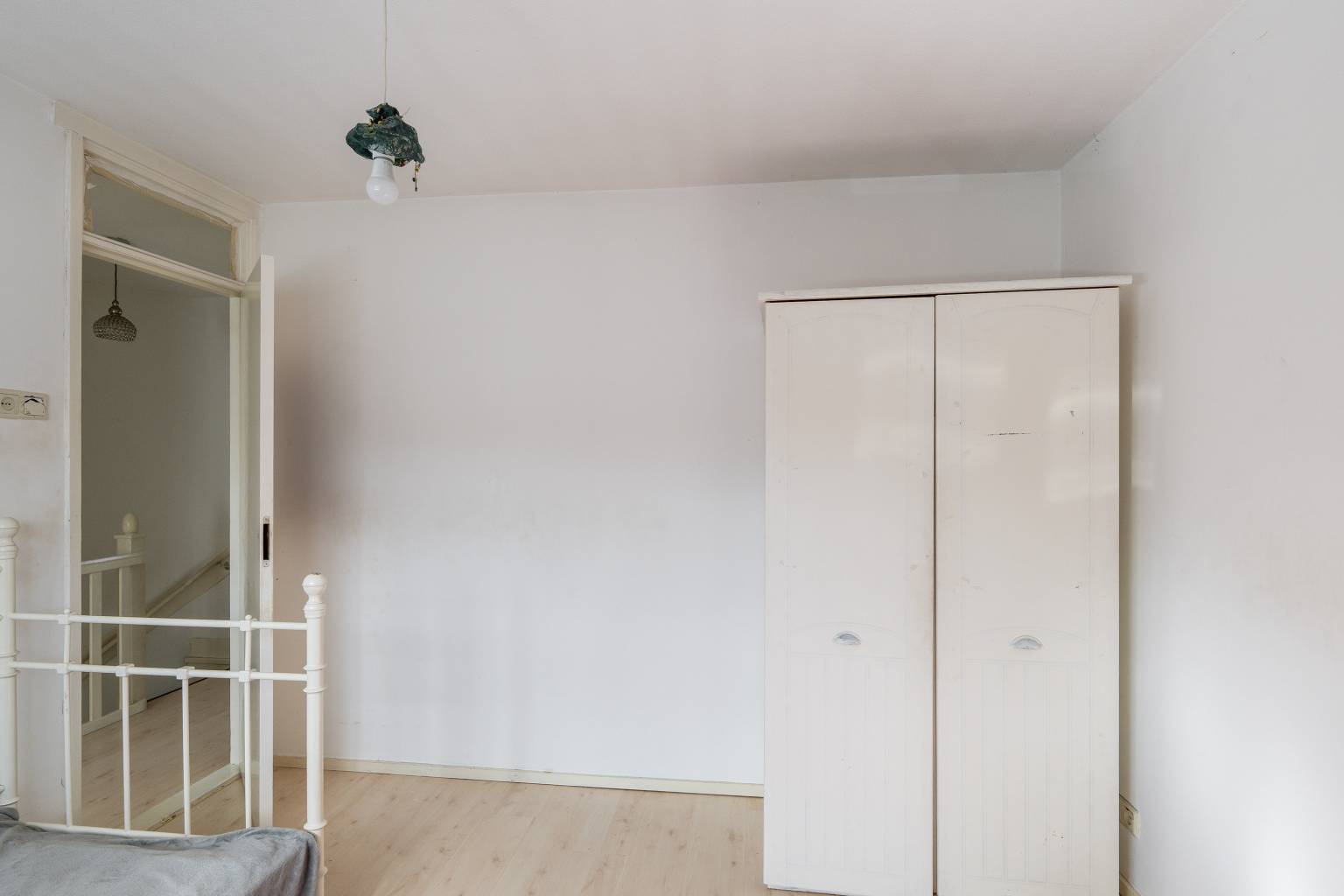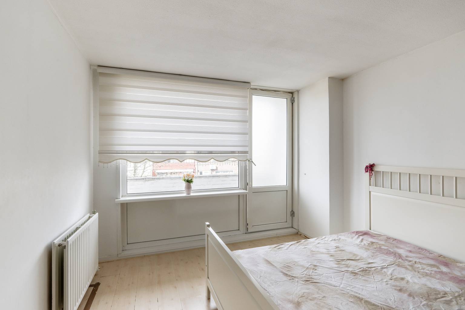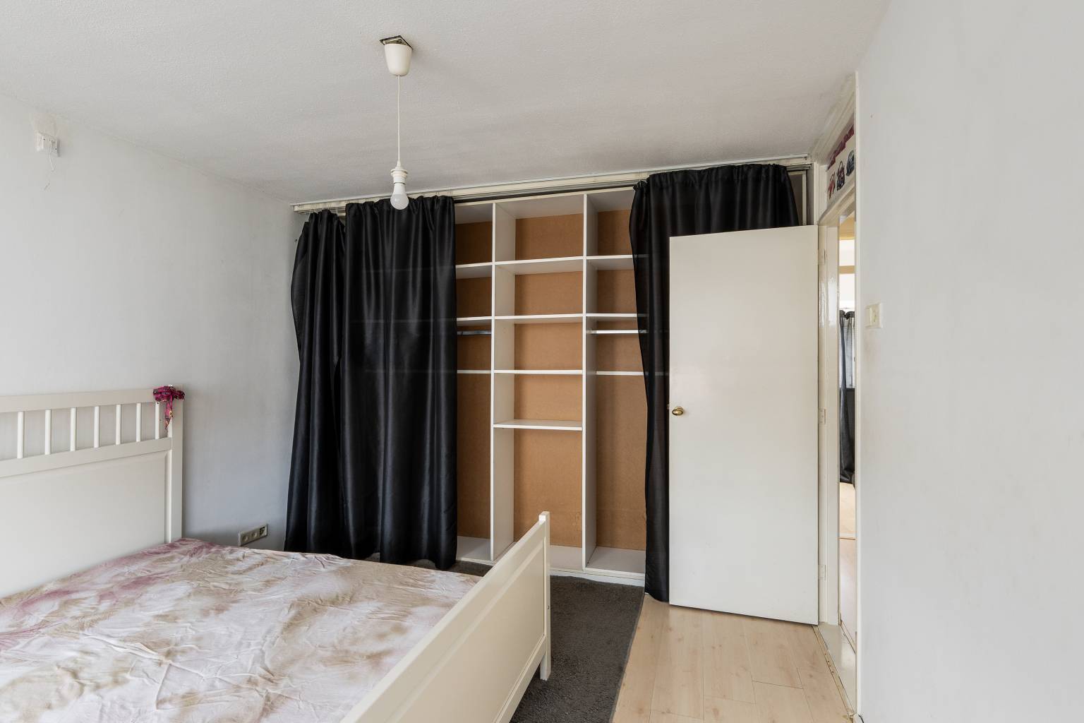 De eerste slaapkamer is gelegen naast de woonkamer en de wanden zijn hier afgewerkt met pleisterwerk en er ligt een laminaatvloer.