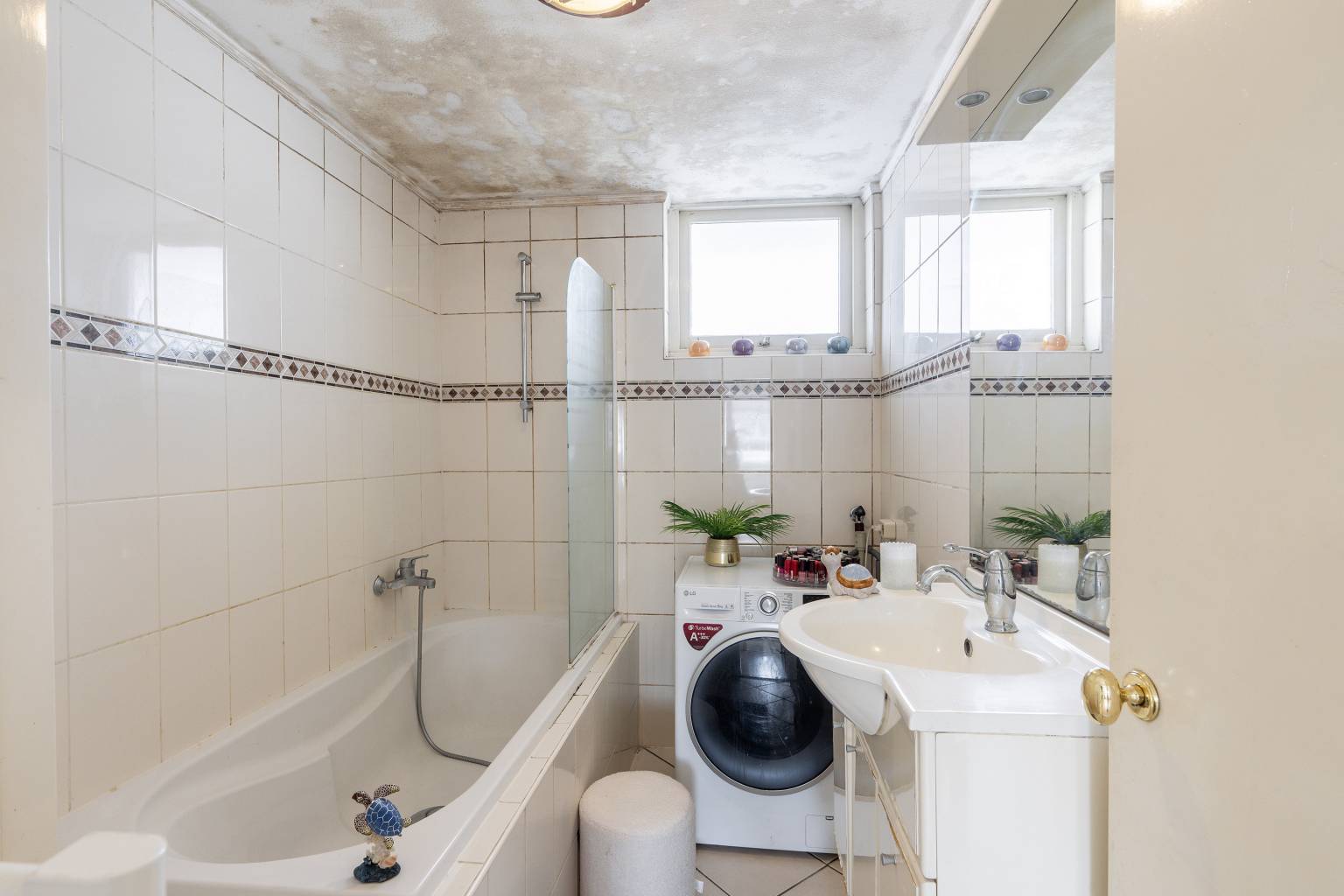De volledig betegelde badkamer is uitgerust met een ligbad met een douche, een wastafelmeubel met een spiegel en verlichting en een wasmachine aansluiting. Er is een aparte vaste kast met daarin de opstelling van de Cv-ketel en er is een raam aanwezig.