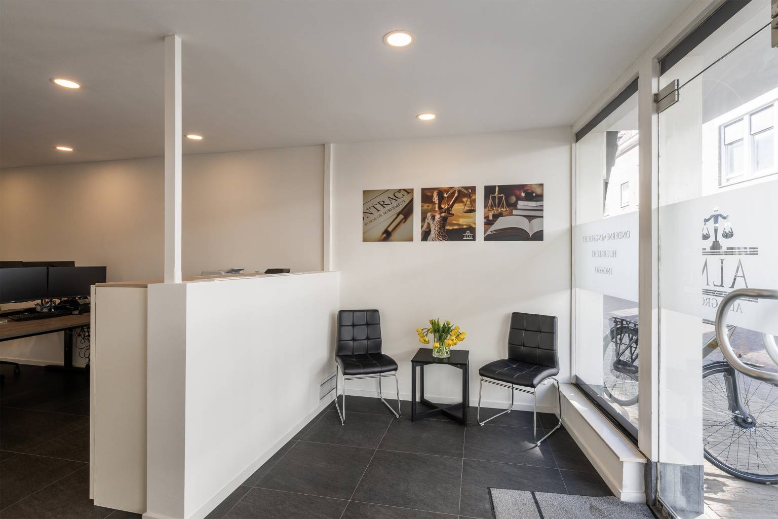 Vanaf de autoluwe Hoogstraat is er via glazen openslaande deuren toegang tot het pand. De ruimte op de begane grond is op dit moment in gebruik als kantoor en is netjes opgedeeld met een ontvangstruimte met daarachter werkplekken. Ook is er een aparte kantoorkamer, die toegankelijk is via een glazen deur. Hier is een grote open kastenwand geplaatst, met daaronder schuifdeurtjes en er hangt airconditioning. Er is een volledig betegeld toilet aanwezig en de meterkast bevindt zich aan de voorzijde bij de glazen pui. Er is een afsluitbare pantry en er is een deur naar de hal met de trapopgang naar de 1e woonverdieping. De ruimte is volledig voorzien van een tegelvloer, de wanden zijn gestuukt en het plafond is voorzien van inbouw spots.