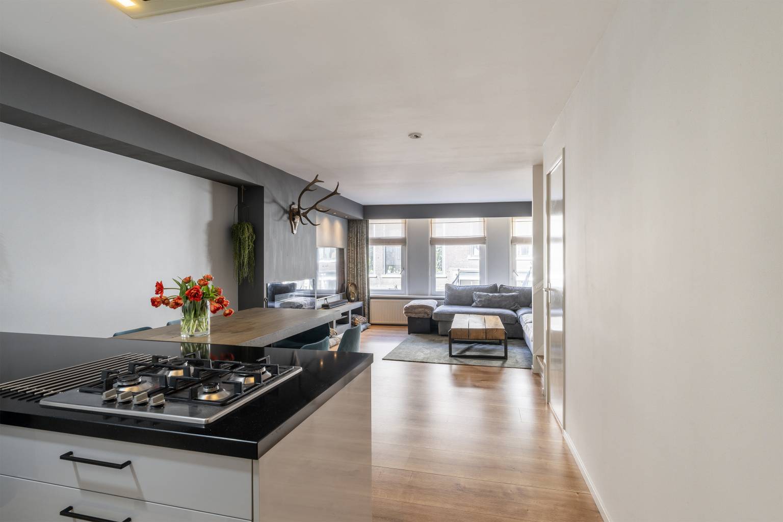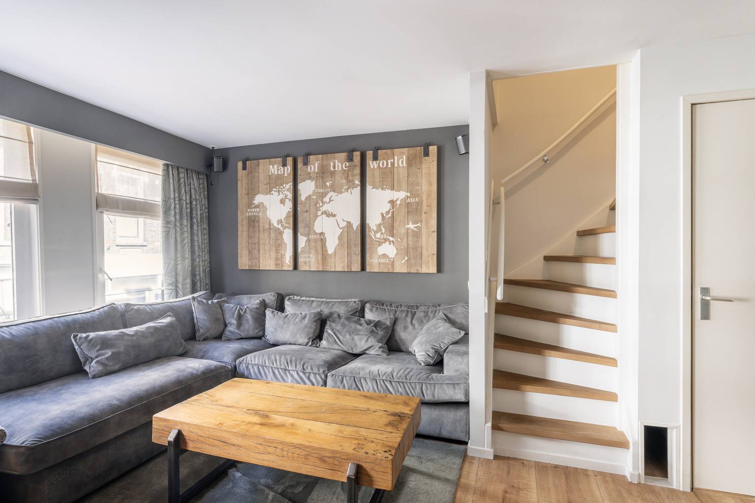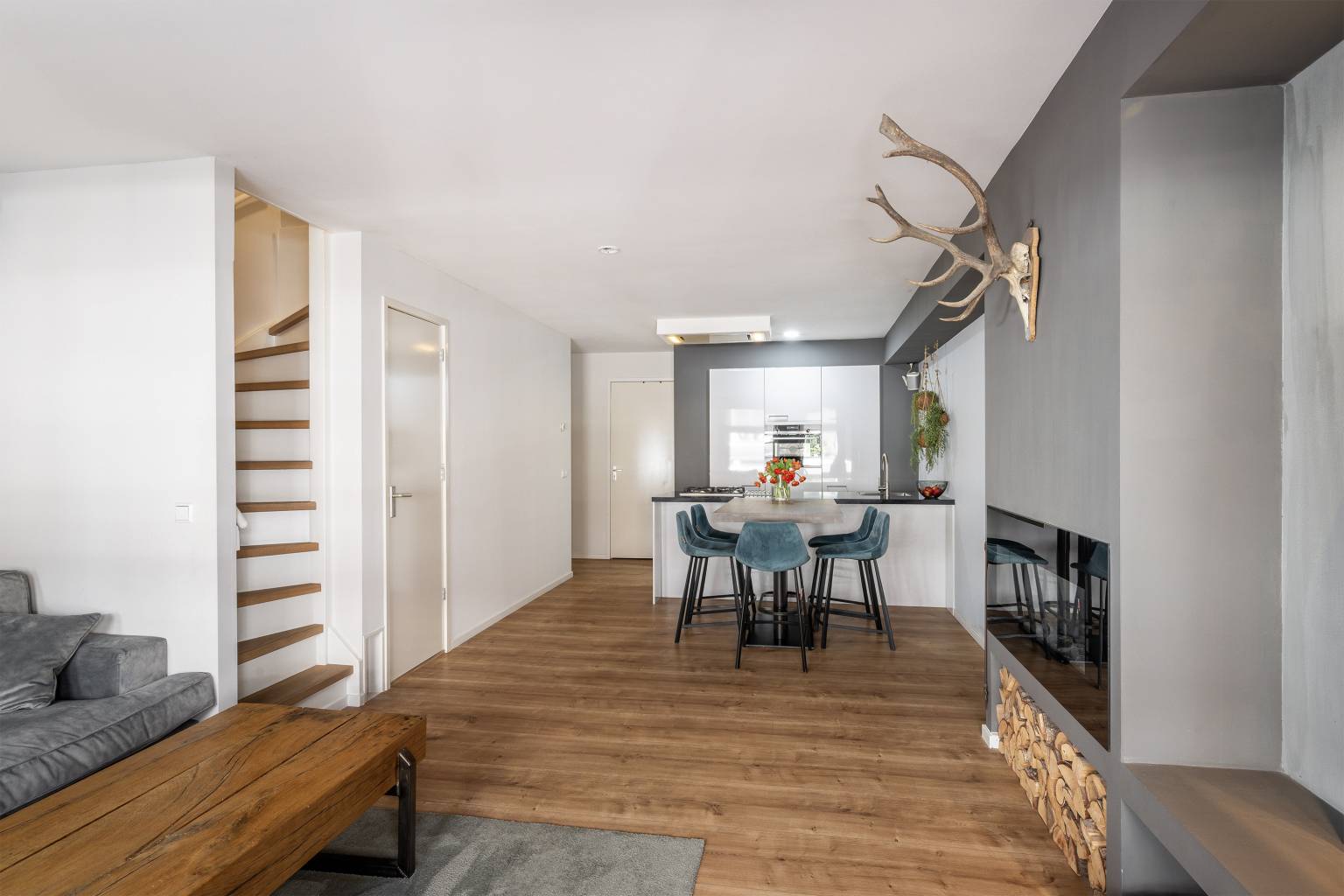 Na de afsluitbare trapopgang is er een bovenkomst in de open keuken, die in verbinding staat met de woonkamer. De keuken beschikt over een kastenwand en een kookeiland. Er is diverse apparatuur aanwezig en de afzuigkap met verlichting is geïntegreerd in het plafond. De zithoek is gesitueerd aan de voorzijde en heeft drie hoge ramen, die uitzicht geven over de Hoogstraat. Er is een mooie wand gemaakt, waarin de haard is verwerkt en de nis is voorzien van inbouw spots. De trap naar de 2e verdieping is dichtgezet, maar heeft wel een open toegang met daarnaast een trapkast. Tevens is er vanuit de keuken een deur naar de eerste slaapkamer. Alle wanden en het plafond zijn gestuukt en op de vloer ligt laminaat.