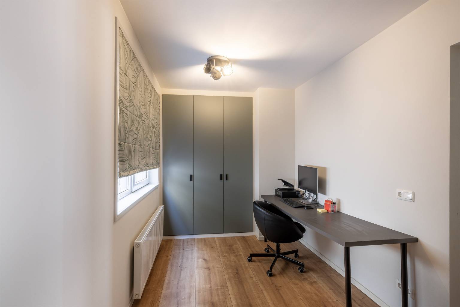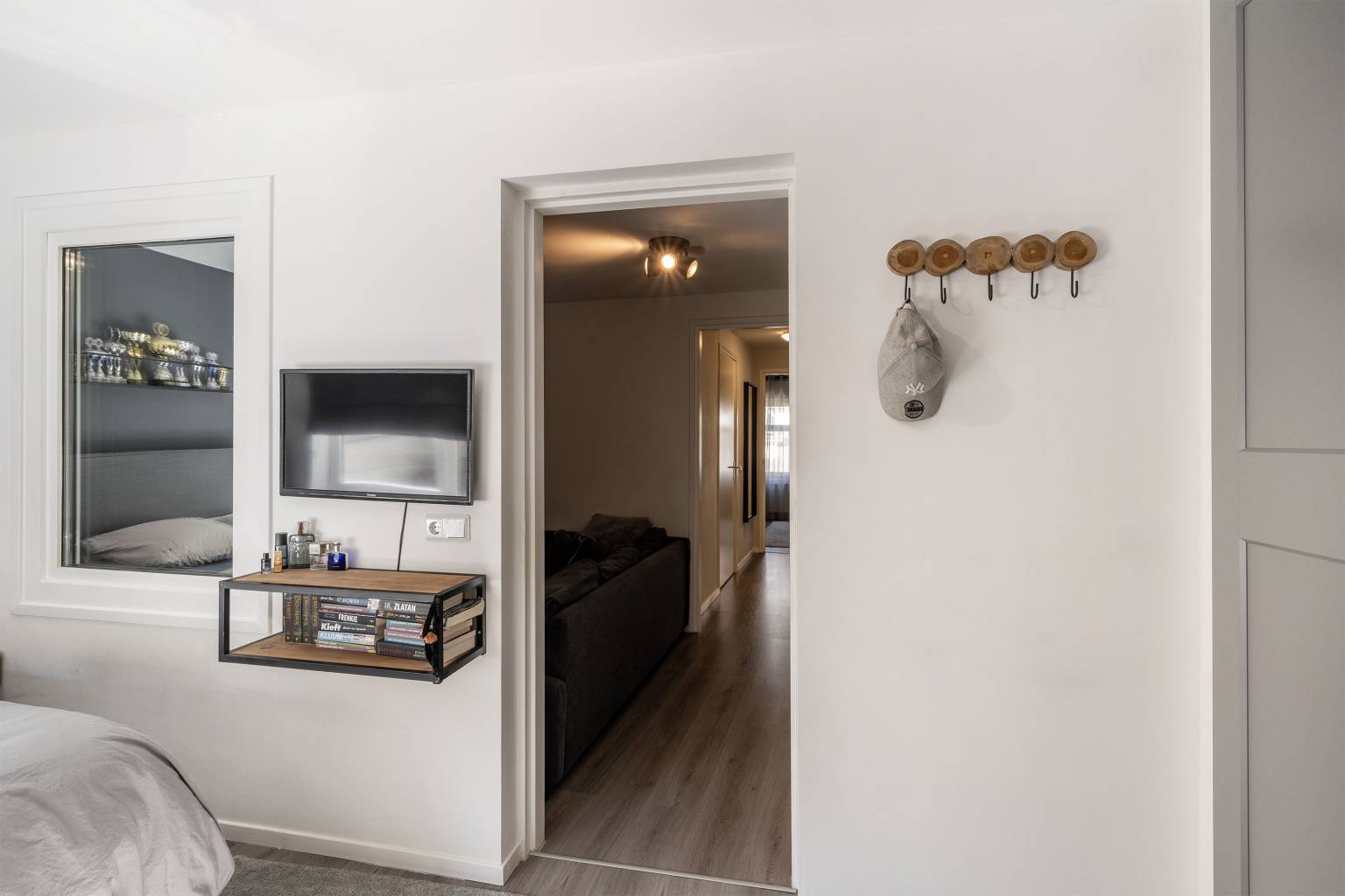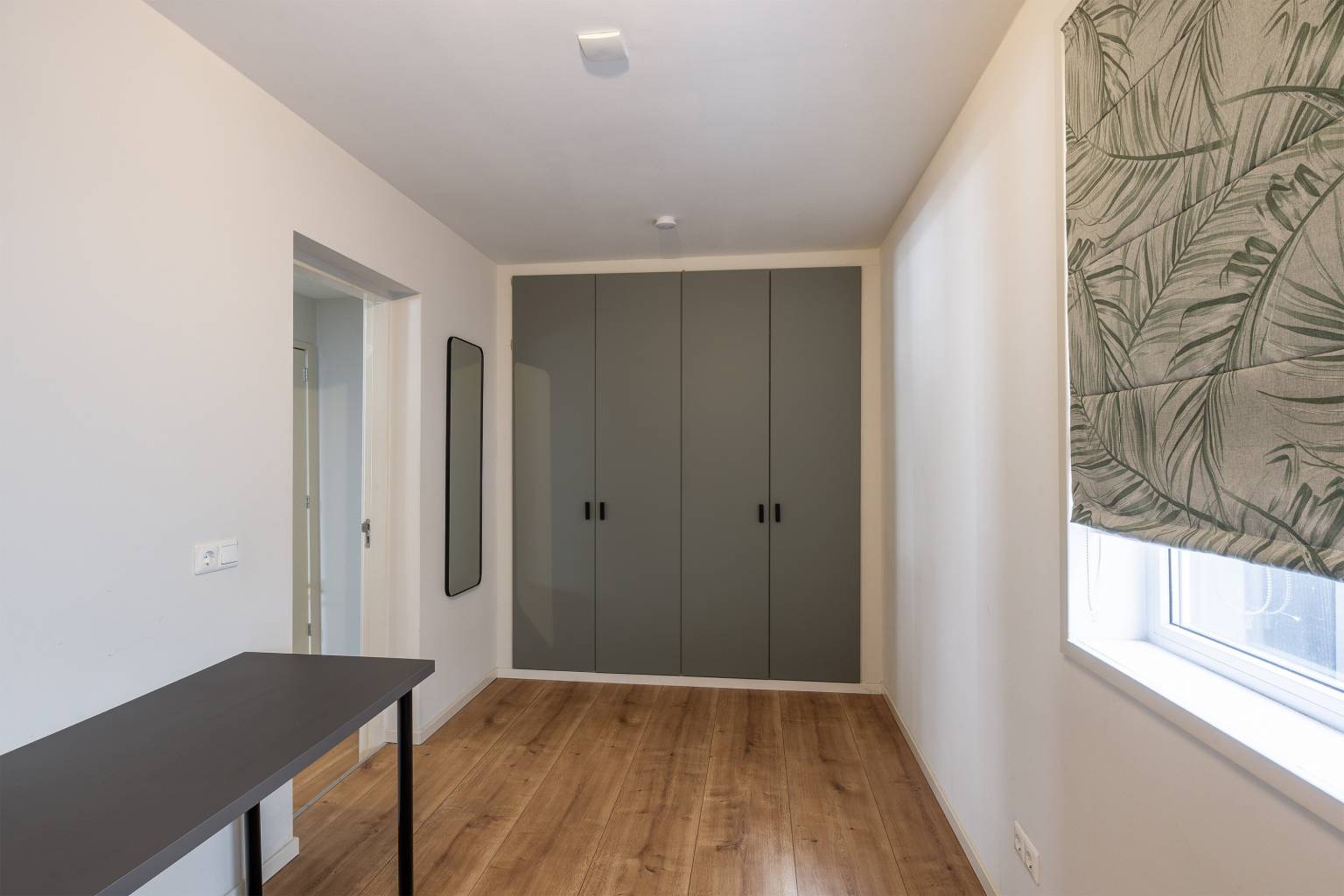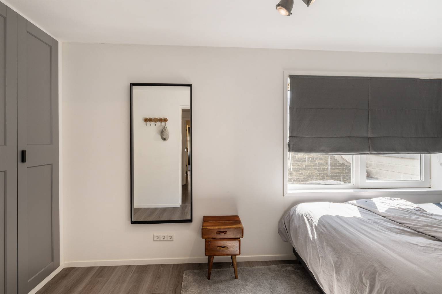 De derde slaapkamer is gelegen aan de achterzijde en beschikt over een vaste kastenwand en een raam, dat zorgt voor een doorkijk naar de zitkamer.