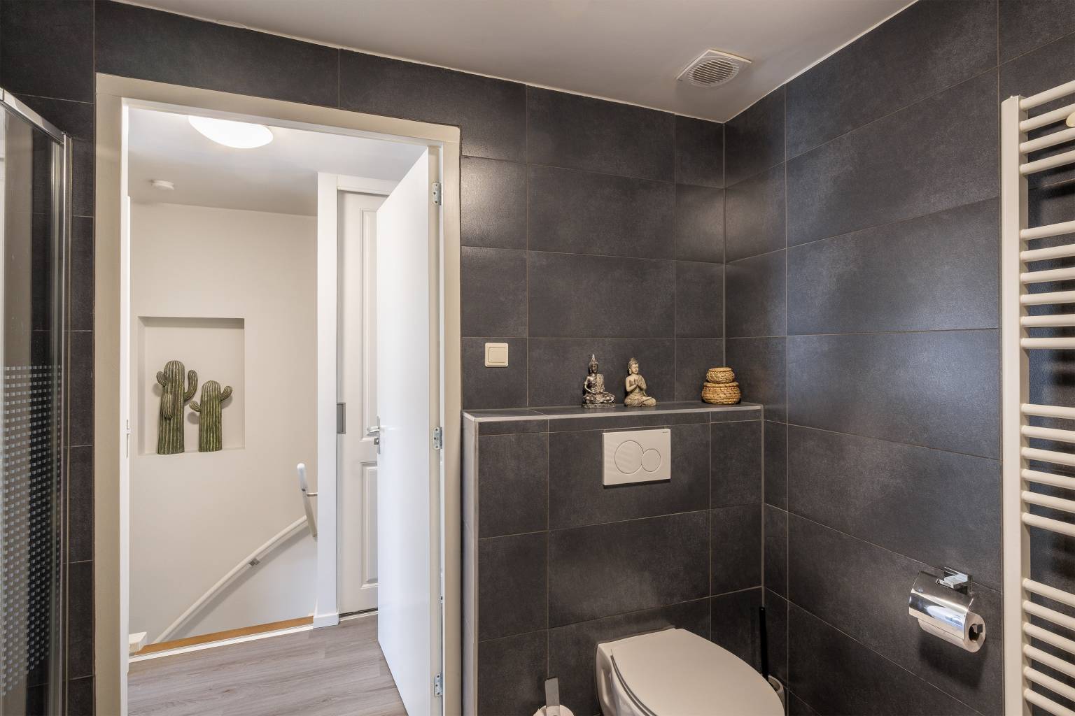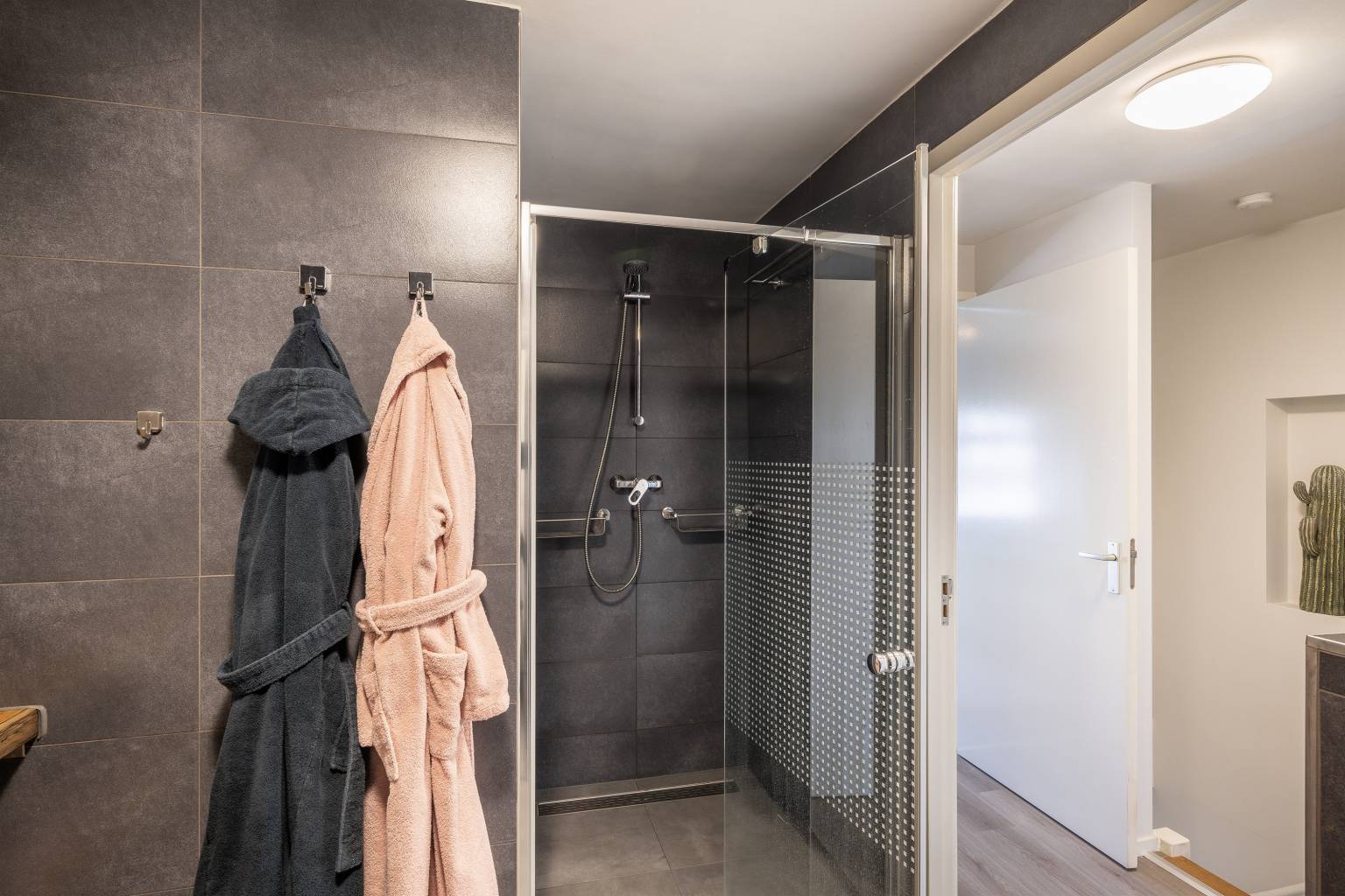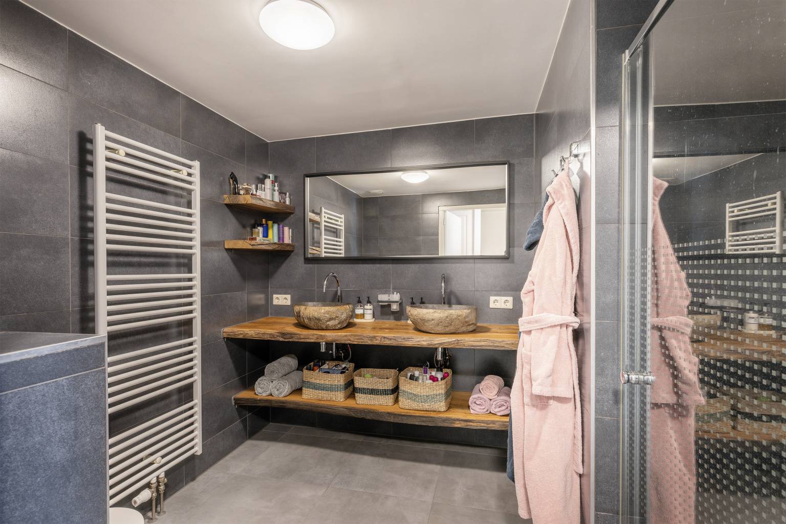 De inpandige badkamer is volledig betegeld en compleet uitgerust met een douchecabine, een toilet, een handdoeken radiator en een houten wastafelmeubel met twee waskommen.