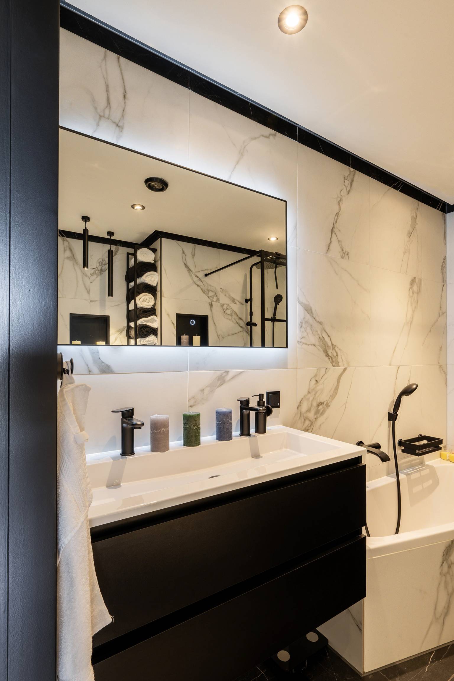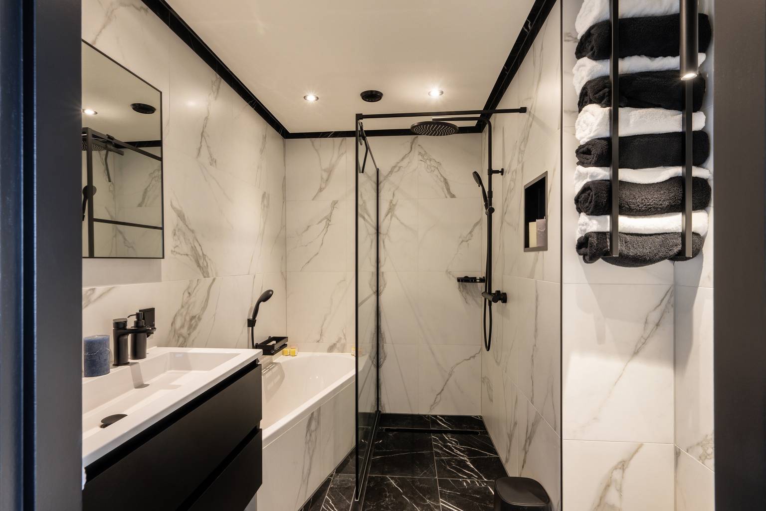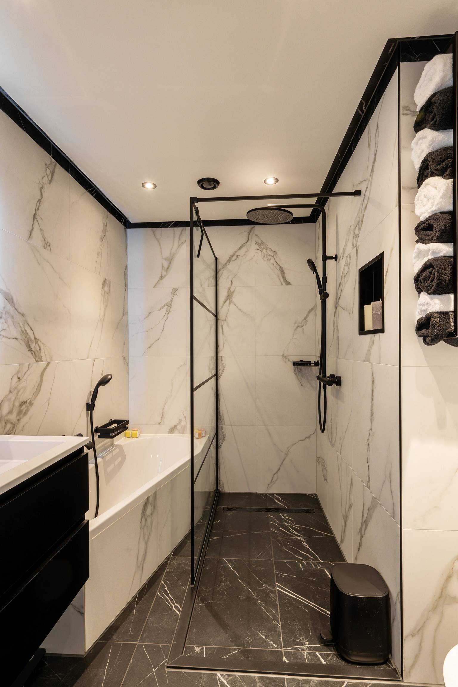 De badkamer is afgewerkt in dezelfde stijl als het toilet en is compleet uitgerust met een ligbad, een inloopdouche, een wastafelmeubel en een toilet. Er is een nis voor badproducten en het plafond beschikt over inbouw spots.