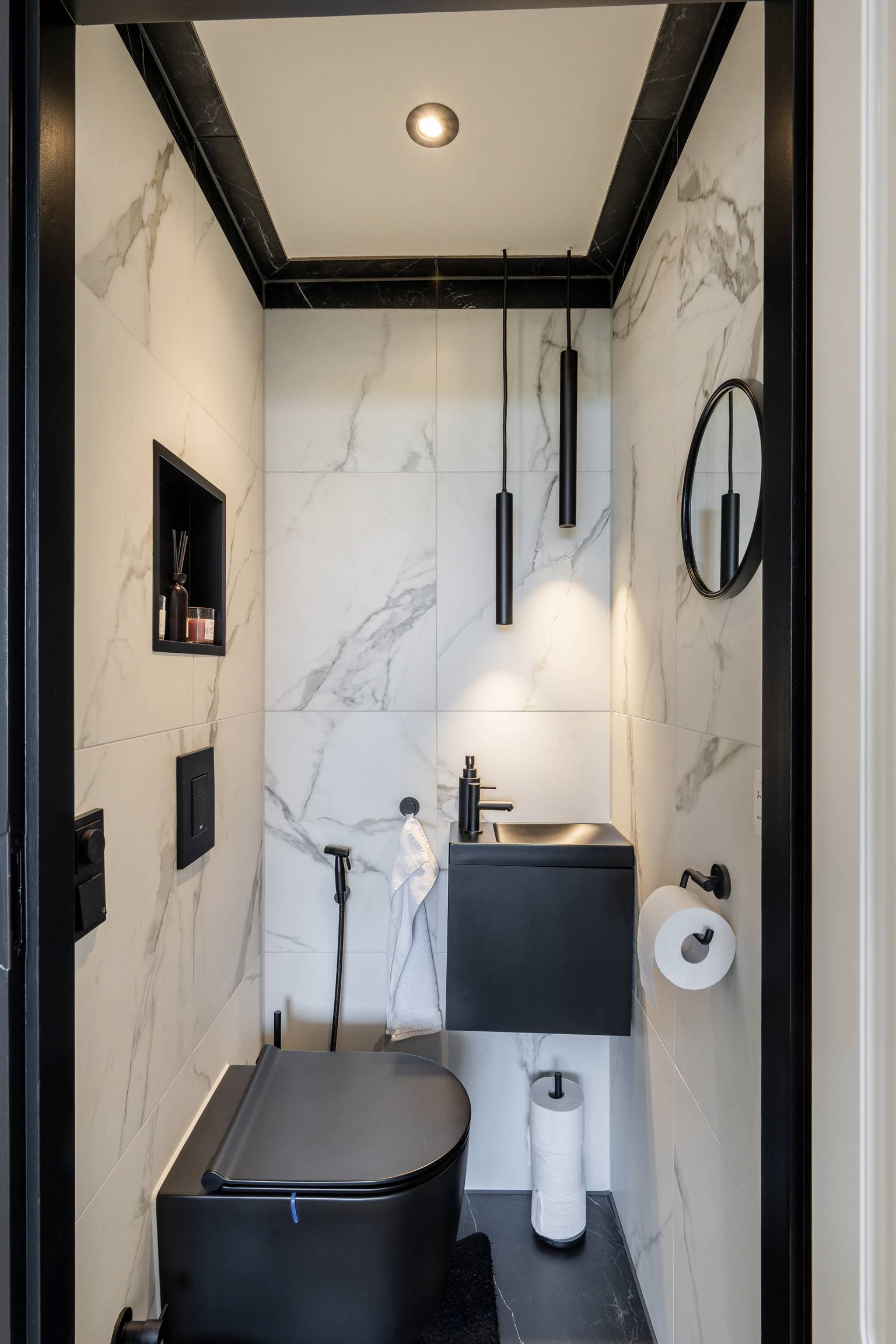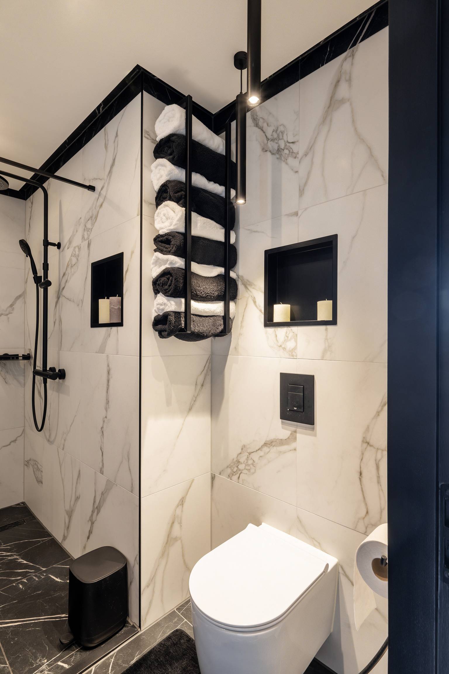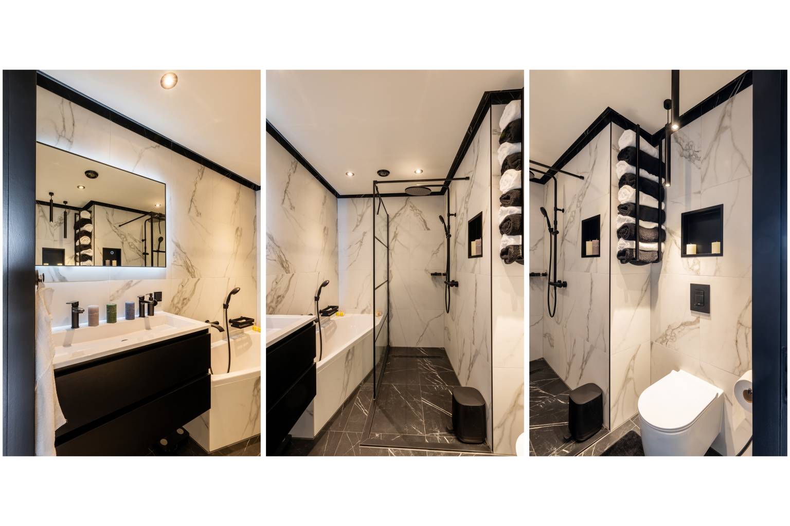De badkamer is afgewerkt in dezelfde stijl als het toilet en is compleet uitgerust met een ligbad, een inloopdouche, een wastafelmeubel en een toilet. Er is een nis voor badproducten en het plafond beschikt over inbouw spots.