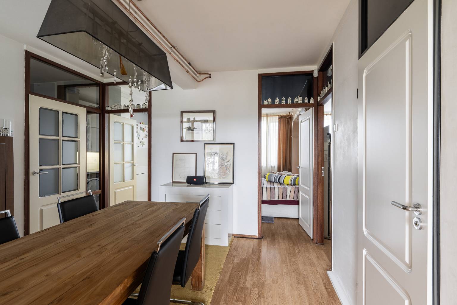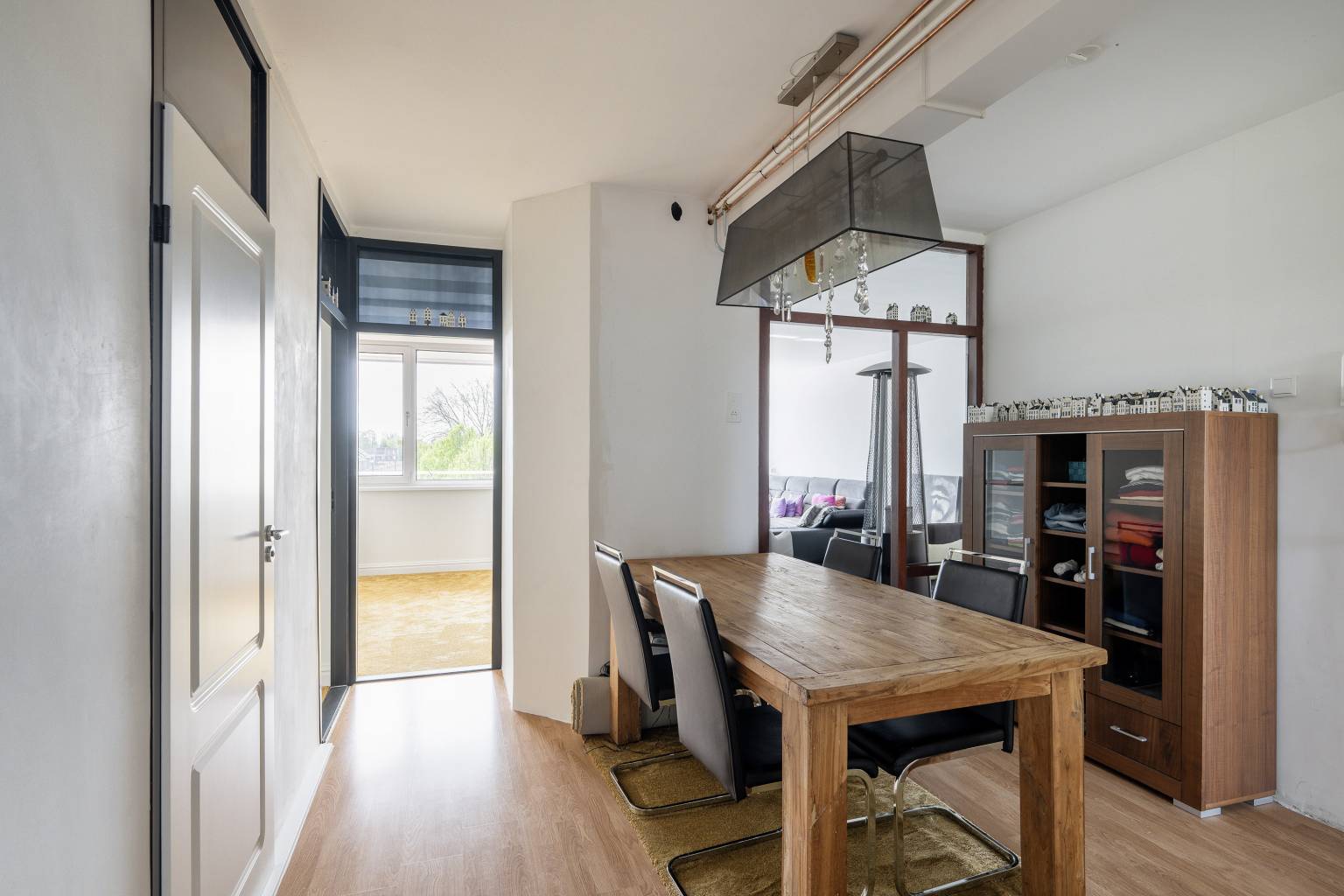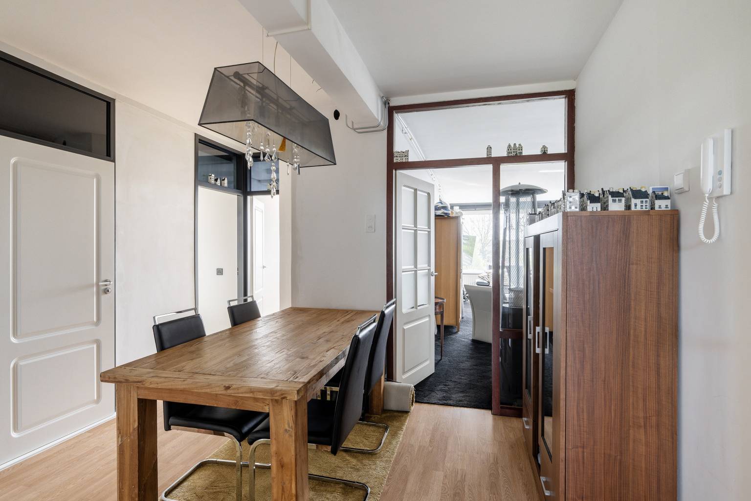 Na de voordeur is er een binnenkomst in de afsluitbare entreehal met meterkast, die vervolgens toegang geeft tot de aangrenzende hal. Deze is op dit moment in gebruik als eetkamer en zorgt voor een toegang tot de woonkamer, de keuken, de badkamer en drie slaapkamers. De wanden zijn hier gestuukt en er ligt een laminaatvloer.