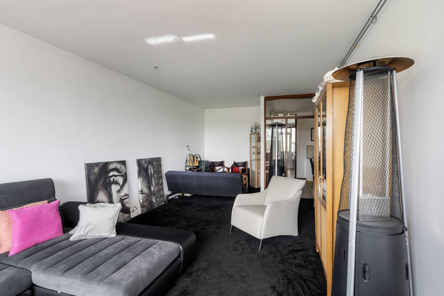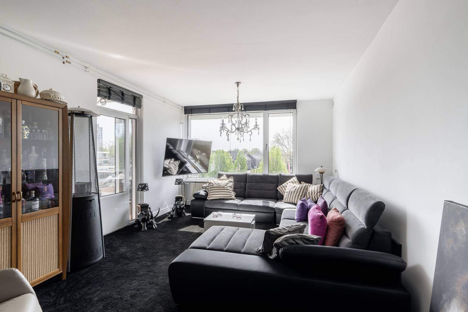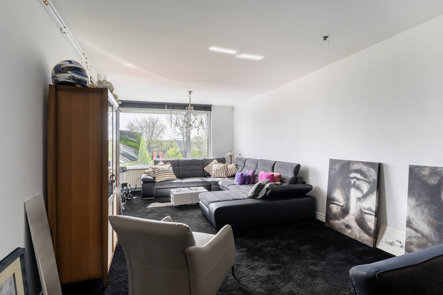 De woonkamer heeft een zithoek bij het raam en in de nis is er eventueel ruimte voor een eethoek. Er is een deur naar het balkon, de wanden zijn gestuukt en er ligt vloerbedekking.