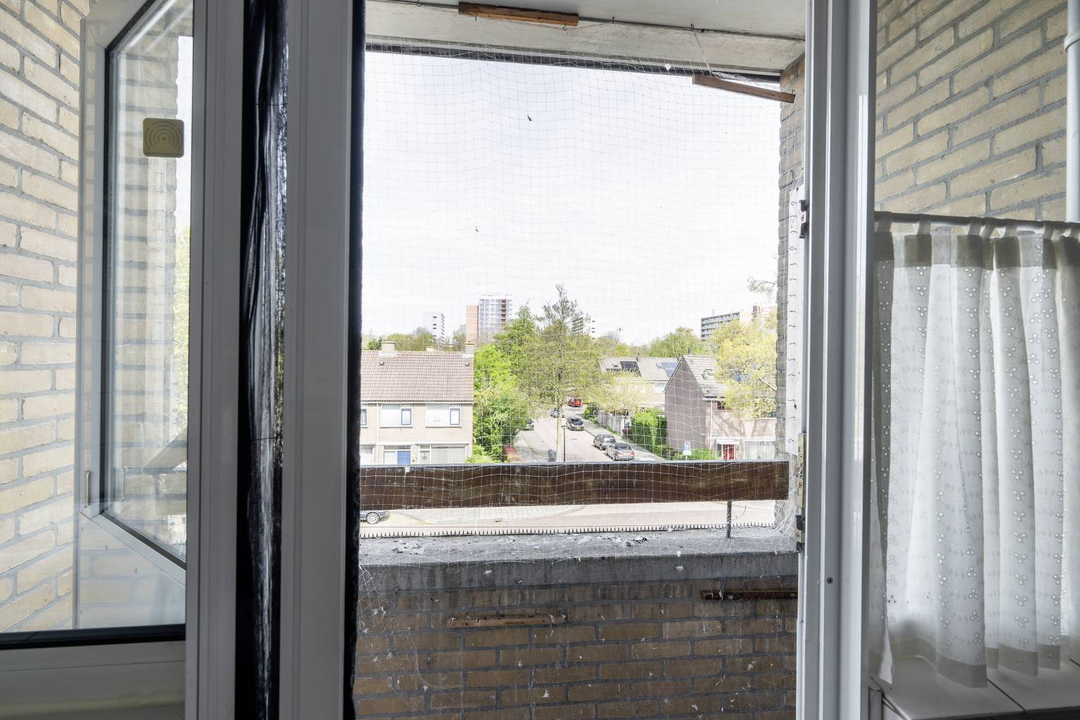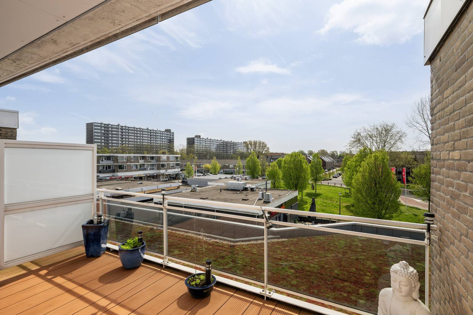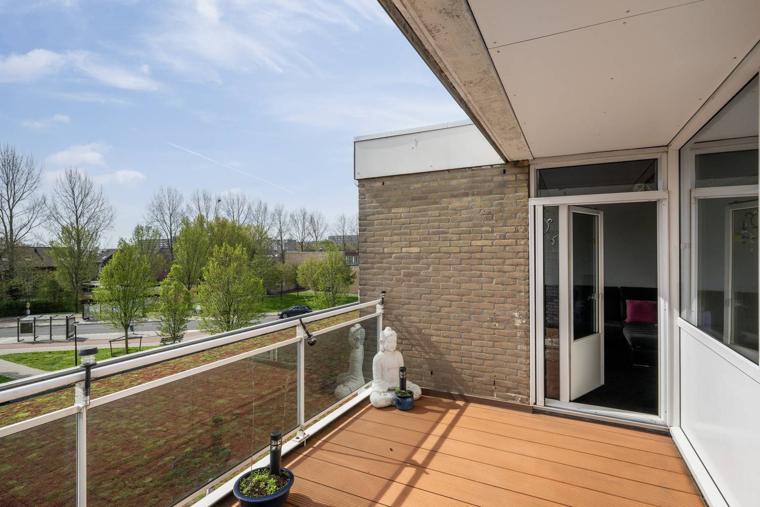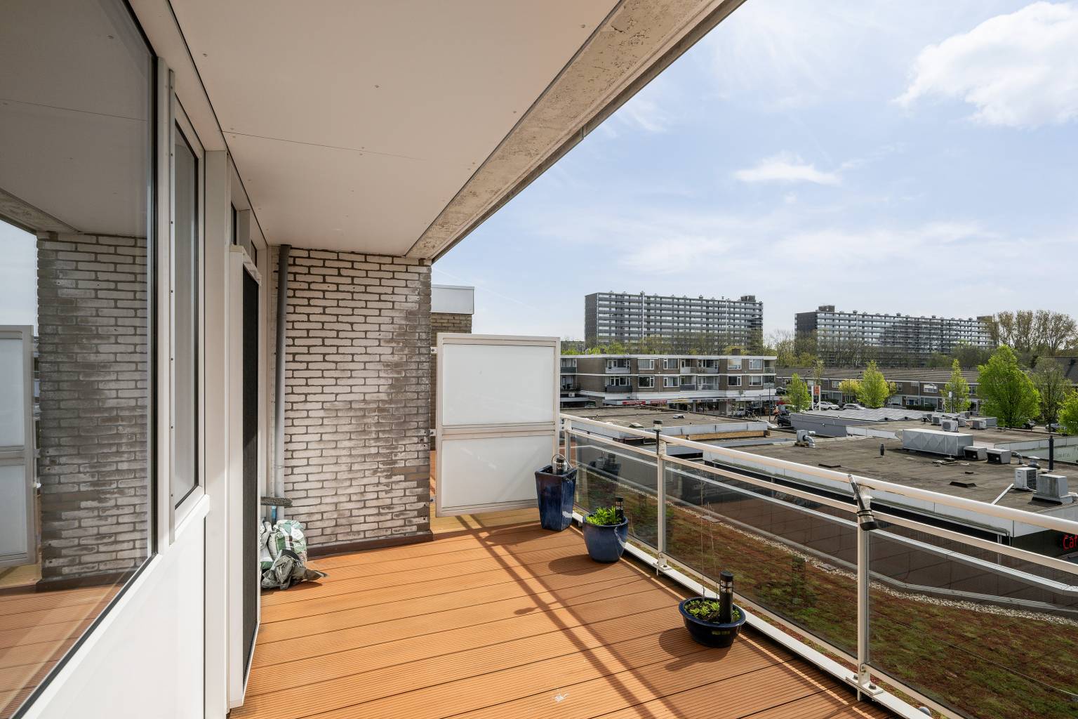 Het balkon is deels overdekt en biedt uitzicht over de wijk. De ondergrond is bedekt met vlonderplanken en de balustrade is voorzien van glazen panelen.