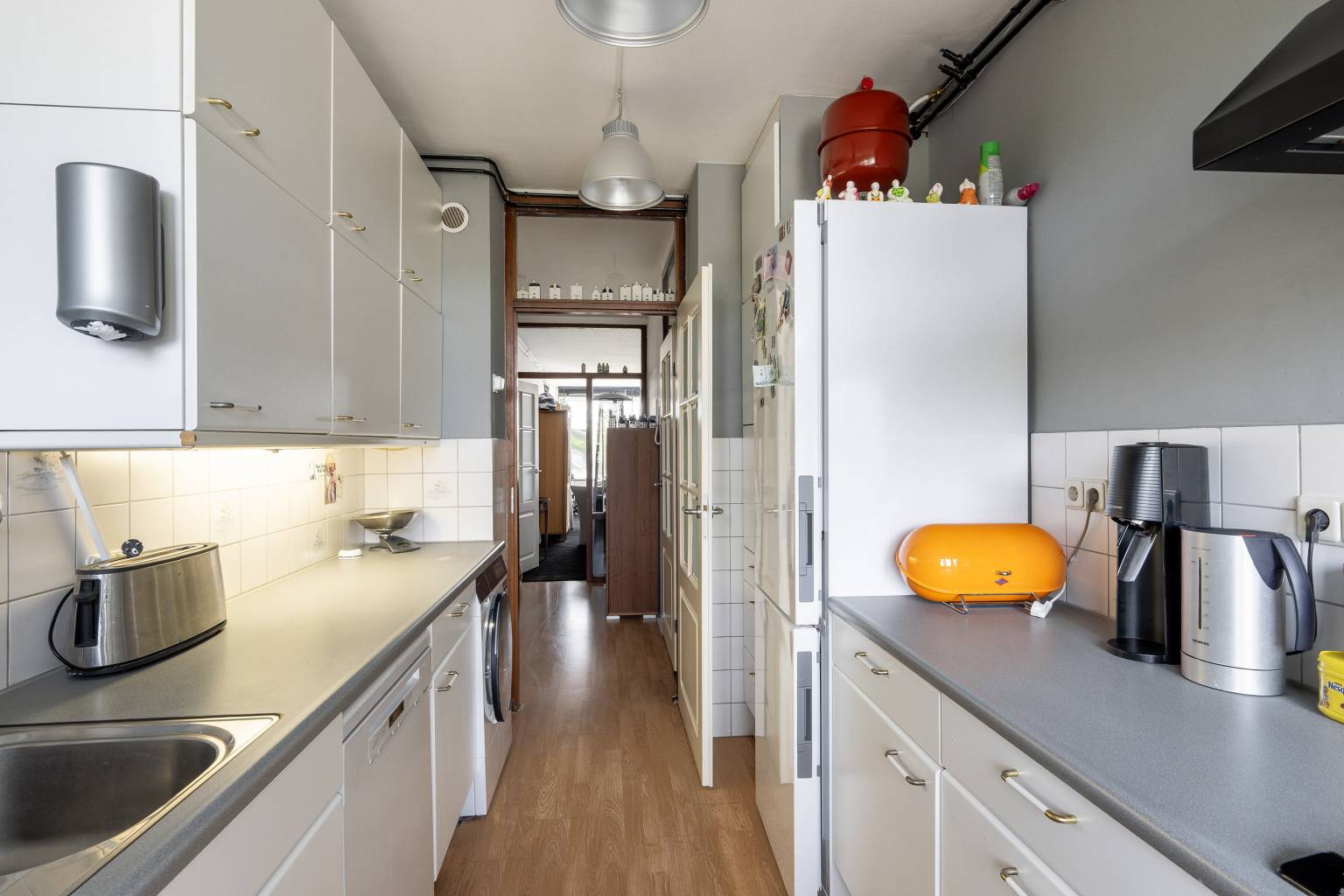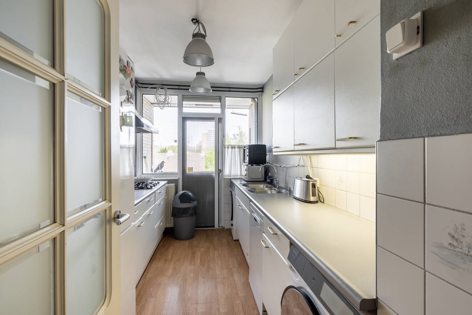 De keuken is gelegen aan de andere zijde en beschikt over twee rechte keukenblokken, die tegenover elkaar zijn geplaatst. De achterwanden zijn deels betegeld en er is diverse apparatuur aanwezig. De vloer is voorzien van laminaat en er is een deur met een hordeur naar het tweede balkon. Deze is volledig overdekt en heeft eveneens een vrij uitzicht over de wijk.