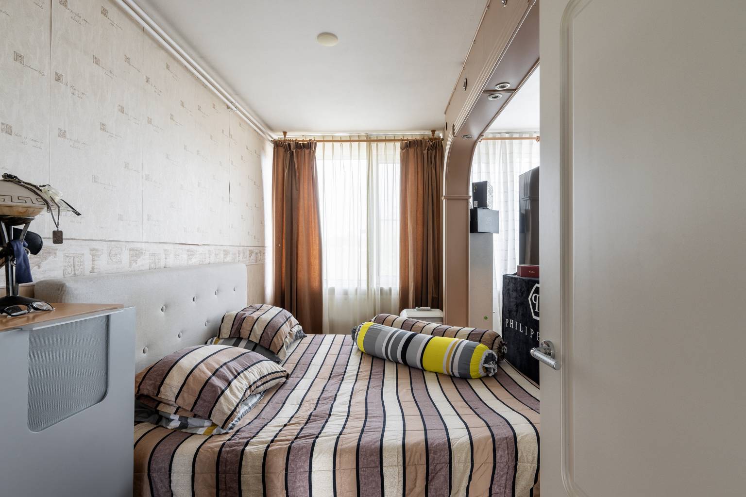 De hoofdslaapkamer is gelegen naast de keuken en bestond oorspronkelijk uit twee kamers. Doordat deze nu zijn samengevoegd is er een extra grote kamer ontstaan, die eventueel gemakkelijk weer is terug te brengen naar twee kamers. Op de scheiding is een toog gemaakt met inbouw spots en er staat een 2-persoons, vrijstaande, douchecabine. De wanden zijn deels behangen en er ligt een laminaatvloer. De tweede slaapkamer is gelegen naast de woonkamer en is strak afgewerkt met gestuukte wanden en inbouw spots. Deze kamer beschikt over een eigen ingebouwde douchecabine en op de vloer ligt vloerbedekking. De derde slaapkamer heeft dezelfde afwerking als de tweede slaapkamer en heeft naast de toegang tot het balkon ook toegang tot het volledig betegelde toilet.