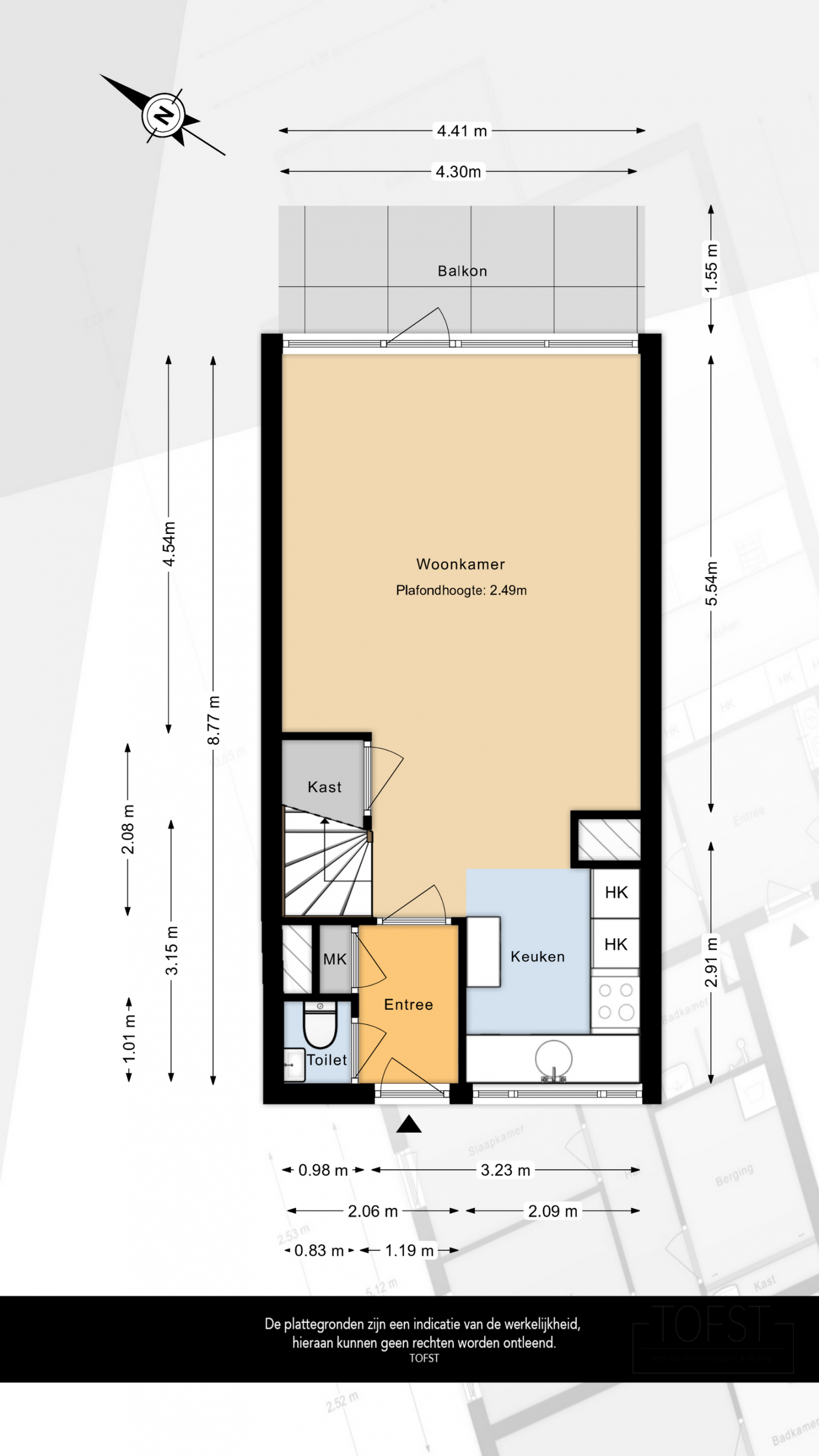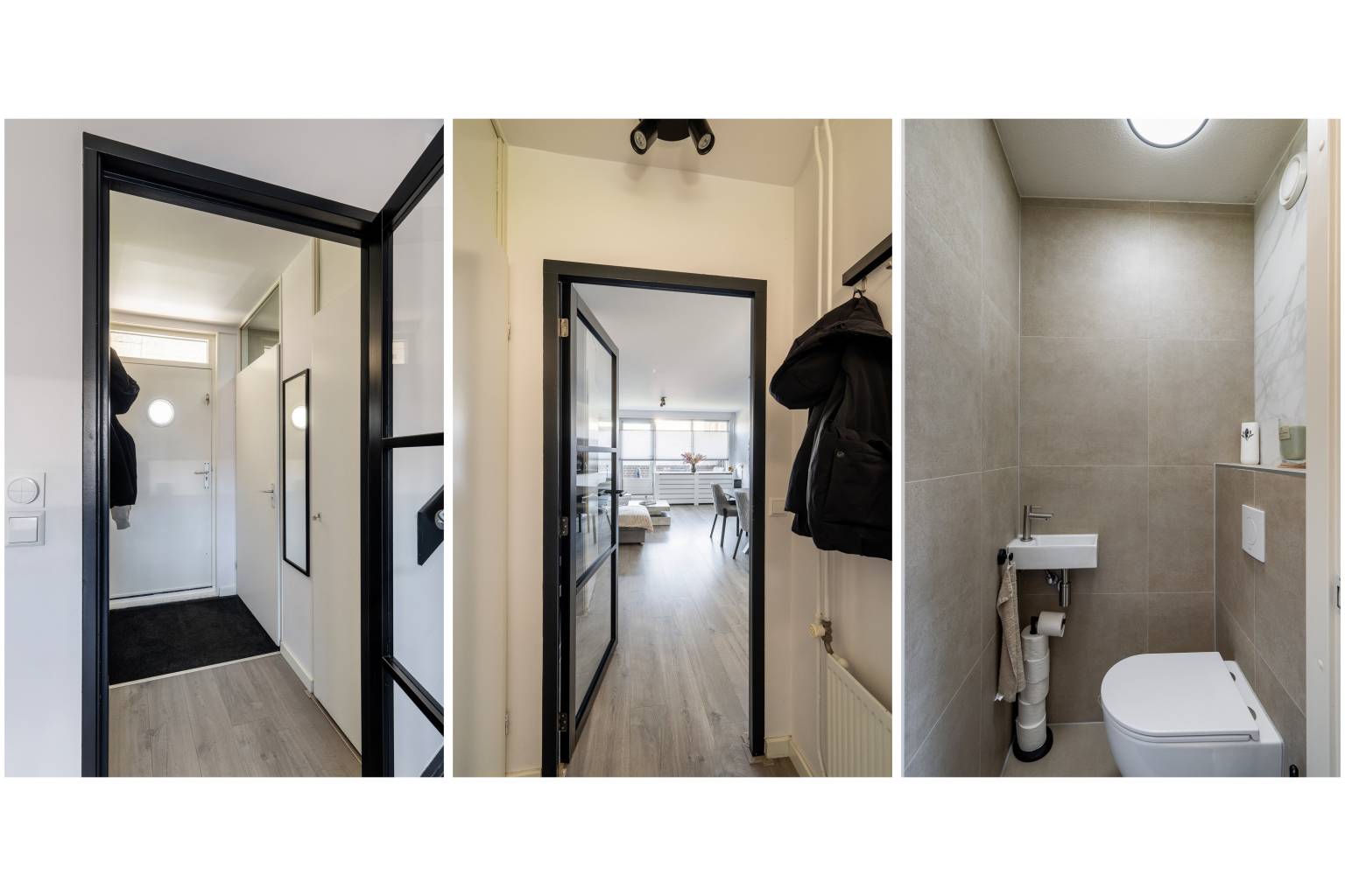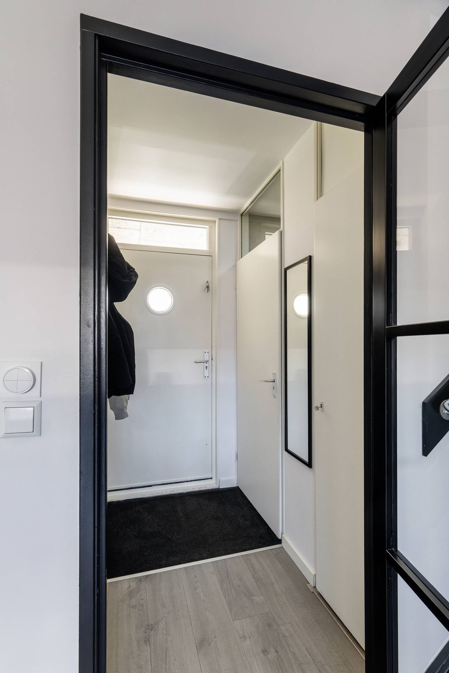 Na de voordeur is er een binnenkomst in de afsluitbare entreehal met de meterkast en het volledig betegelde toilet. Achter de voordeur ligt een schoonloopmat met aansluitend een laminaatvloer, die is doorgetrokken naar de woonkamer.