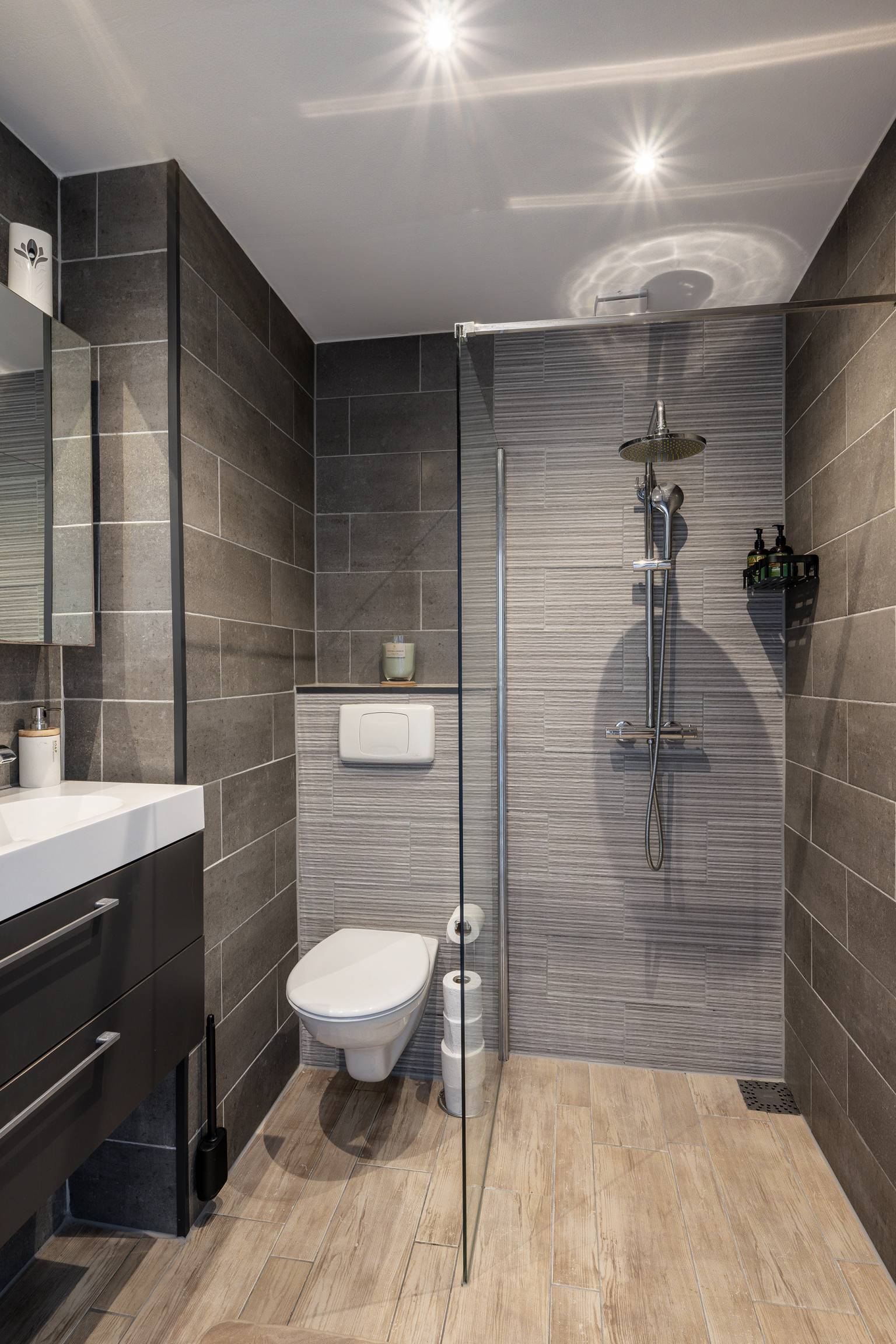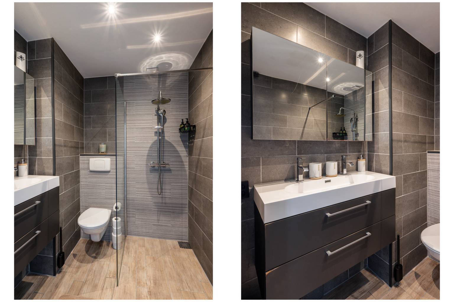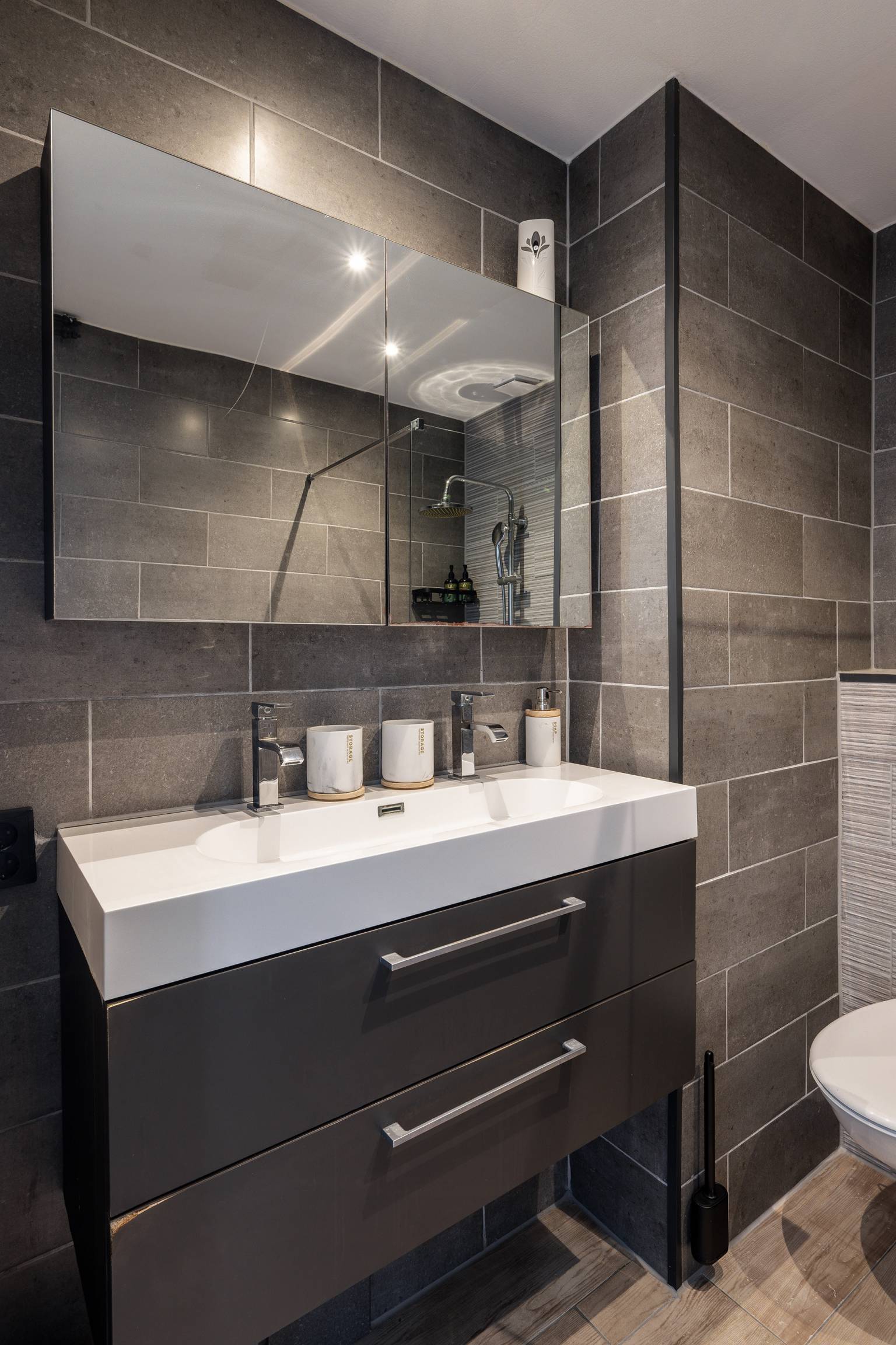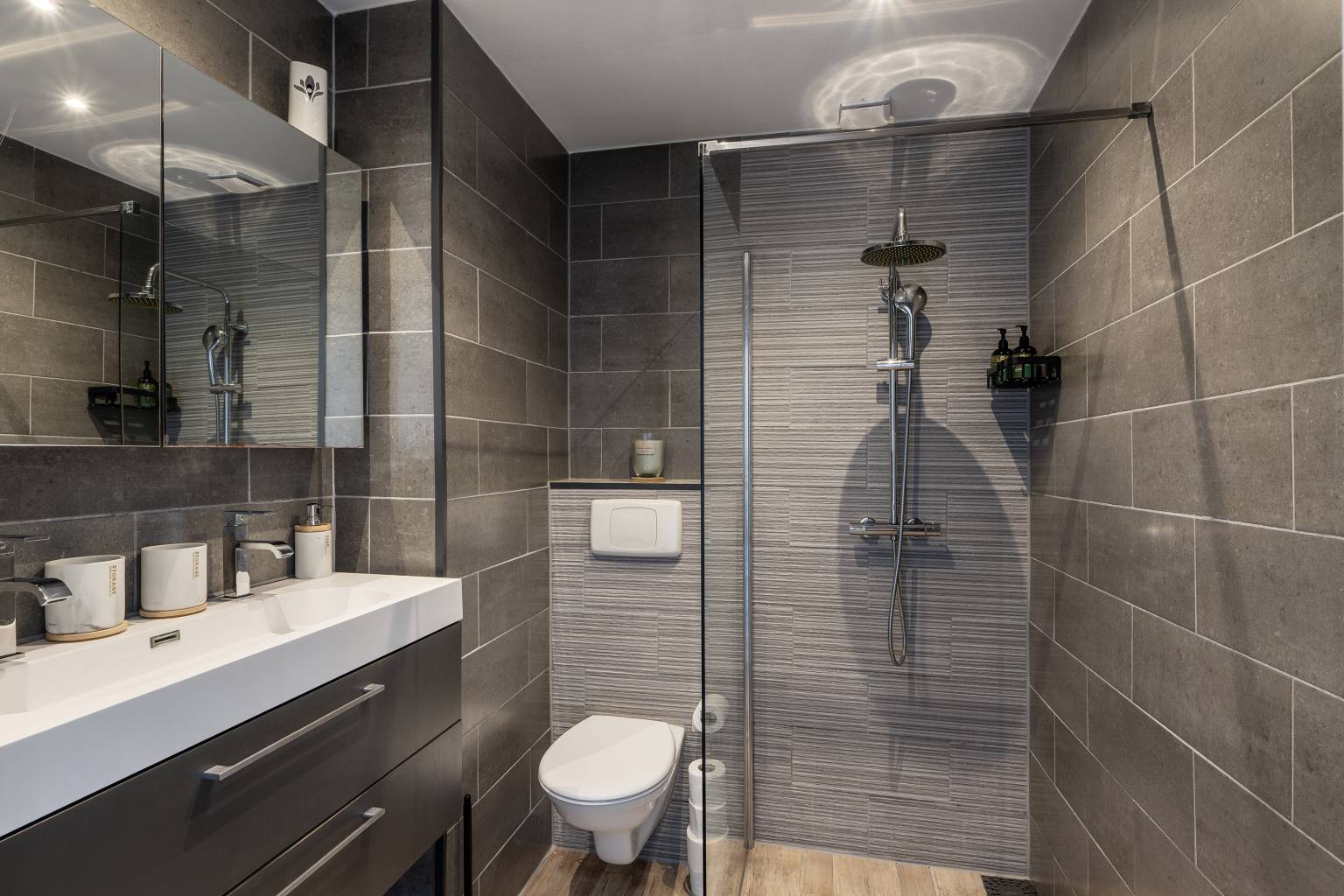 De volledig betegelde badkamer is uitgerust met een inloopdouche, een toilet en een dubbel wastafelmeubel met daarboven een spiegelkast. Daarnaast is het plafond netjes voorzien van inbouw spots.