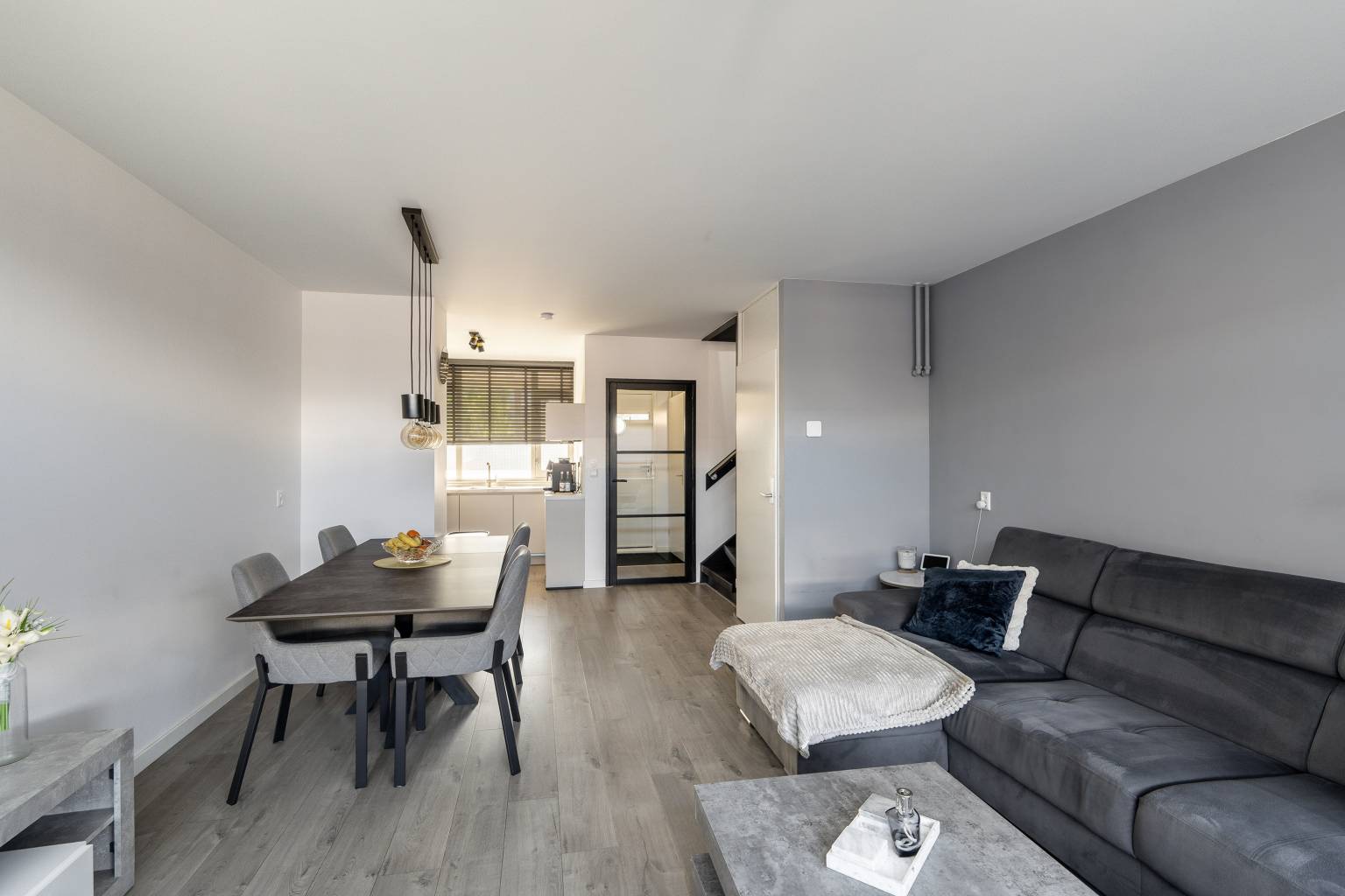 De woonkamer, met gestuukte wanden, bevindt zich aan de achterzijde en heeft ruimte voor zowel een zit- als een eethoek. Er is een deur naar het balkon, dat uitzicht biedt over de binnentuin. Naast de entreedeur bevindt zich de trap naar de verdieping, met daarnaast een trapkast. In het verlengde, aan de voorzijde is de open keuken geplaatst in een L-vorm met extra vrijstaand keukenblok met een bovenkast. Het aanrechtblad is doorgetrokken naar de achterwand en er is diverse apparatuur aanwezig, zoals een combi oven, een vaatwasser, een koelkast en een kookplaat met een geïntegreerde afzuiging.