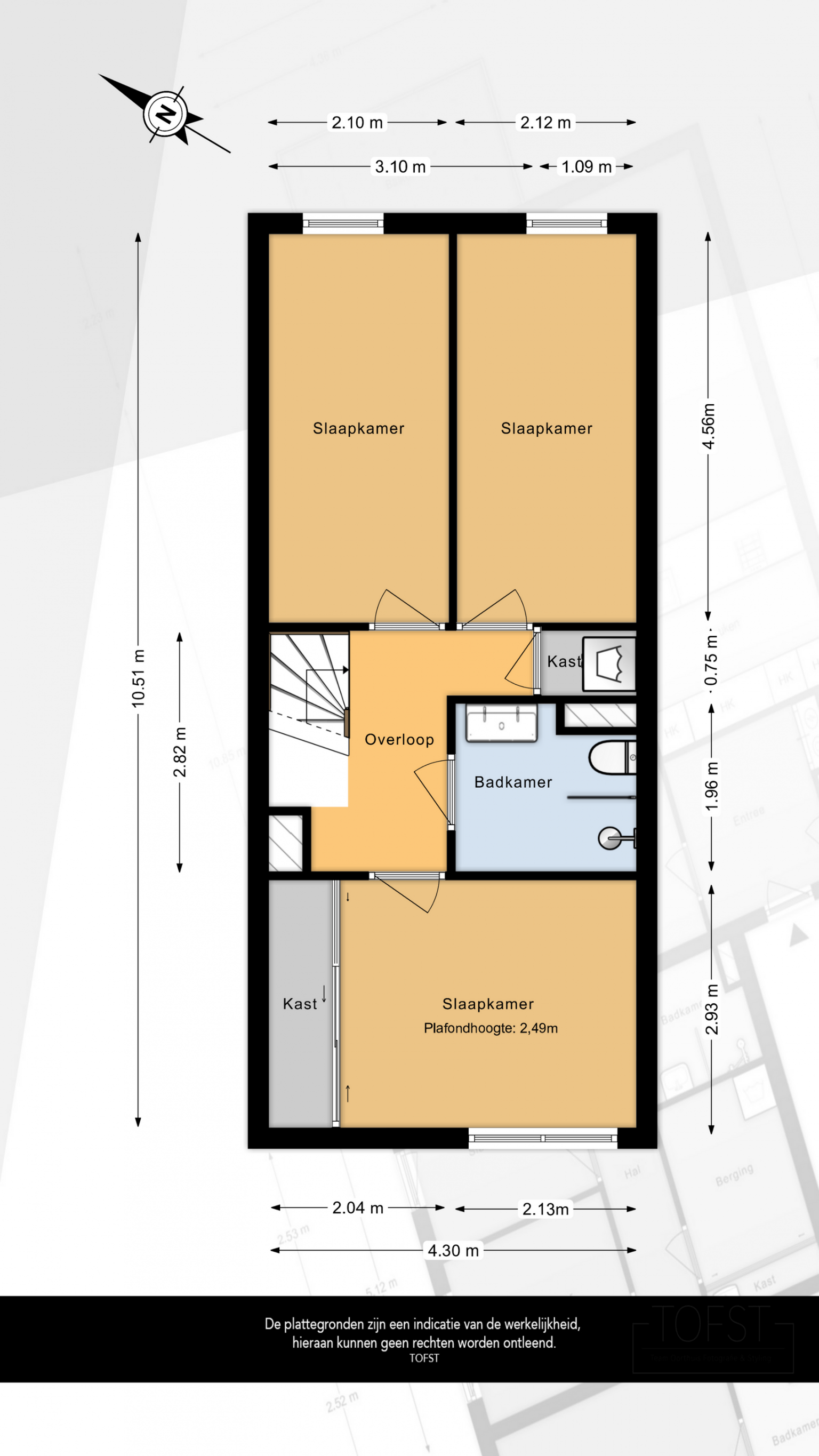 Na de trapopgang is de overloop bereikbaar. Deze geeft toegang tot drie slaapkamers, de badkamer en beschikt over een vaste kast met daarin de aansluiting voor de wasmachine. Alle wanden zijn hier gestuukt en de laminaatvloer is doorgetrokken naar alle slaapkamers.