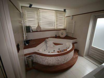 Royale overloop met laminaat dakraam en openslaande deuren naar hoofdslaapkamer van ca. 18 m2 met vaste kasten. Badkamer met 2 persoons jacuzzi, wastafel, hangend toilet en grote douche met thermostaatkraan.